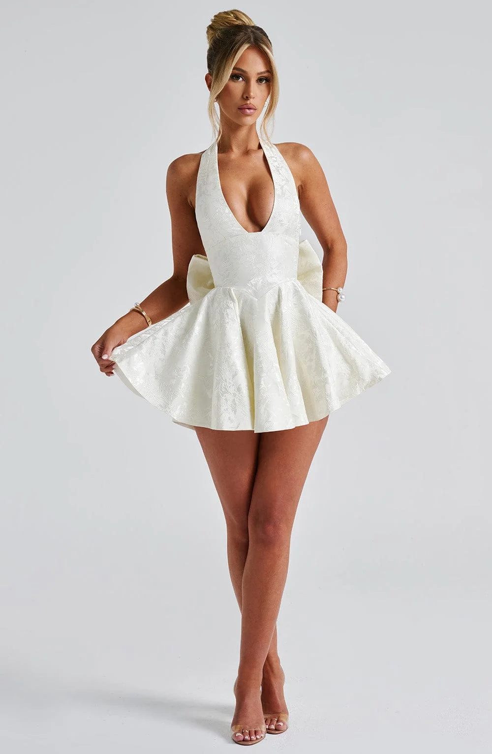Indulge in luxury with our ivory floral jacquard playsuit, featuring a plunging halter neckline, detachable bow detail, and full circle skirt for a touch of drama. Made from premium jacquard fabric, this playsuit is fully lined for comfort. Whether its a brunch with friends or an evening party, complete your look with this mini dress that exudes romance and style. Elevate your outfit with platform heels and a sleek clutch for a chic ensemble. Available sizes: XS, S, M, L, XL, XXL.