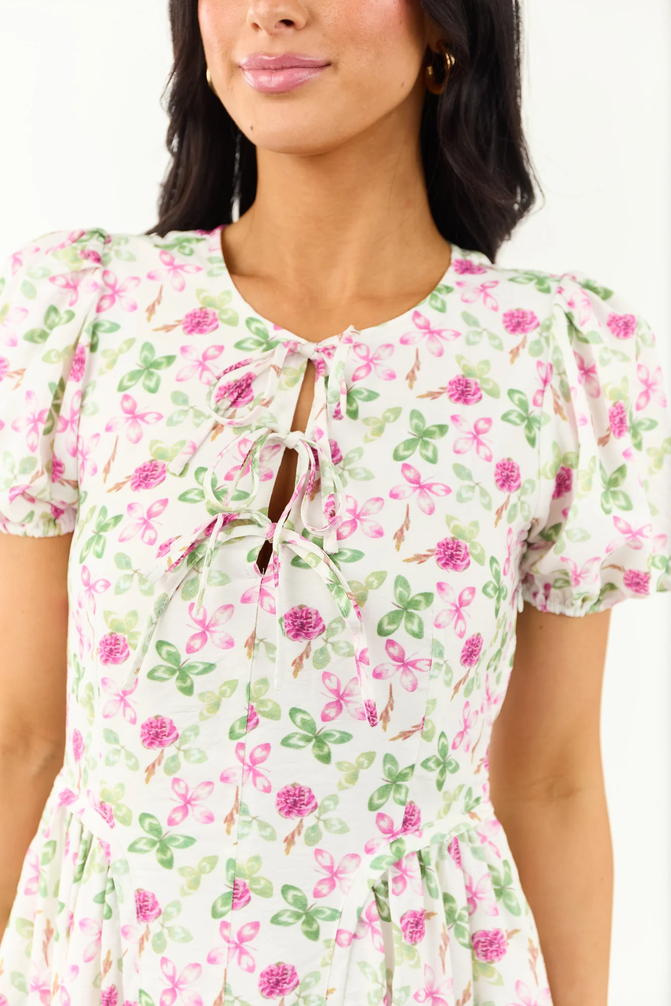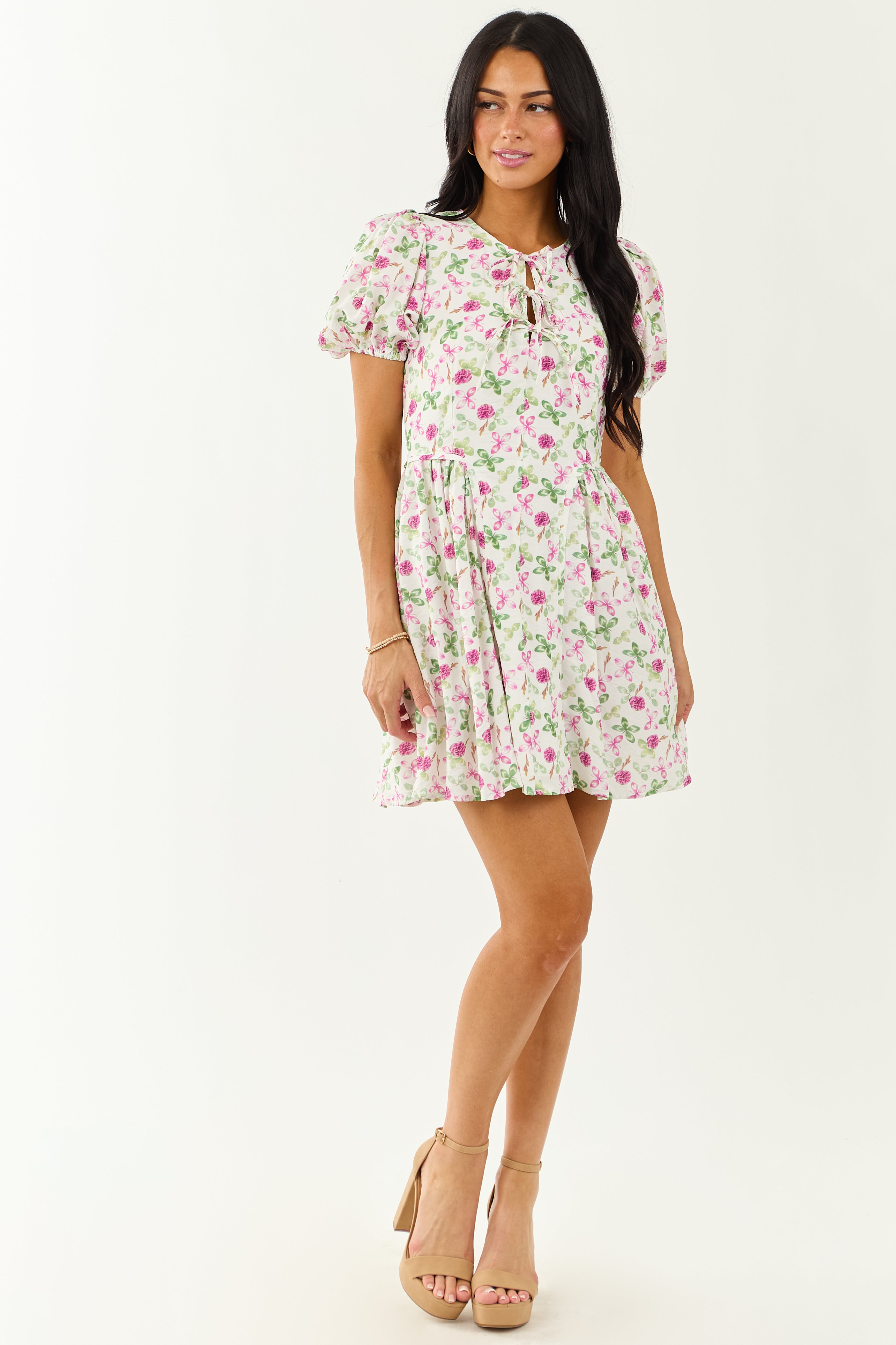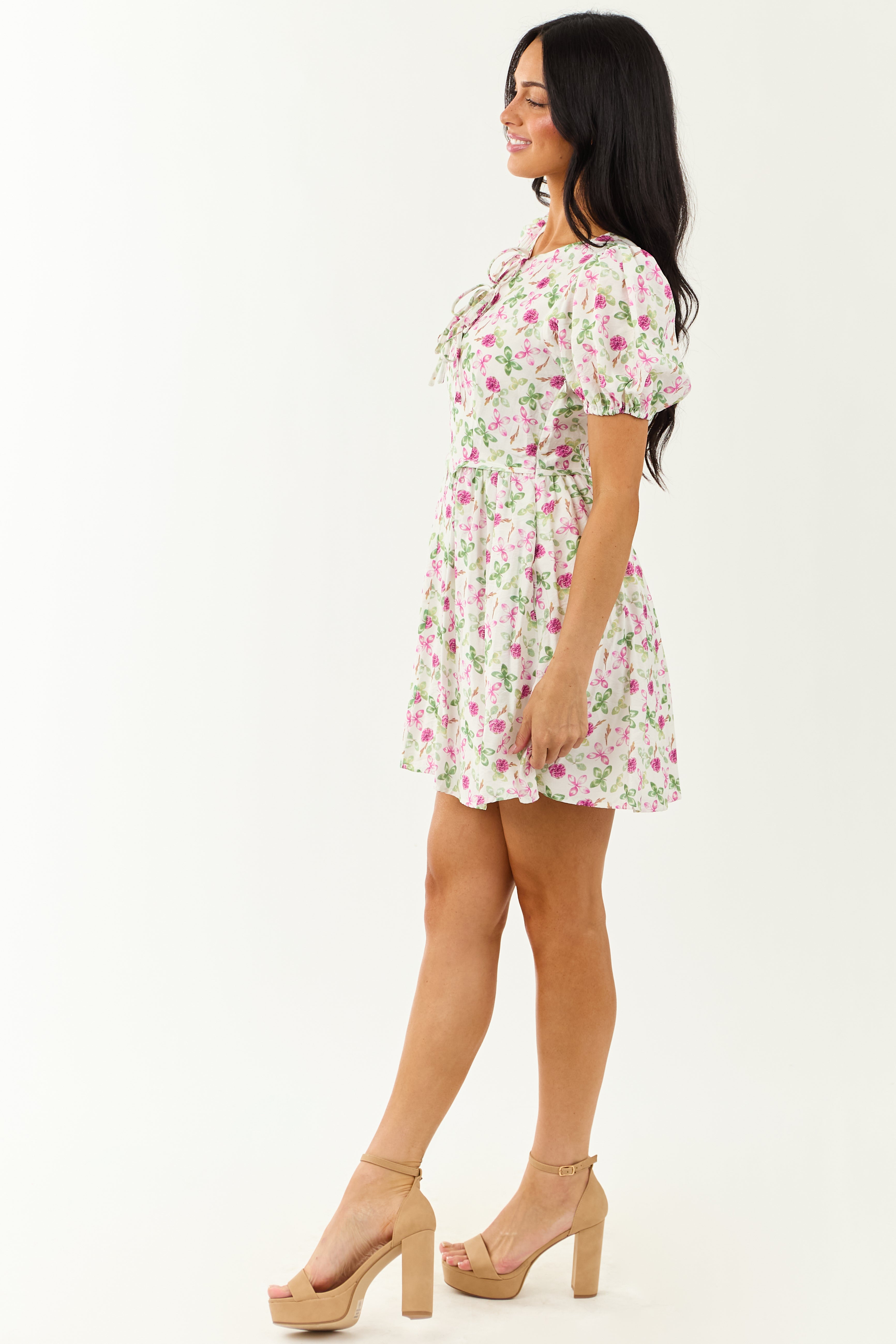 Embrace charm and romance with this colorful floral mini dress featuring a tie neckline, puff sleeves, and vintage-inspired flair. This forgiving dress fits true to size and boasts half puff sleeves, a deep notch neckline, adjustable ties, side pockets, and a hidden side zipper for convenience. Made of 100% polyester with a 95% polyester and 5% spandex lining, this dress is both stylish and comfortable. Perfect for summer in Mulberry, Jade, and Taupe shades. Model is wearing a size Small. Dress measurements for size small: Bust 34″, Waist 28″, Length 33″.