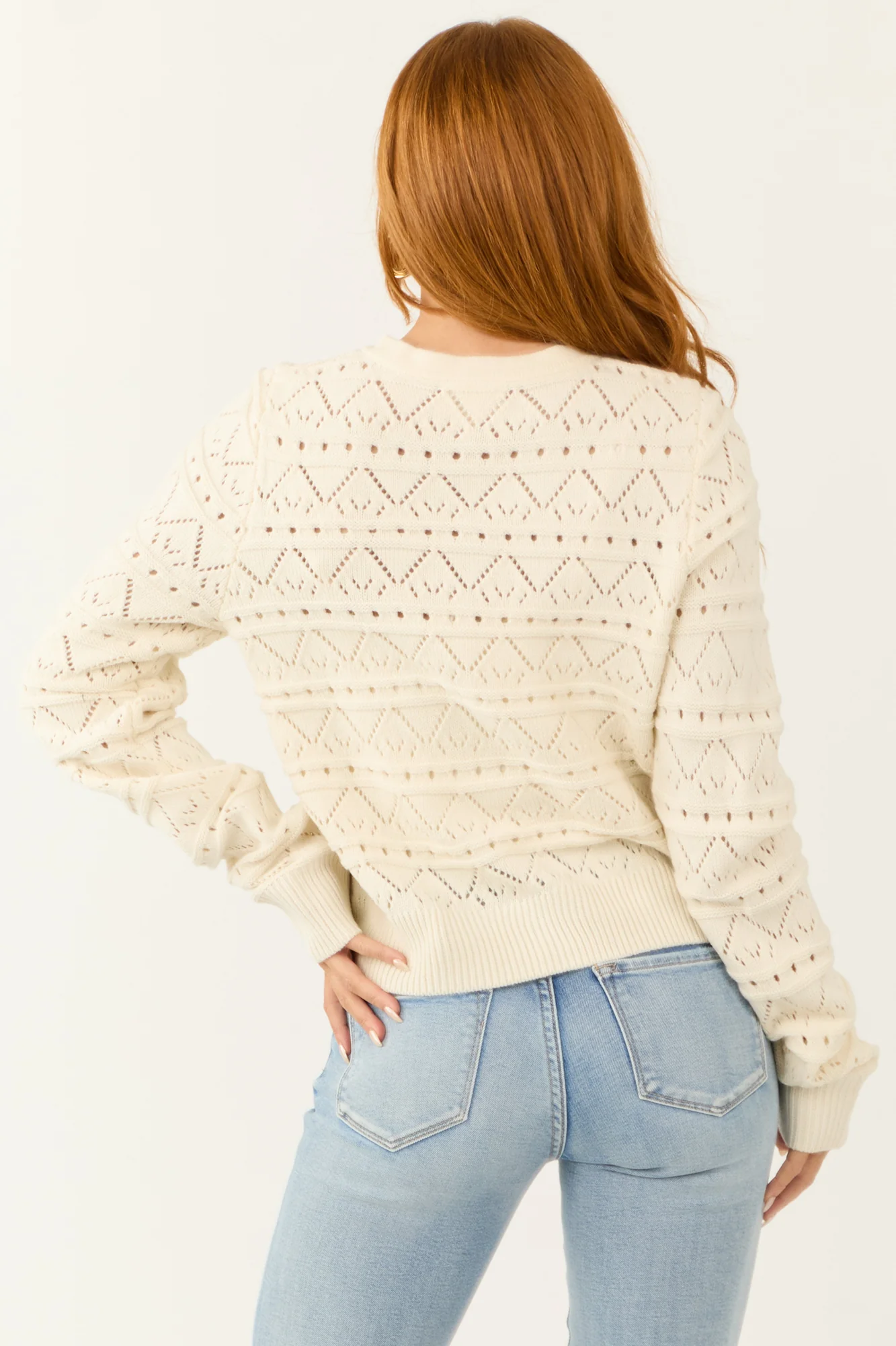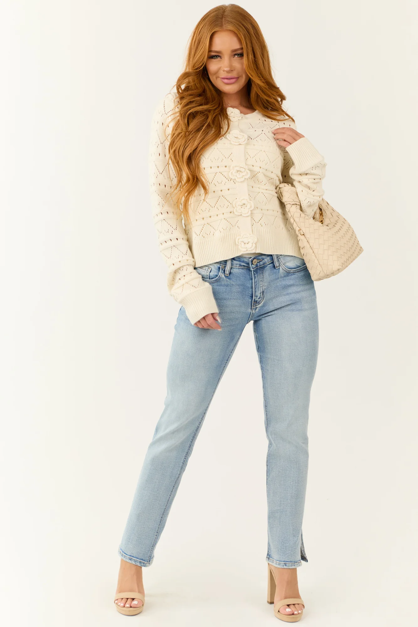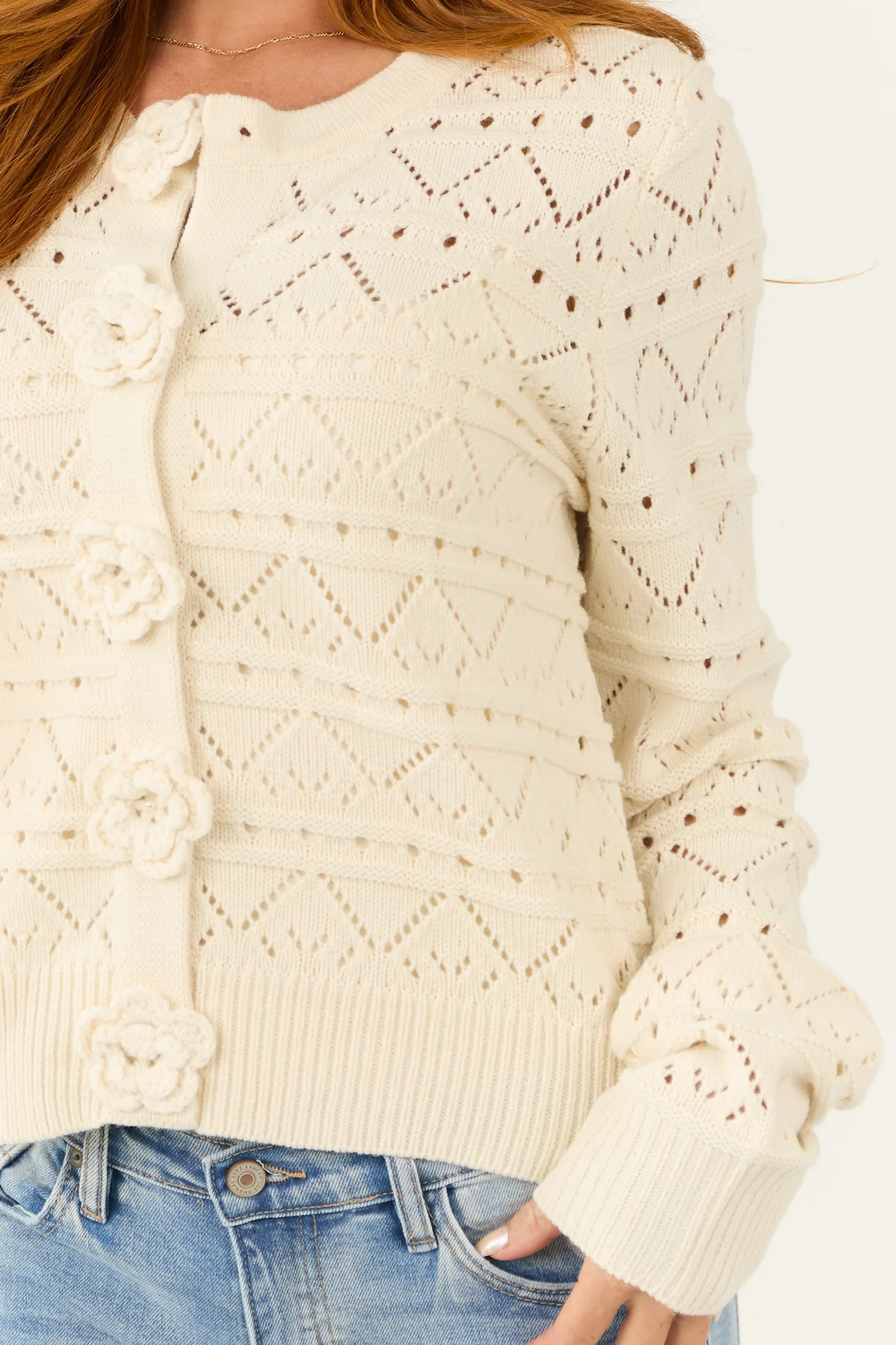 Indulge in the timeless charm of our Ivory Knit Button-Up Cardigan. Crafted from stretchy pointelle knit, this cozy semi-cropped layer features delicate pearl flower button details, ribbed banded trim, and unlined comfort. Made of 100% Acrylic. Ideal for casual and daytime wear in fall and winter seasons. Available in sizes S, M, L. Hand wash cold, line dry, iron low. Model is wearing size Small. Size Guide: Height 55″, Bust 33″, Waist 24″. Elevate your style effortlessly with this chic cardigan.