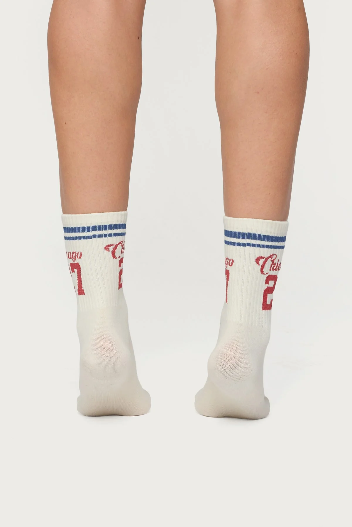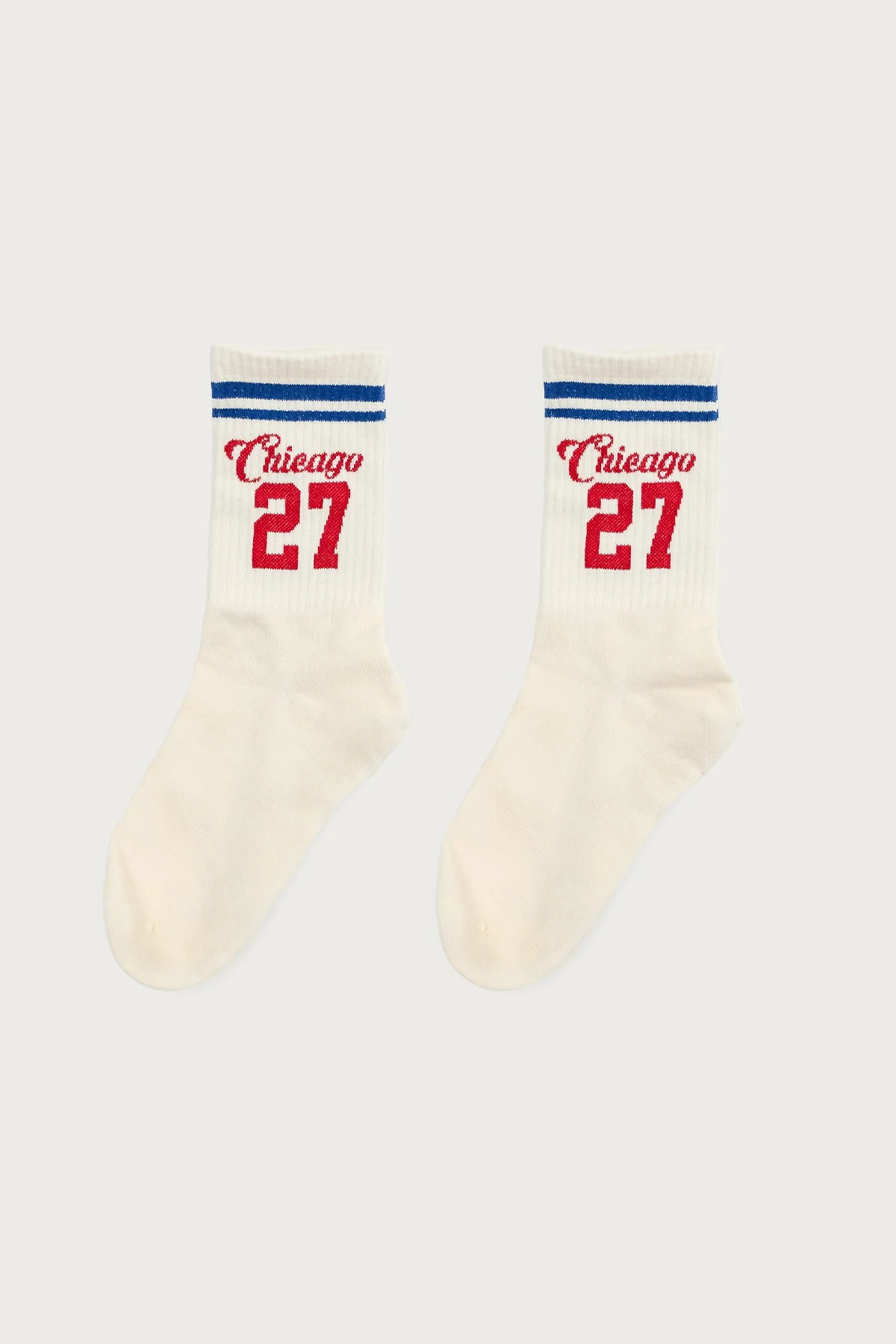 Discover the comfort and style of our Ivory Knit Text Socks inspired by Chicago 27. Made with a blend of Cotton, Polyester, and Spandex for a perfect fit. These socks measure 11 inches in length and are easy to care for — machine wash, tumble dry, and iron with ease. Elevate your sock game with these trendy, high-quality essentials.