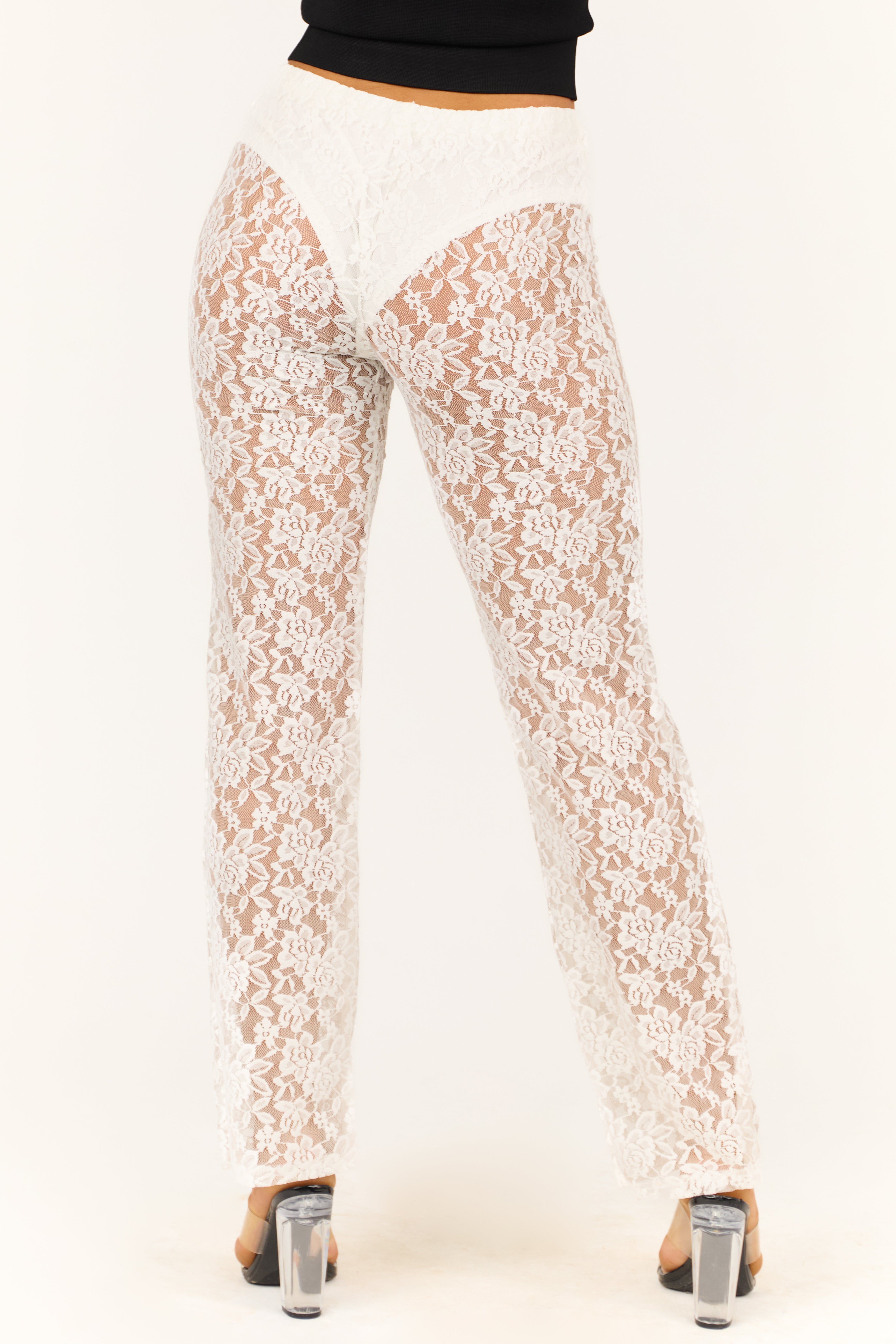 These Ivory Lace High Waist Straight Leg Pants feature a semi-stretchy lace construction with an elastic waistband for comfort and style. The pants come with underwear lining for modesty and are made of 95% Polyester and 5% Spandex for a luxurious feel. Perfect for casual wear or dressing up for special occasions. Machine wash cold for easy care. Available in sizes S, M, and L. Model is wearing a size Small. Achieve a chic look with these elegant lace pants!