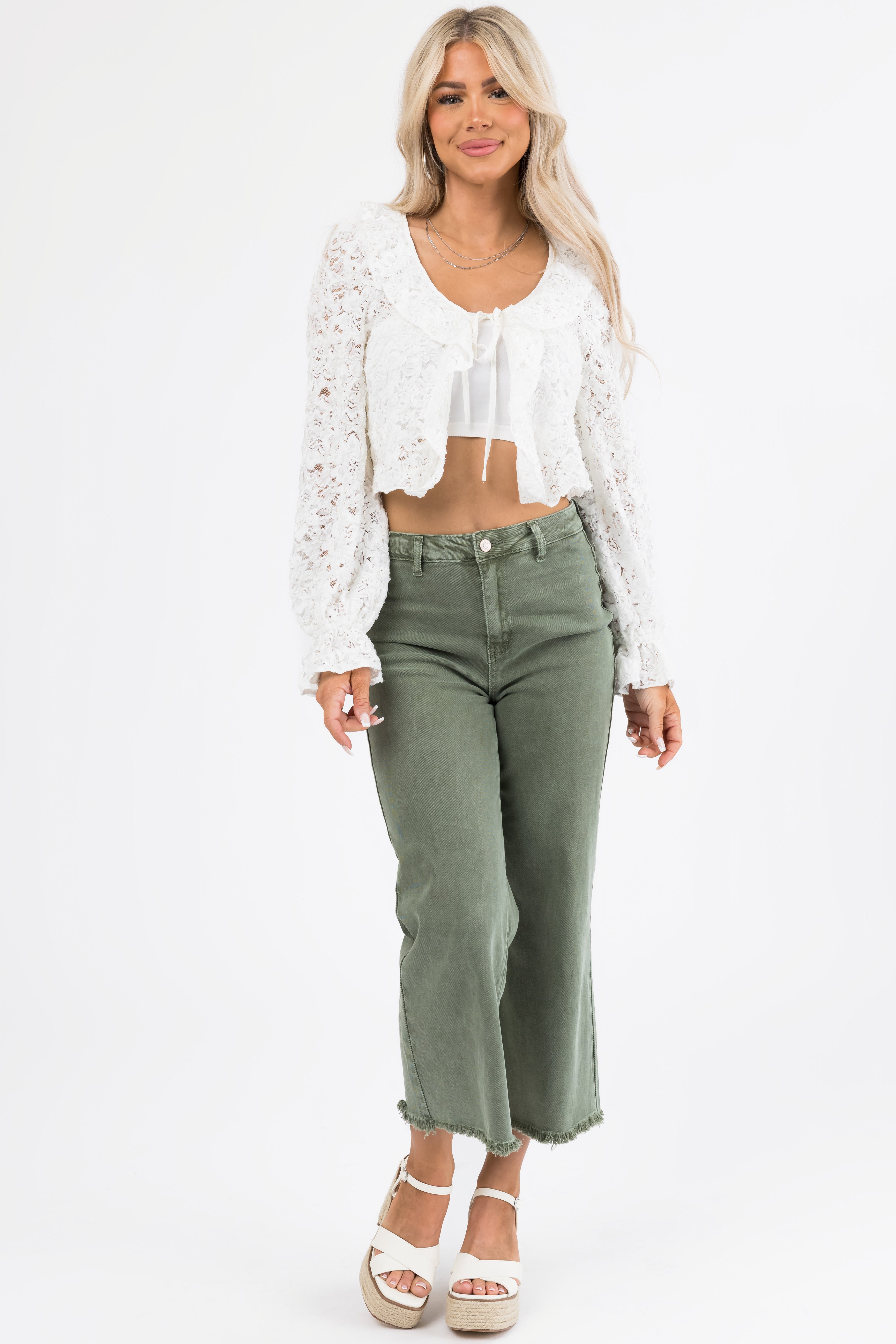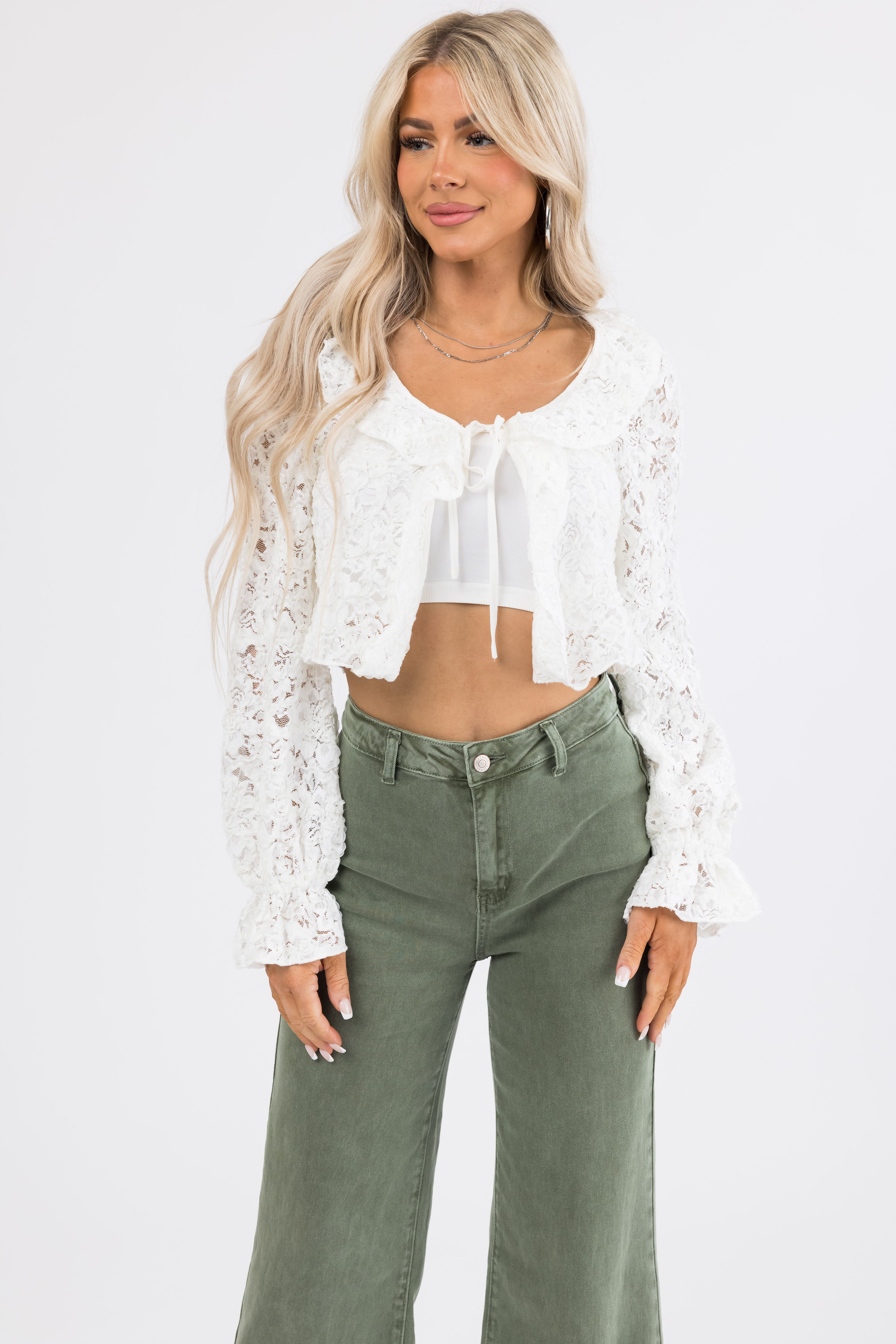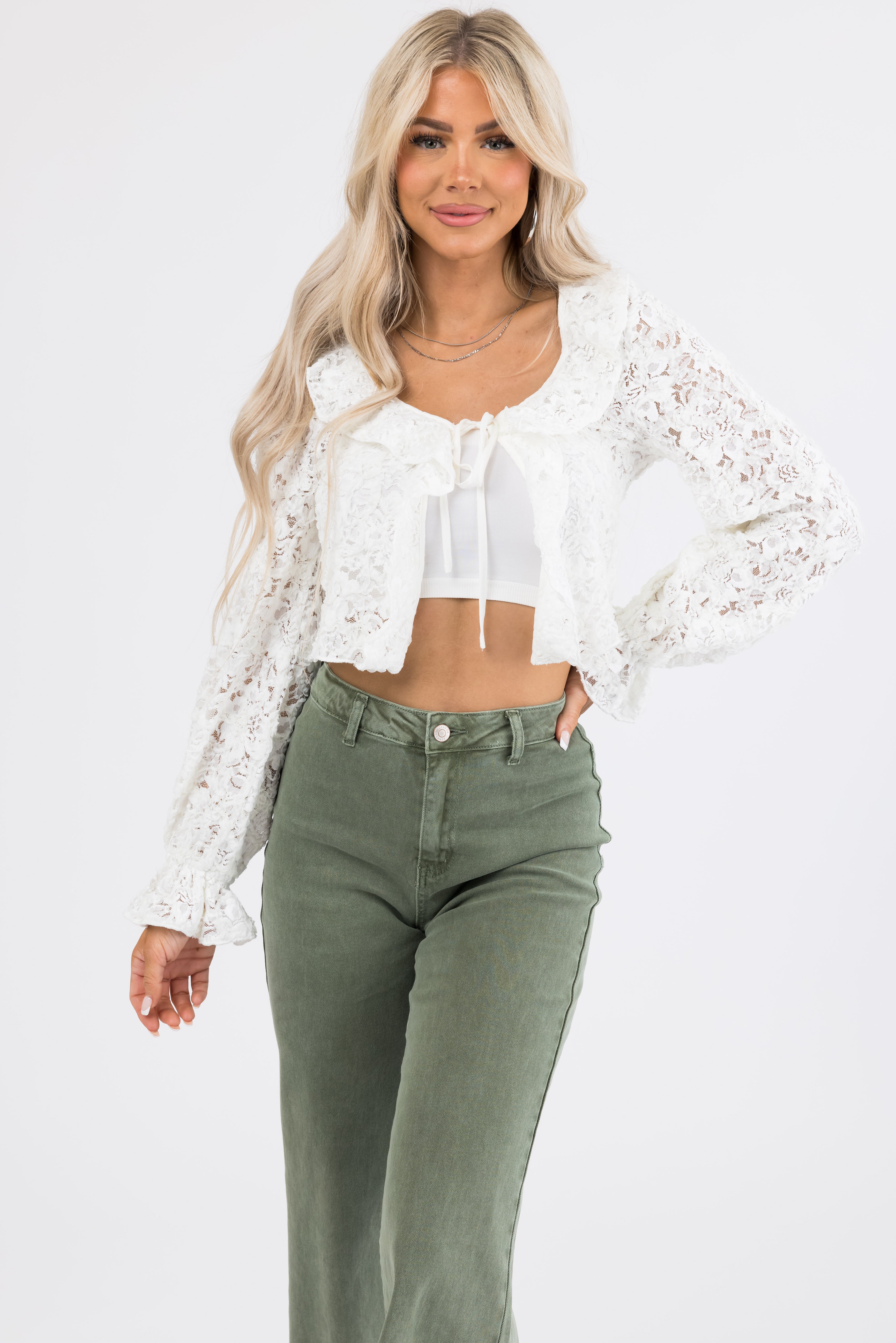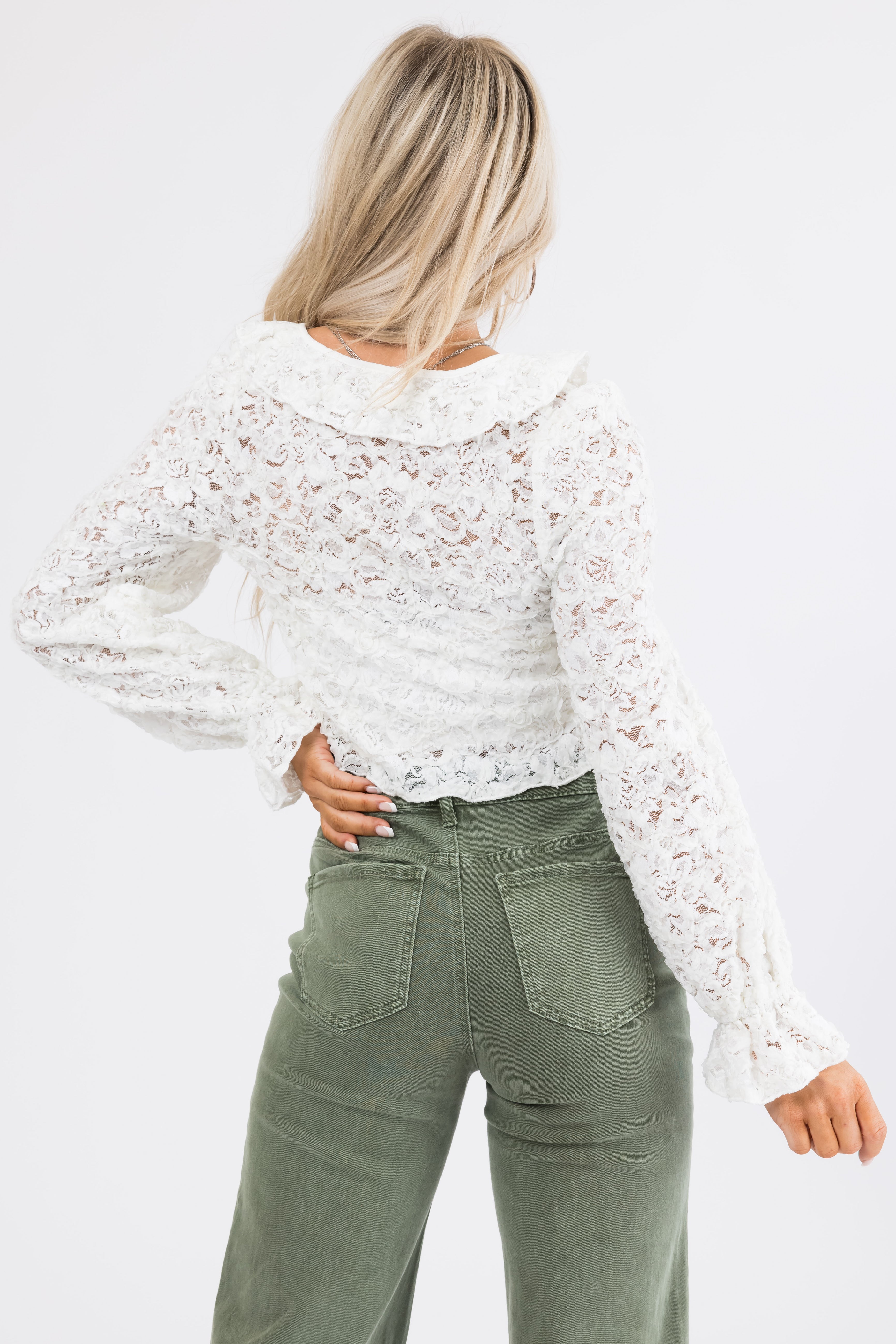 Indulge in elegant comfort with our Ivory Lace Ruffle Top. Crafted from non-stretchy lace, this top features long bubble sleeves, a deep v neckline, and a ruffled trim for a sophisticated look. The tied bust adds versatility, allowing for extra room and a personalized fit. Perfect for various occasions, this top is unlined and offers an open front option. Carefully designed in XS, S, M, and L sizes to fit perfectly. Hand wash cold and lay flat to dry for lasting quality.