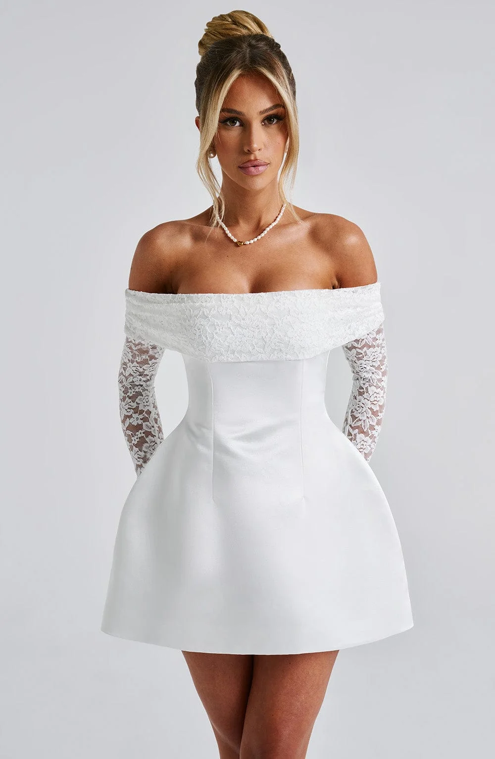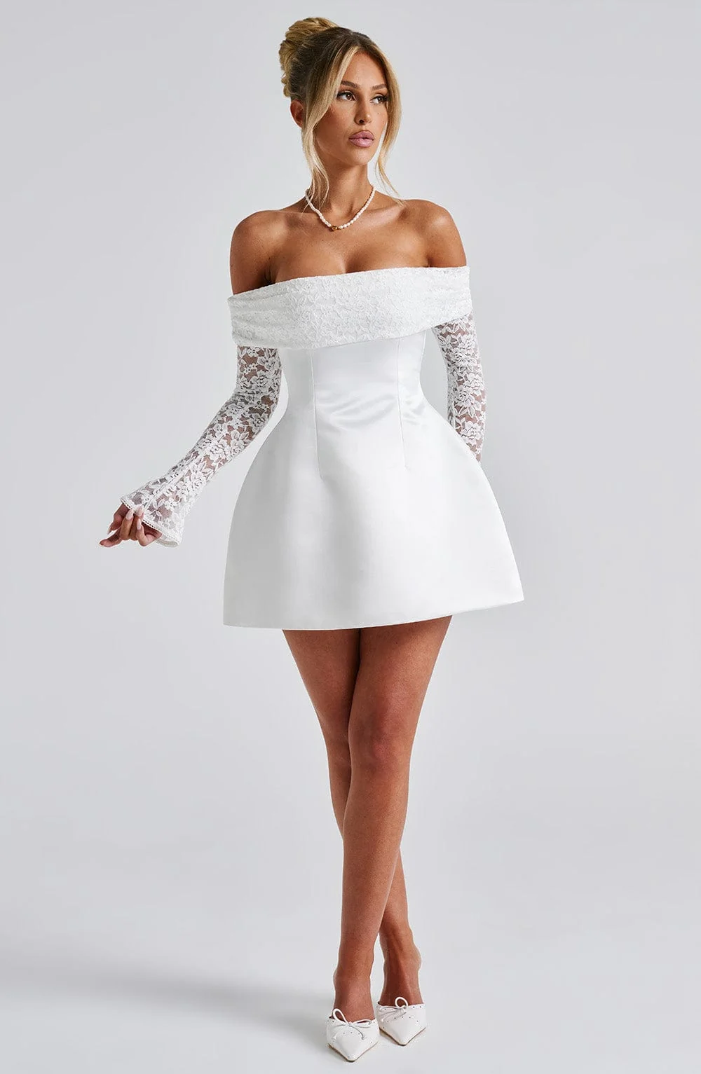 Indulge in the elegance of our Ivory Lace Sleeve Mini Dress featuring a flattering bubble hem skirt, cinched waist, and luxurious stretch floral lace sleeves. Made from premium non-stretch satin with a fold-over bardot neckline, this dress exudes sophistication. Ideal for various occasions such as birthdays, parties, and evenings out, this mini dress with its invisible zipper fastening ensures a perfect fit and effortless style that will surely make heads turn. Elevate your wardrobe with this beautiful dress in ivory.