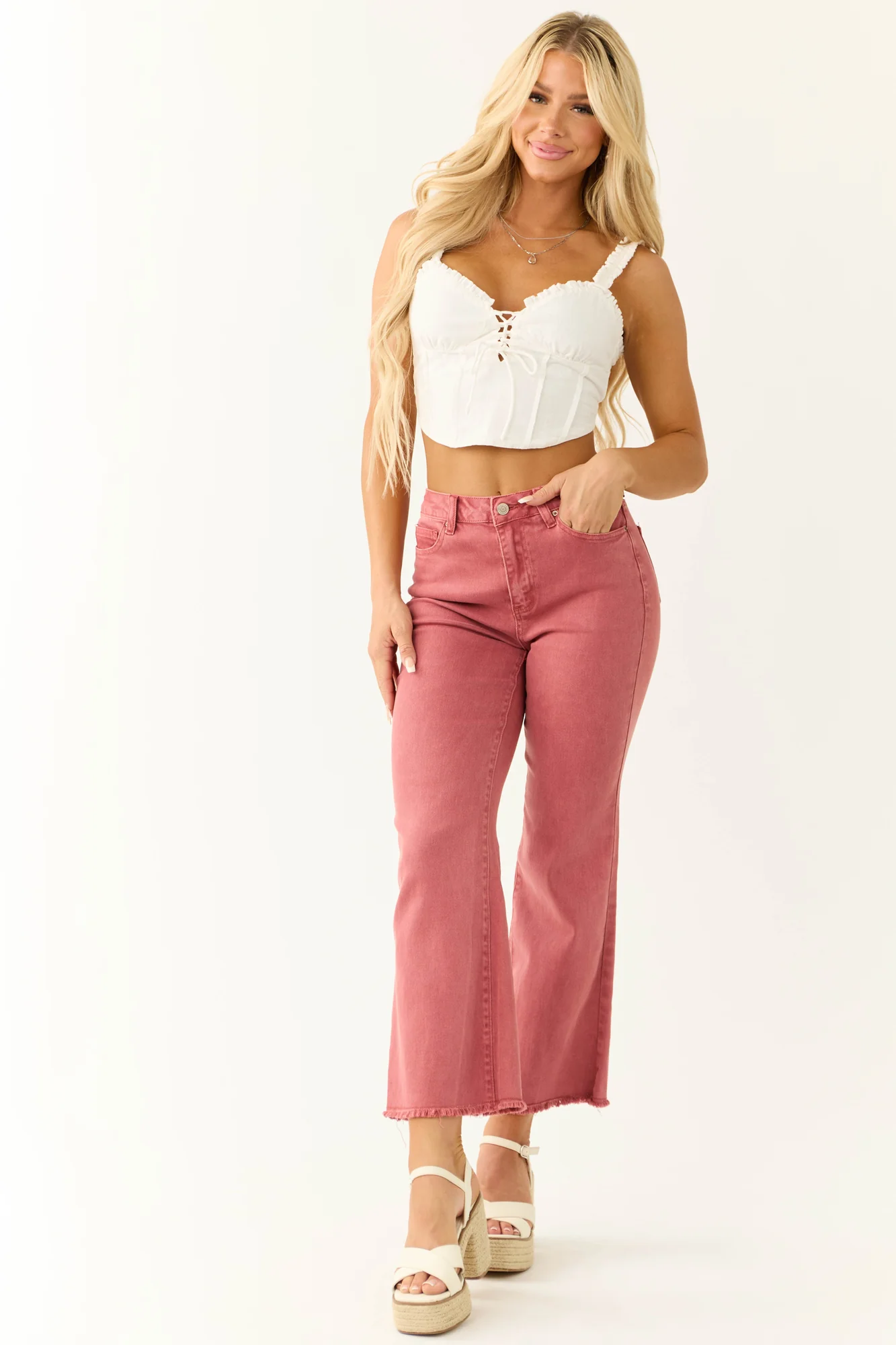 Elevate your style with our Ivory Lace Up Corset Tank Top. Available in sizes S, M, and L with non-stretchy woven fabric for a flattering fit. Adjustable straps and frill details on the neckline add a touch of elegance. This sweetheart neckline top features seam details and a cropped length for a chic look. Bust lining ensures comfort. Crafted from 100% Cotton and imported for quality. Care instructions: Hand wash cold, do not bleach, low iron if needed, line dry. Model is wearing a size Small. Model #1 Profile: Size 1, Height 57″, Bust 34″, Waist 26″. Model #2 Profile: Size 1, Height 55″, Bust 31″, Waist 24″.