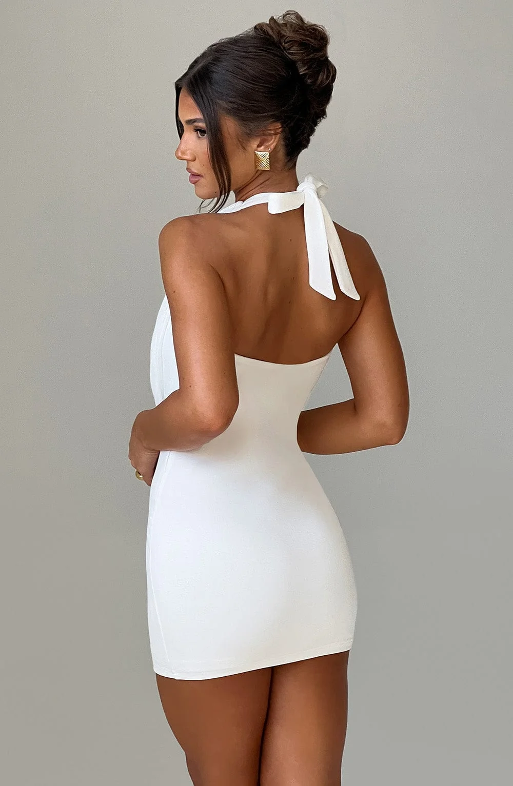 Indulge in the allure of the Ivory Mesh Mini Halter Dress, designed to hug your curves flawlessly. Crafted from premium double-layered mesh, this dress features a captivating low plunge halter neckline, boned cups for enhanced support, and a charming cowl overlay detail. Complete with a back tie closure, invisible side zipper, and a mini length for a sophisticated look. Elevate your style with white thong mule heels and a chic mini bag. Color: Ivory. Fabric: Double Layered Mesh. Fully Lined for Comfort. Perfect for parties, nights out, and special events. Available in sizes XS to XXL.