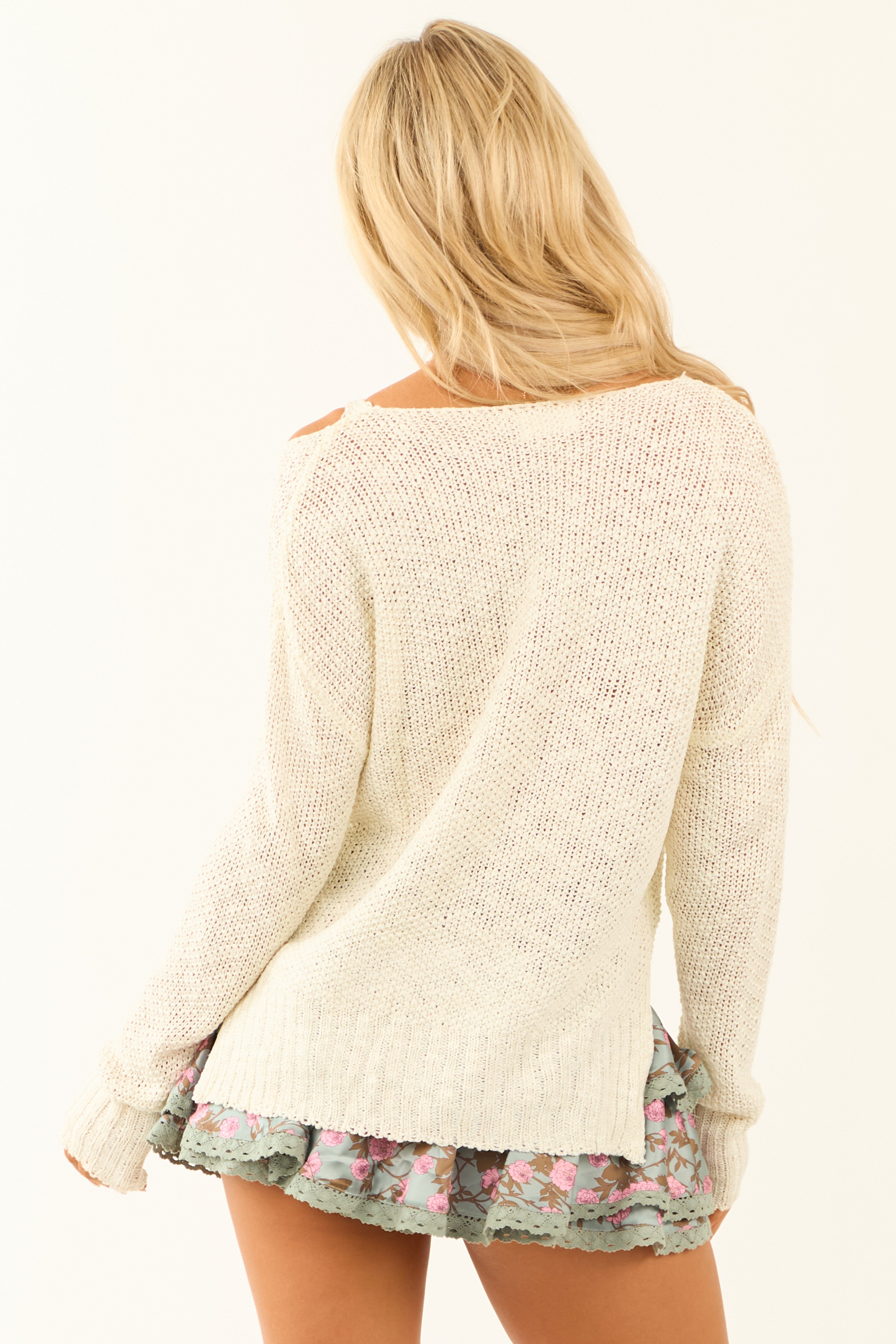 Stay cozy yet stylish with our Ivory Open Knit Cold Shoulder Sweater. Crafted from a blend of 90% Acrylic and 10% Polyester, this semi-stretchy sweater features long sleeves, drop shoulders, a chic V neckline, ribbed banded trim, side hem slits, and an unlined design. Perfect for spring and summer, this sweater is a versatile addition to your wardrobe. Follow care instructions for optimal maintenance. Available in S/M and M/L sizes.