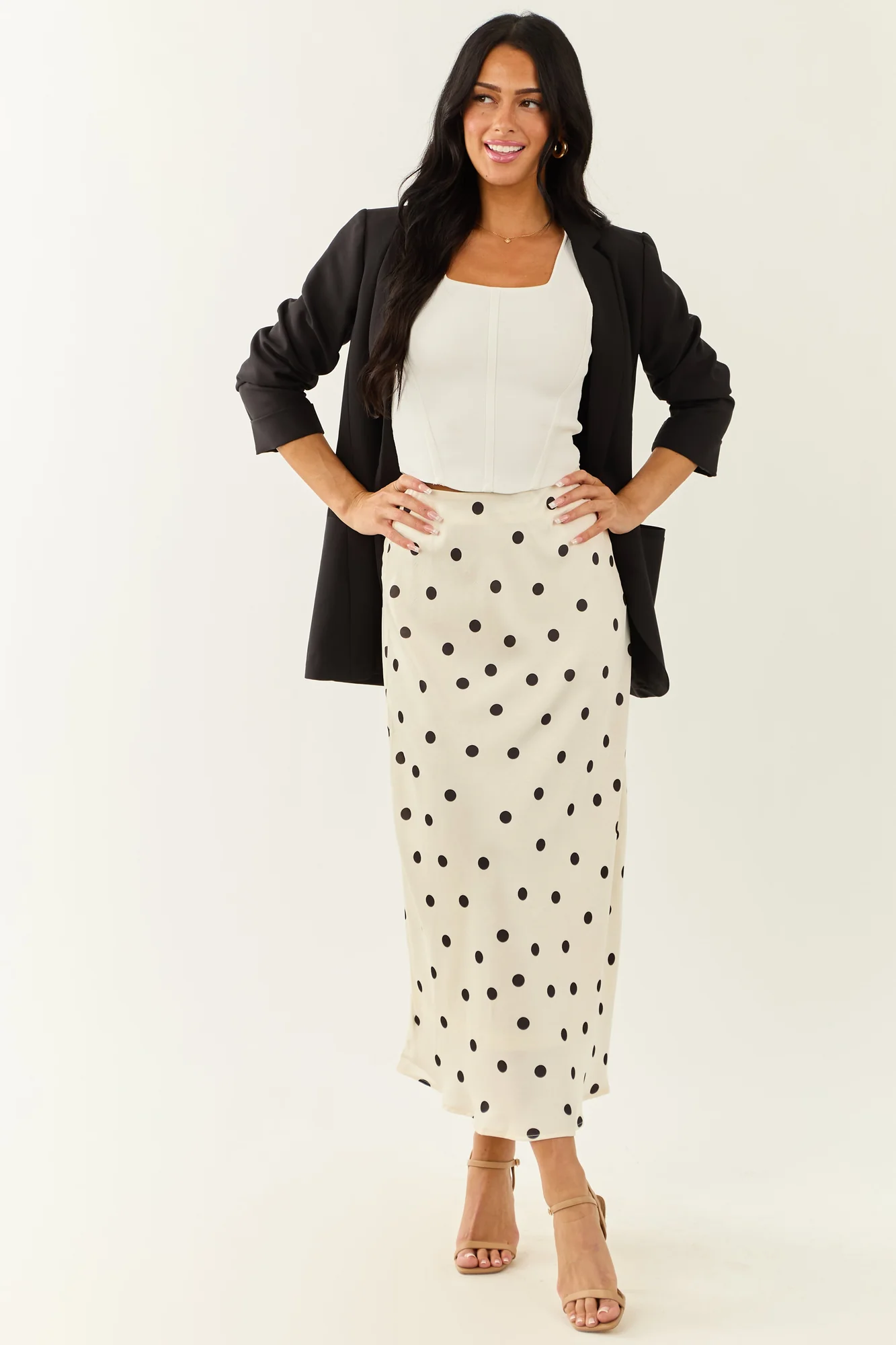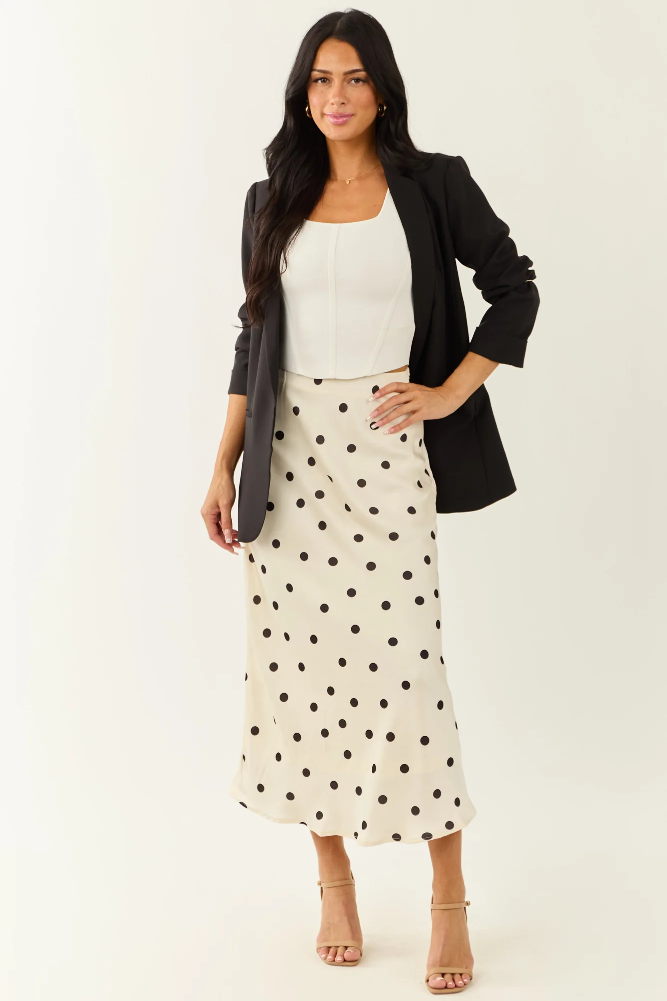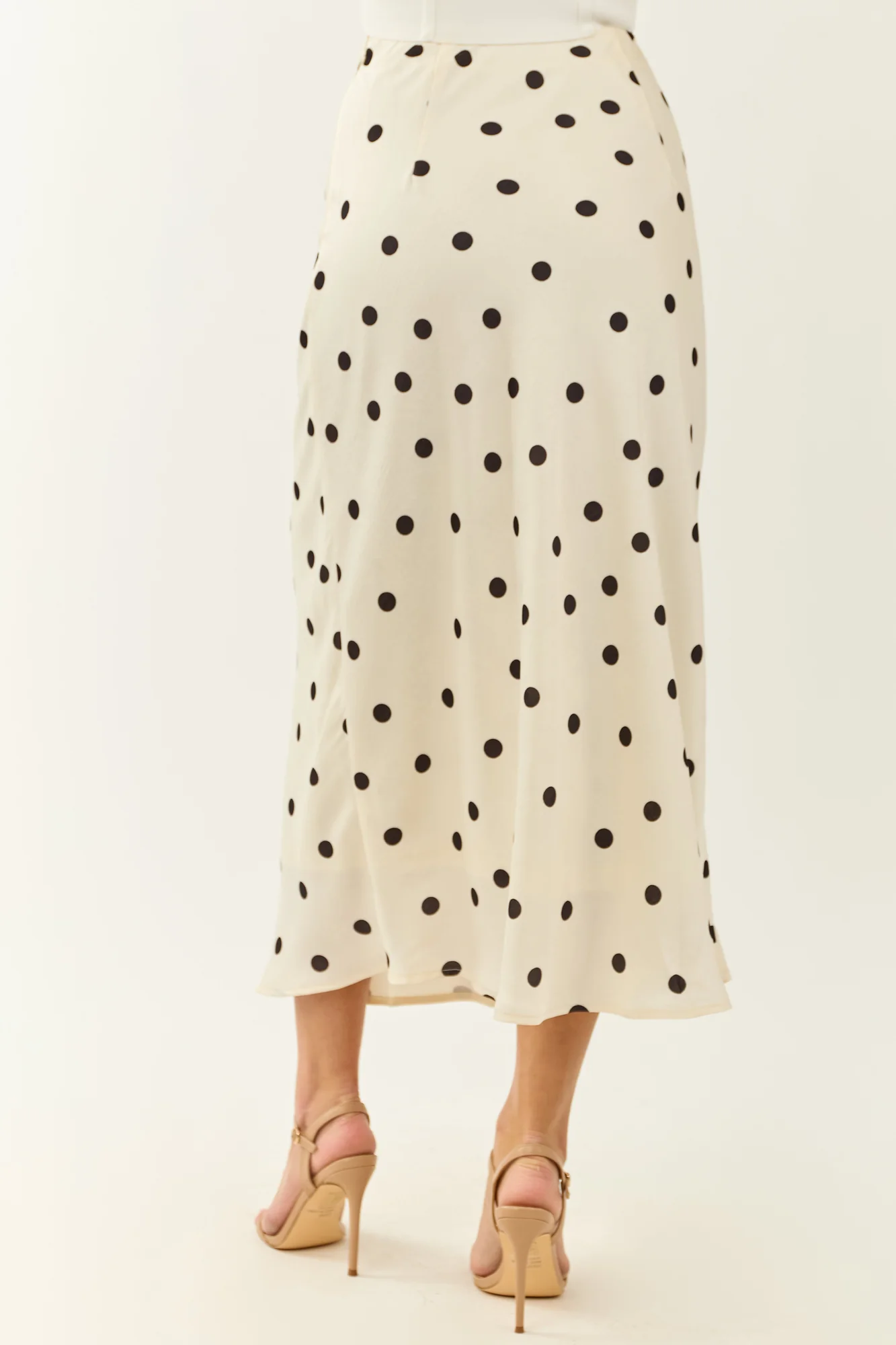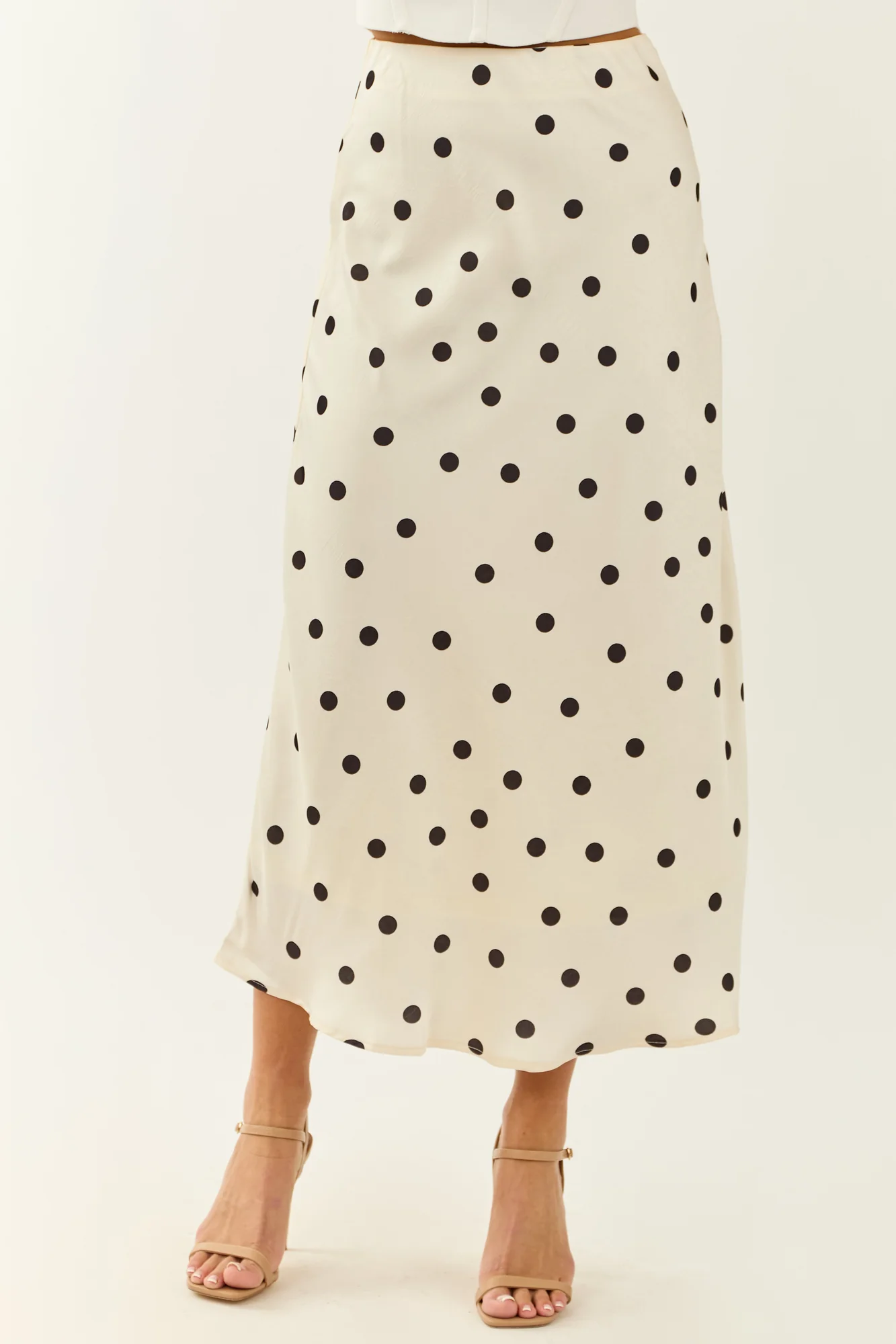 Embrace the timeless elegance of polka dots with our Ivory Polka Dot Satin Vintage Midi Skirt. Crafted from non-stretchy satin with a slightly stretchy waistband, this skirt features classic black polka dots for a touch of retro charm. The hidden side zipper ensures a seamless fit, while the stretchy lining guarantees comfort. Perfect for vintage lovers and fashion enthusiasts alike, this skirt is a must-have for your wardrobe. Please note that due to the unique cutting and sewing process, each piece may vary slightly in polka dot placement.