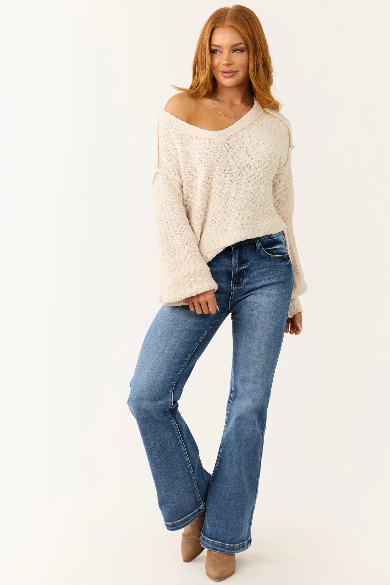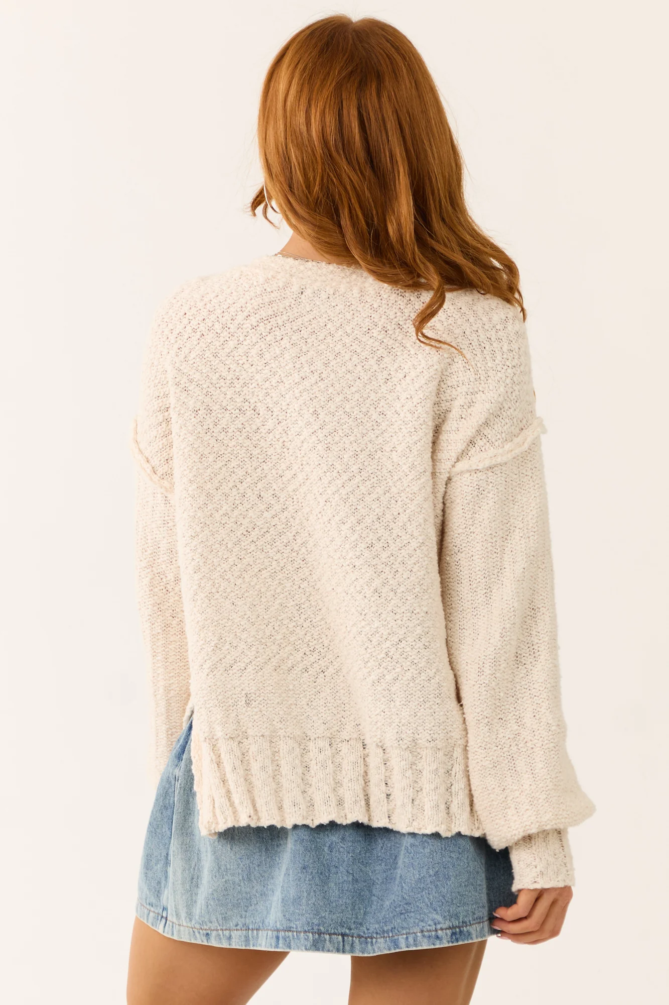 Indulge in comfort and style with our Ivory Ribbed Knit V-Neck Sweater. Crafted from super stretchy knit, this sweater features long balloon sleeves, a wide V neckline, drop shoulder design, and a banded pleated hemline with a side slit. The oversized fit adds a trendy touch while maintaining a chic look. Perfect for casual outings or cozy nights in. Care: Hand wash cold, hang dry. Available in sizes S, M, and L. Model is wearing a size Small. Versatile and chic, this sweater is a wardrobe essential for a fashionable everyday look.
