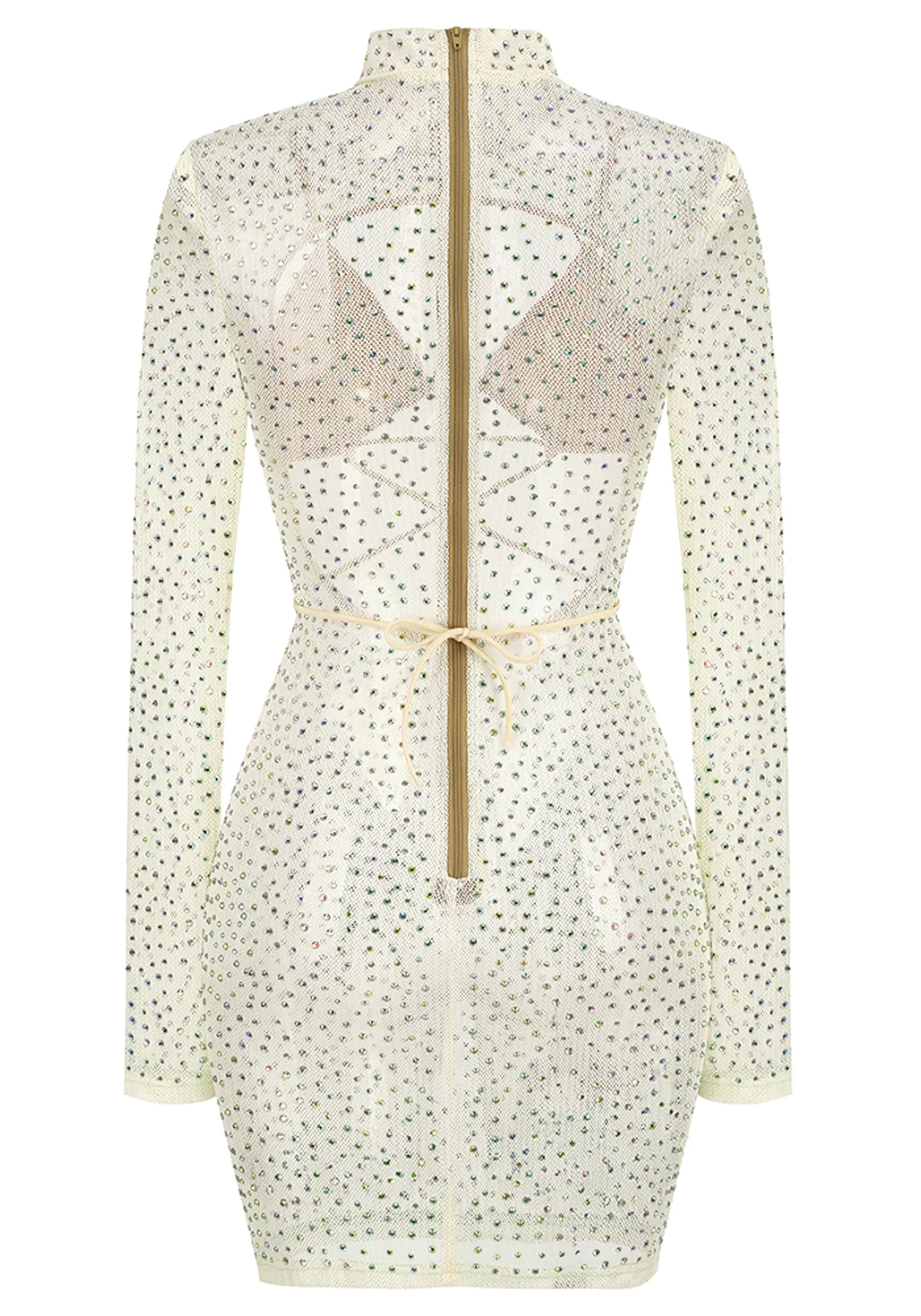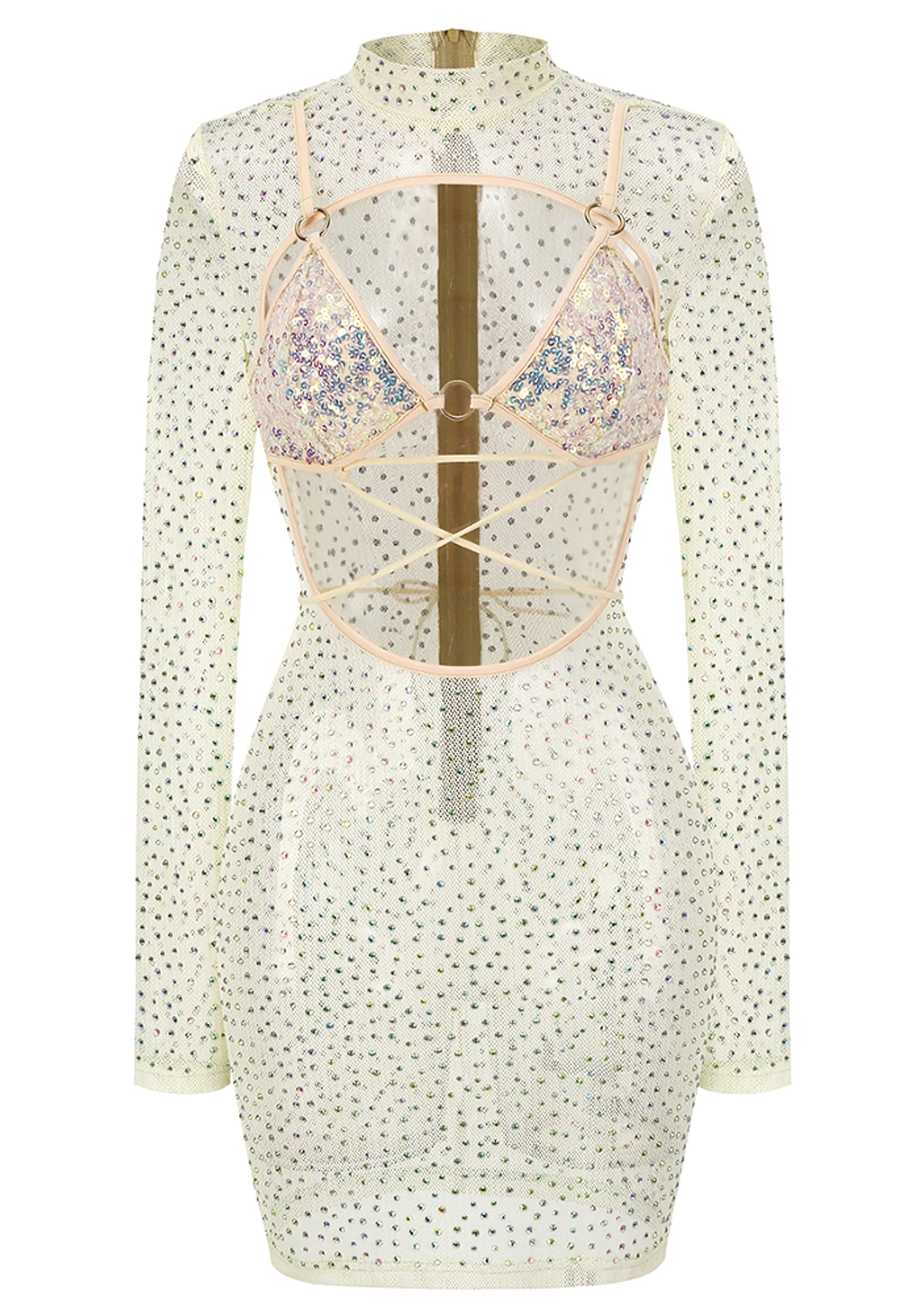 This exquisite Ivory Sequin Crystal Mini Dress is a stunning piece that features a mock neck, long sleeves, cut-out detail, sequined mesh insert, spaghetti straps, and rhinestone embellishments. Perfect for special occasions, this mini dress has a concealed zipper at the back for easy wear. Illuminate any event in style with this dazzling dress that exudes elegance and charm. Note: Gentle dry clean only. Color may vary due to lighting. Find your perfect fit in our size chart. Please do not size up or down.