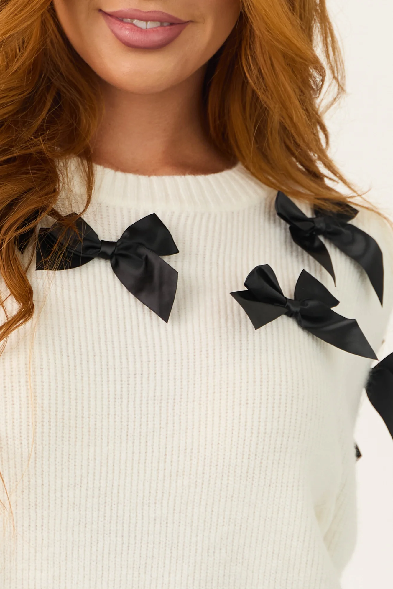 Indulge in unparalleled comfort with our Ivory Short Puff Sleeve Ribbed Knit Sweater. Available in sizes S, M, and L, with sleeve lengths of 11″, 11.5″, and 12″, respectively. Featuring delicate black satin bows, banded trim, and a stretchy ribbed knit construction for a perfect fit. Crafted from 45% Acrylic, 26% Nylon, and 29% Polyester blend. This sweater is a versatile addition to your wardrobe. Enjoy easy care maintenance by hand washing cold and hanging dry.