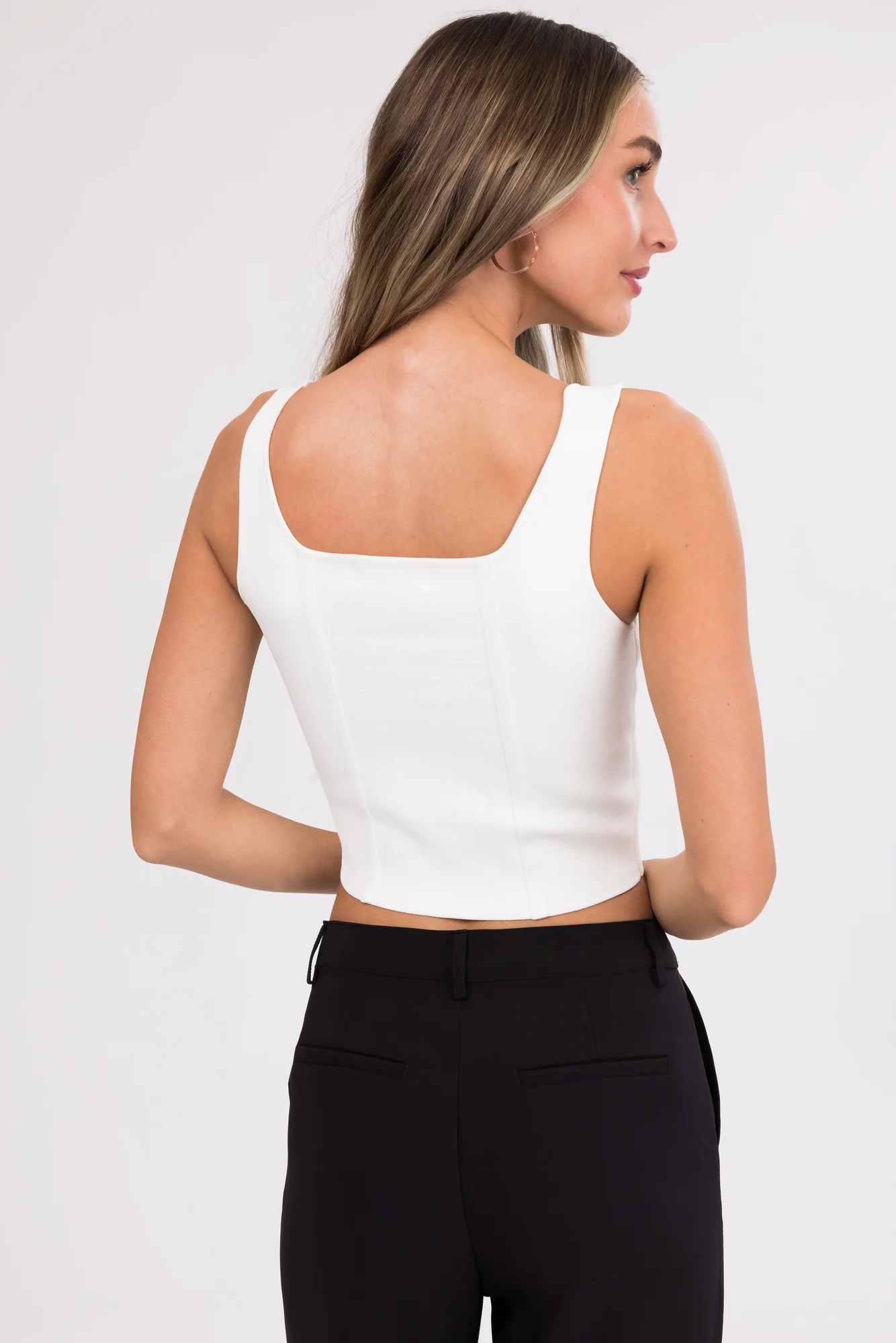 Discover the elegant Ivory Sleeveless Square Neck Crop Tank Top . This stylish top features a semi-stretchy thick spandex weave knit with seam details, a curved hemline, and a cropped design. Made of 77% Viscose, 20% Nylon, and 3% Spandex, it offers comfort and style. Available in sizes Small, Medium, and Large. Perfect for casual or daytime wear during spring and summer seasons. To care for this top, hand wash with cold water, line dry, and iron on low heat. Model is wearing a size Small with measurements Bust: 32, Waist: 25, Height: 58.