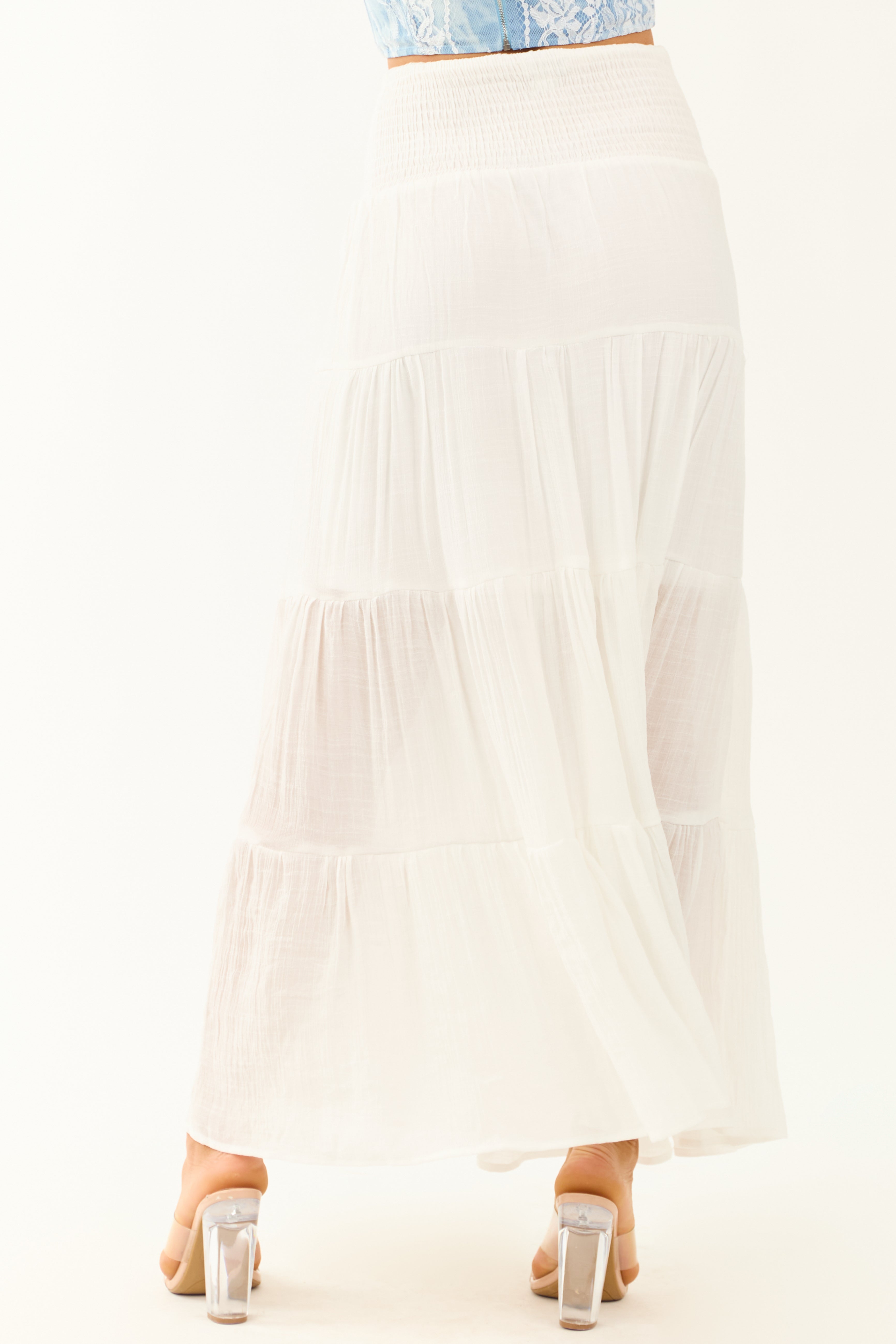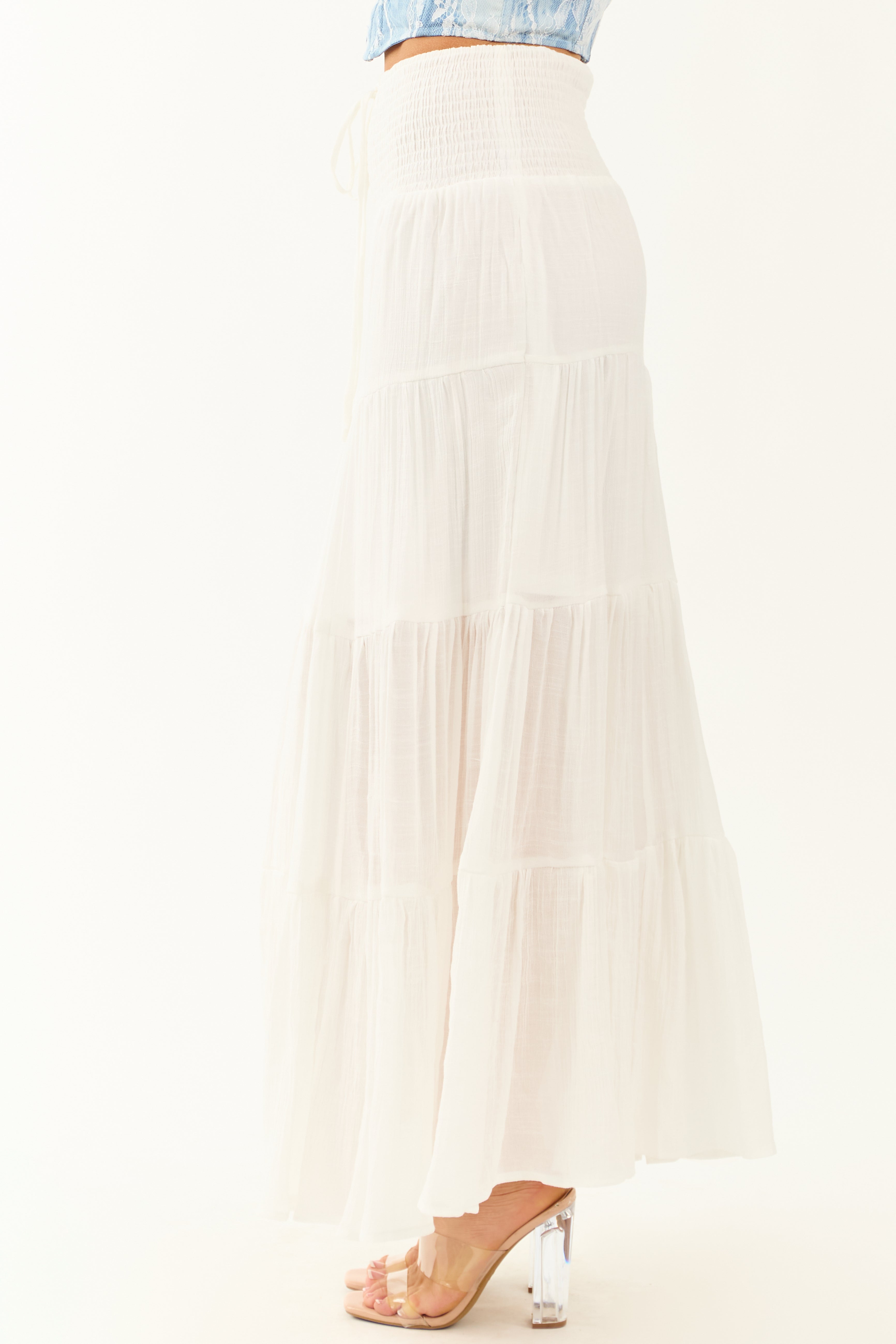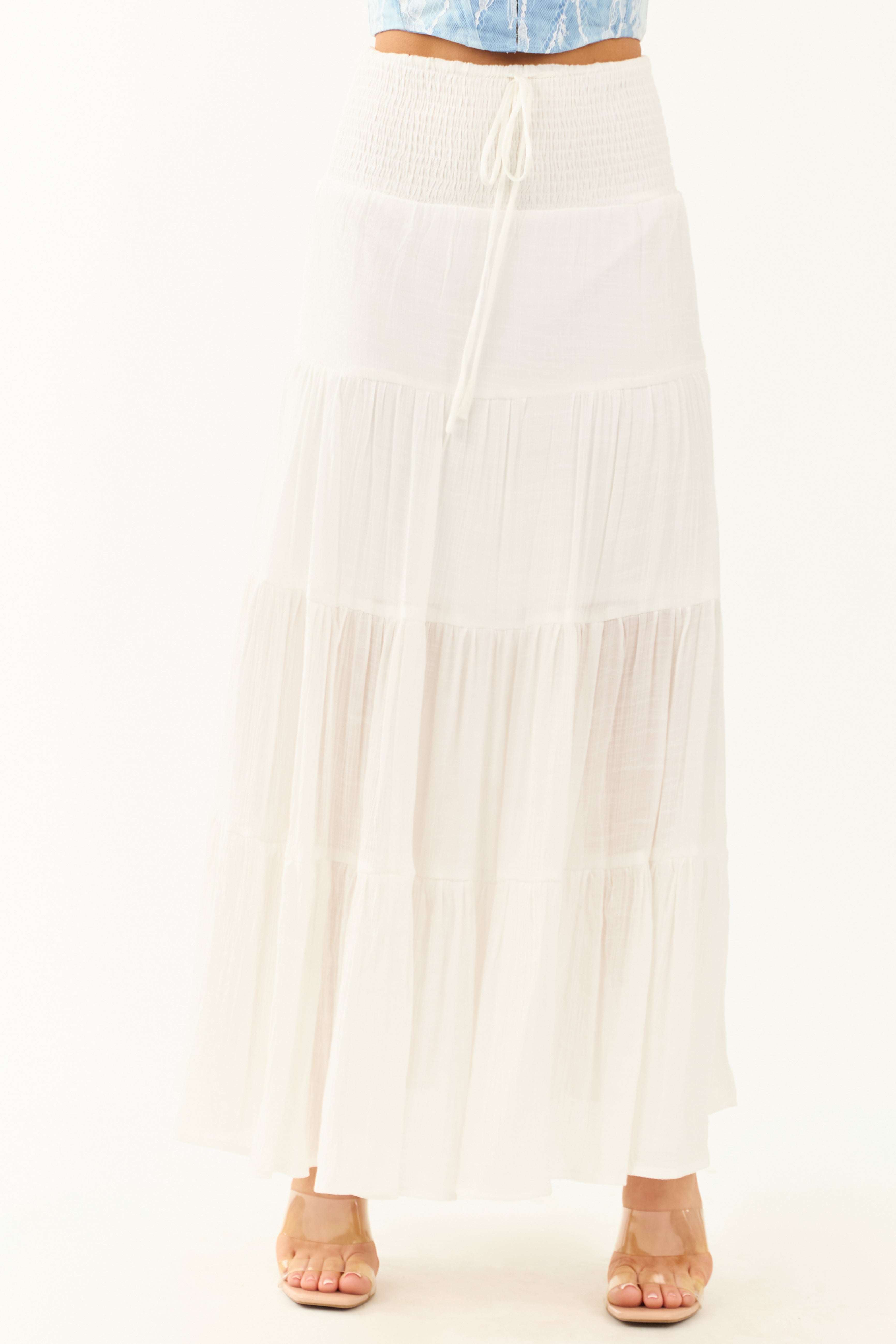 Exude elegance in this Ivory Smocked Drawstring Waist Maxi Skirt crafted from non-stretchy woven fabric. The elastic smocked waist offers flexibility with an adjustable drawstring for a custom fit. Fully lined for comfort and style. Hand wash in cold water for lasting beauty. Ideal for casual outings or special occasions. Available sizes: S, M, L.