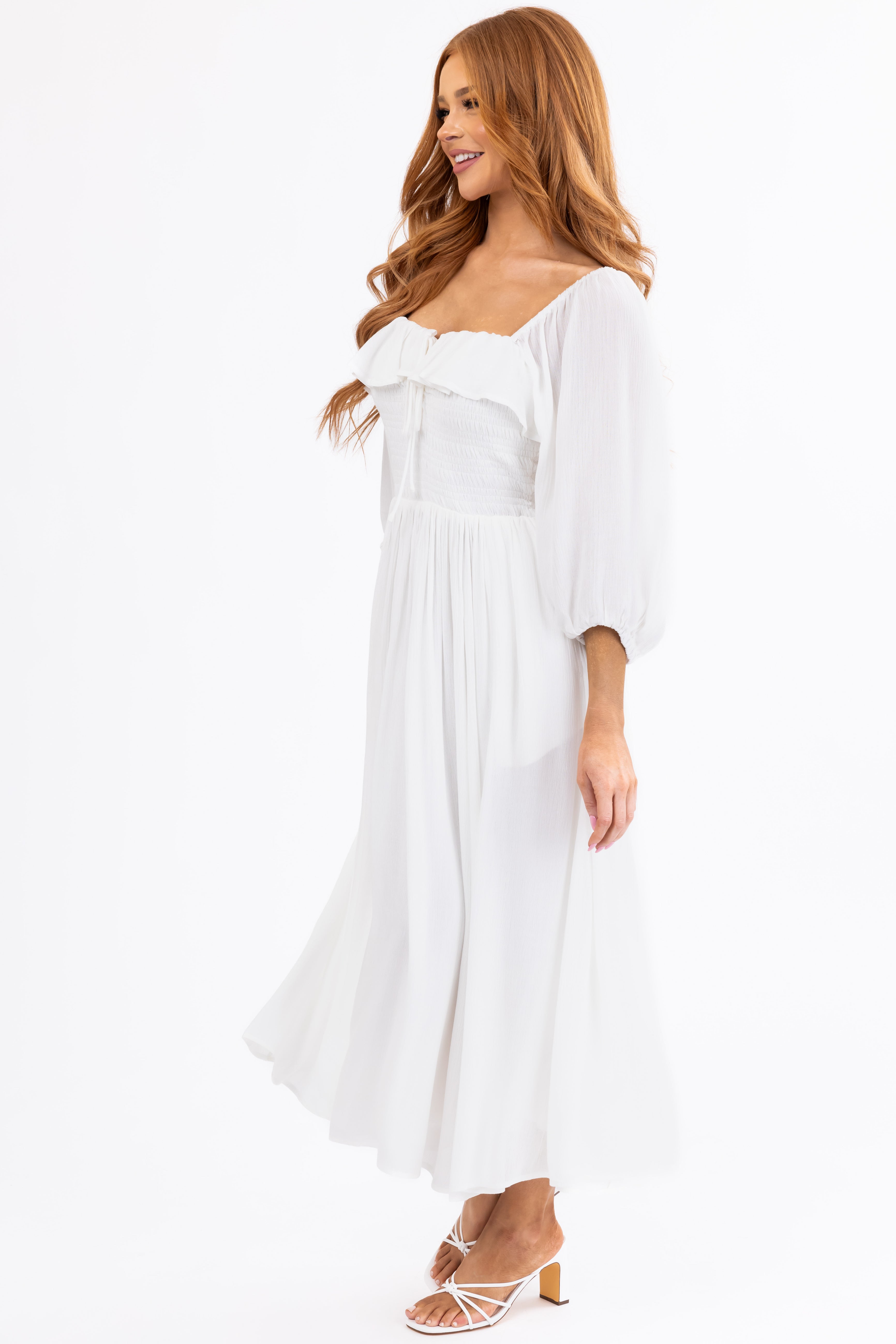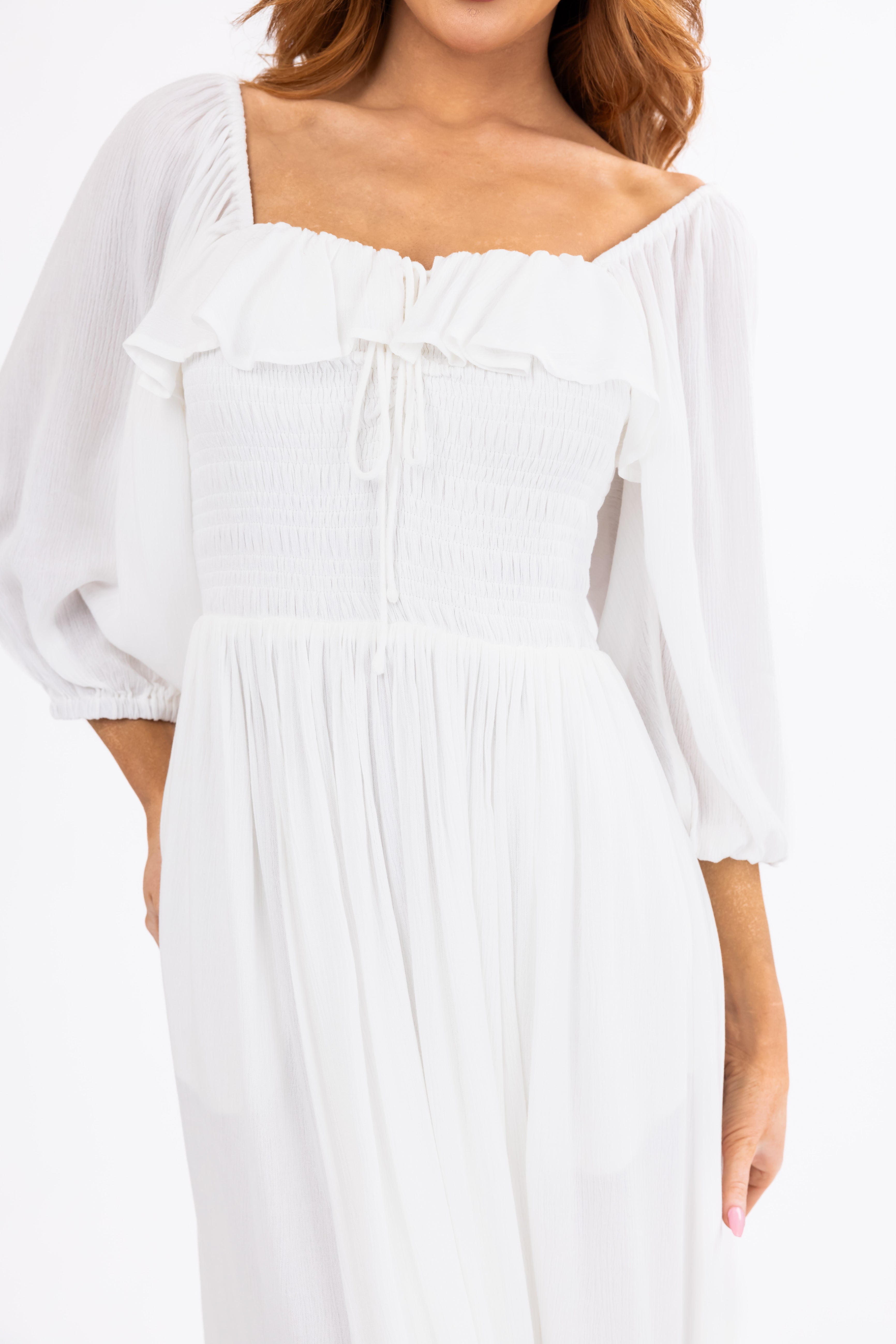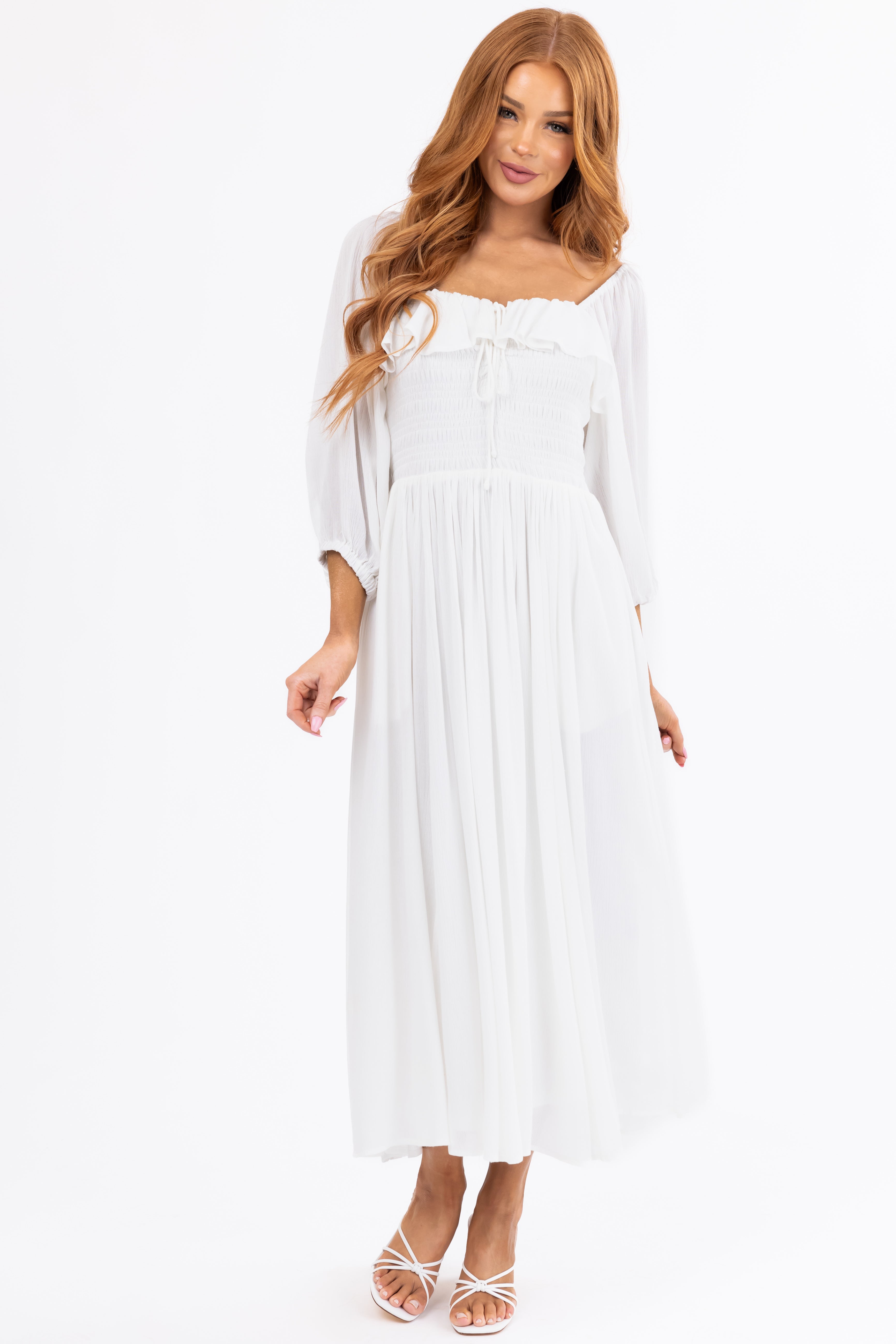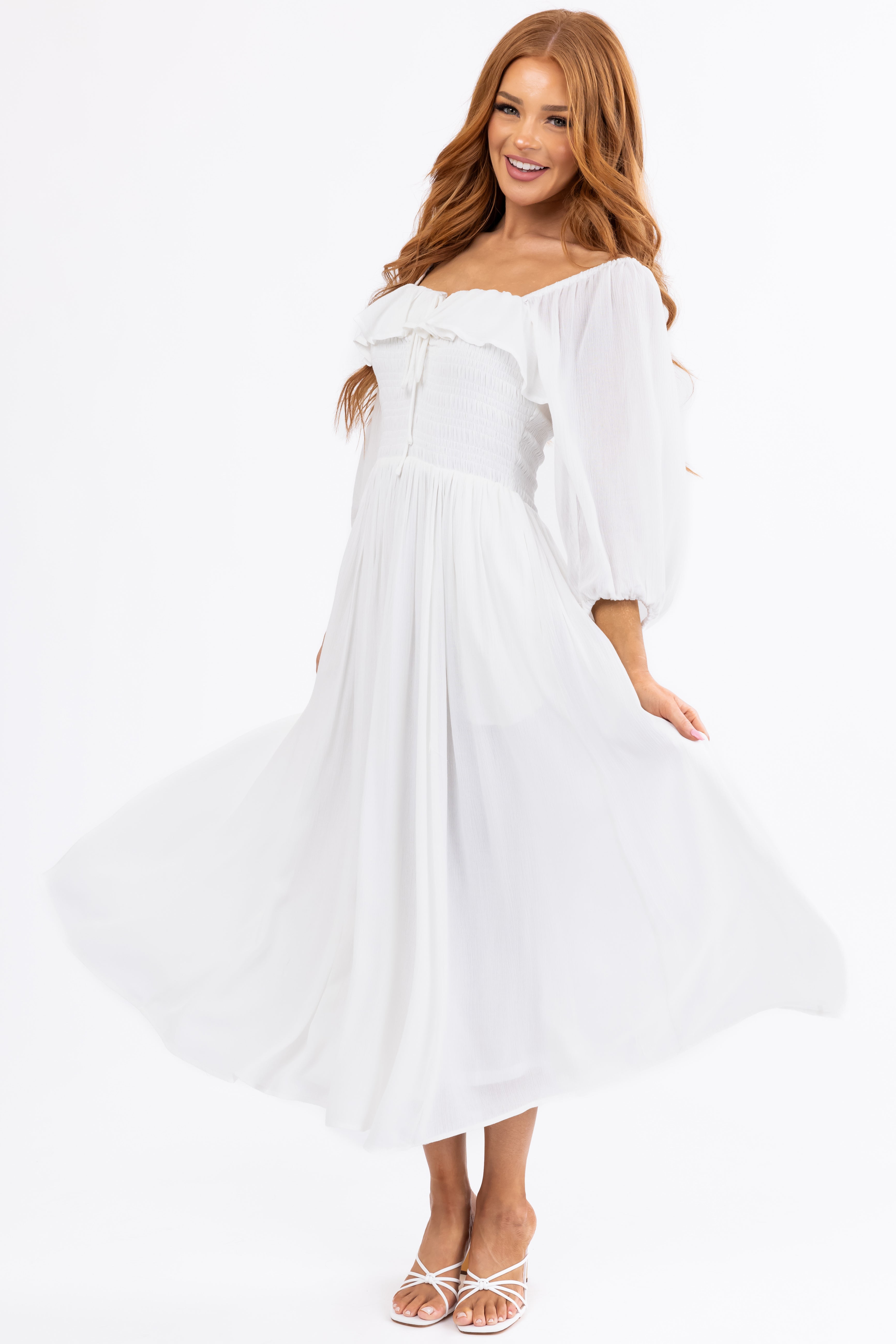 Ivory Smocked Midi Dress with Ruffle Overlay