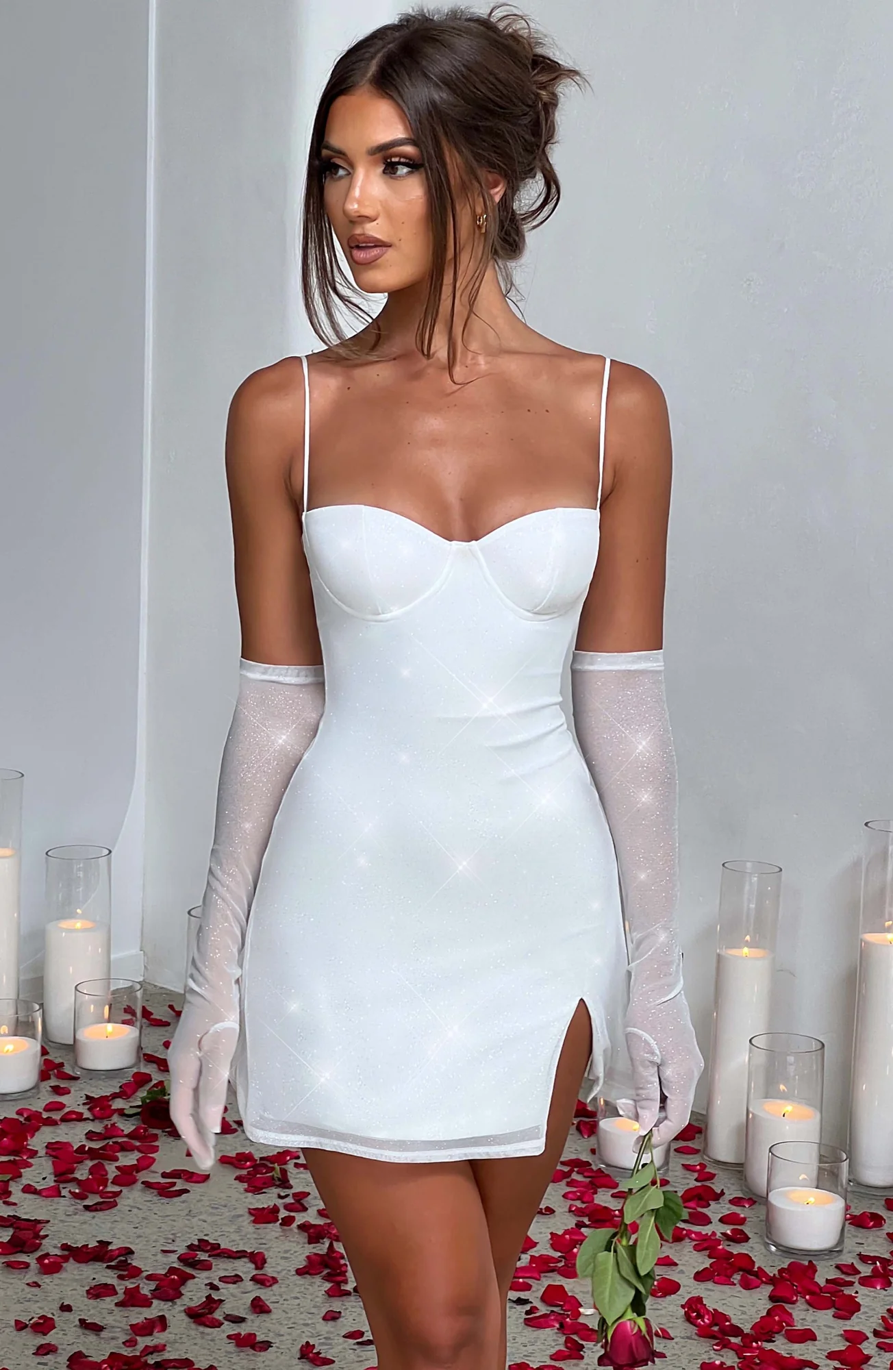 Make a dazzling entrance in the Ivory Sparkle Mesh Mini Dress. Crafted from a special custom mesh with all-over sparkles, this body-hugging dress features underwired cups for a lifted bust and a slight flare at the skirt with a leg split. Embrace the glamour with thin straps and a mini length. Pair with Pixie gloves for a stunning ensemble. Color: Ivory. Material: Soft stretch sparkle mesh. Ideal for parties, weddings, and more. Model is wearing size XS. Available in XS to XXL sizes.