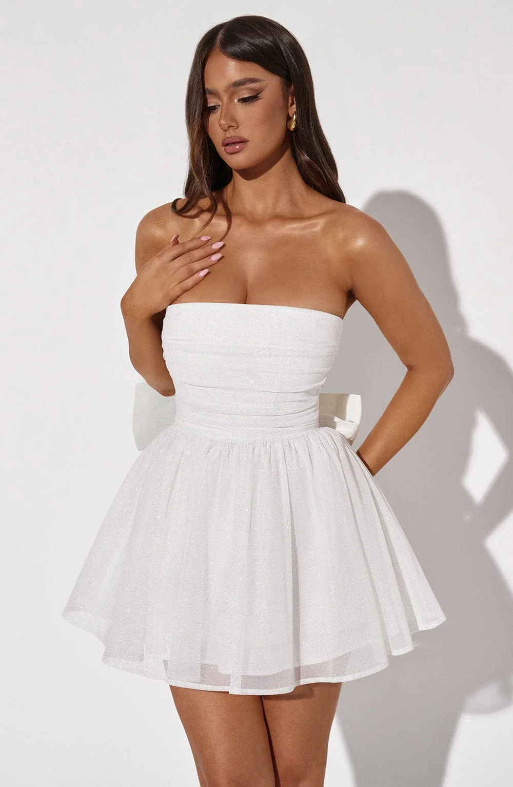 Experience the dress of the season with our Katrina Mini Dress in elegant ivory sparkle. Crafted from premium non-stretch cotton, this strapless dress features a ruched corset design that cinches the waist beautifully. Complete with an oversized bow detail at the back, Voluminous skirt, and zip fastening, this mini dress is perfect for adding feminine drama to any occasion. Whether its a birthday party, brunch, or evening event, this dress is a timeless choice. Model is XS and wearing an XS, with an F-cup size.
