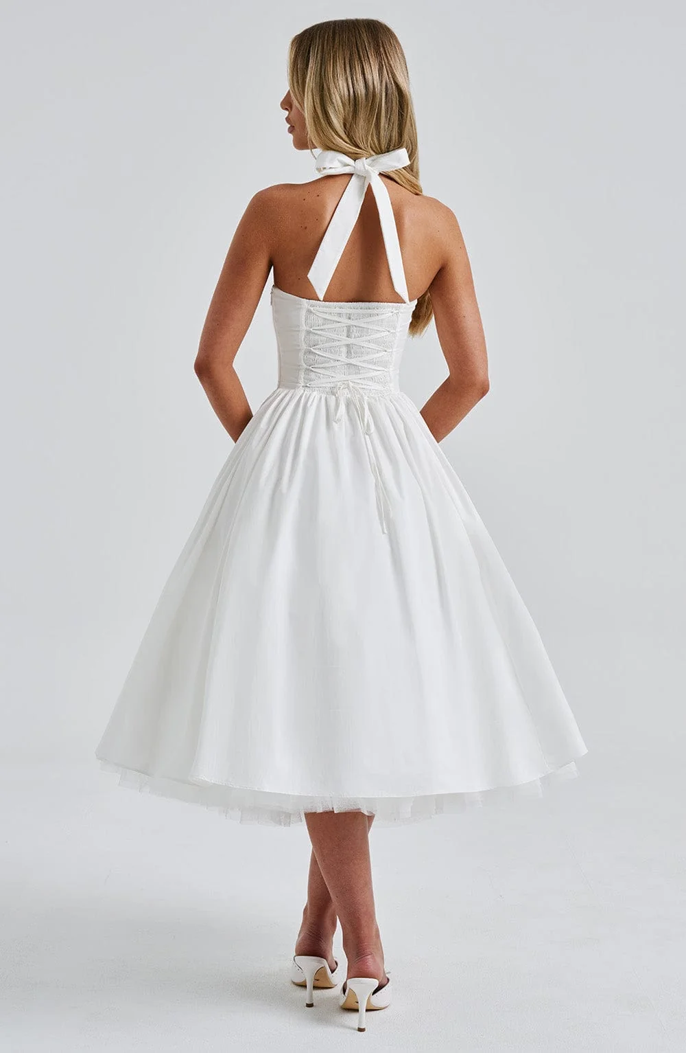 Experience elegance and playfulness with our Ivory Square Neck Midi Dress. Crafted from a premium cotton blend, it features a square halter neckline, princess seams, a full skirt with peek-a-boo tulle, tie back fastening, lace-up back, and shirred back panel for the perfect fit. This dress boasts an invisible zipper fastening, making it ideal for various occasions from birthdays to proms. Elevate your style effortlessly with this fully lined dress. Color: Ivory. Length: Midi.
