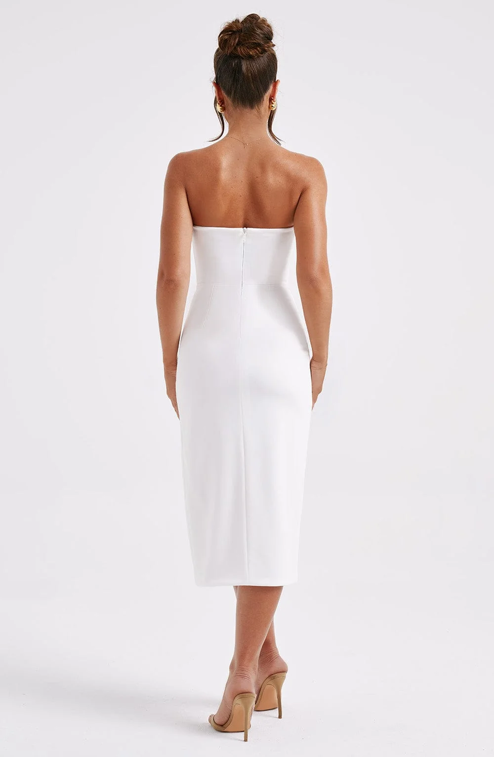 Indulge in the luxurious allure of the Ivory Strapless Midi Dress crafted from premium stretch crepe to accentuate your curves gracefully. This elegant attire features a strapless neckline, a flattering thigh-high split, and a sophisticated midi length. Elevate your look with a stylish knot, heeled mules, and a chic mini bag. Embrace sophistication and confidence with this iconic ensemble. Ideal for weddings, parties, and special events. Available in sizes XS to XXL.