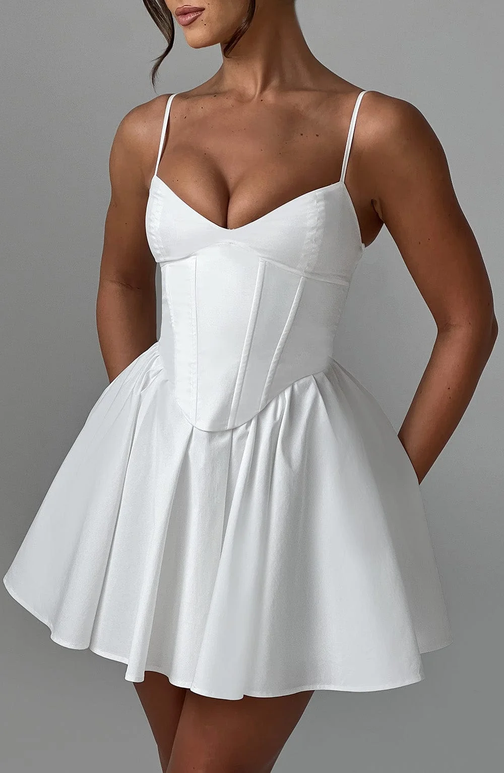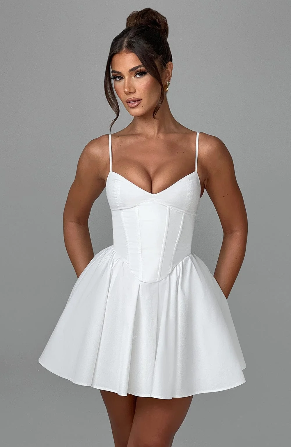 This elegant ivory mini dress features a boned corset with a sweetheart neckline, adjustable straps, and a lace-up back for a cinched waist. Crafted from premium non-stretch cotton blend fabric, it has a super full skirt, invisible zipper closure, and is fully lined for comfort. Perfect for any occasion! Model is wearing size XS.
