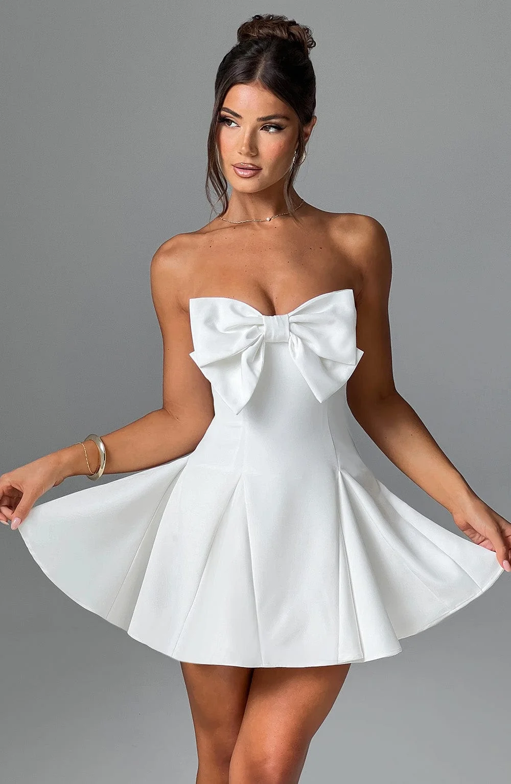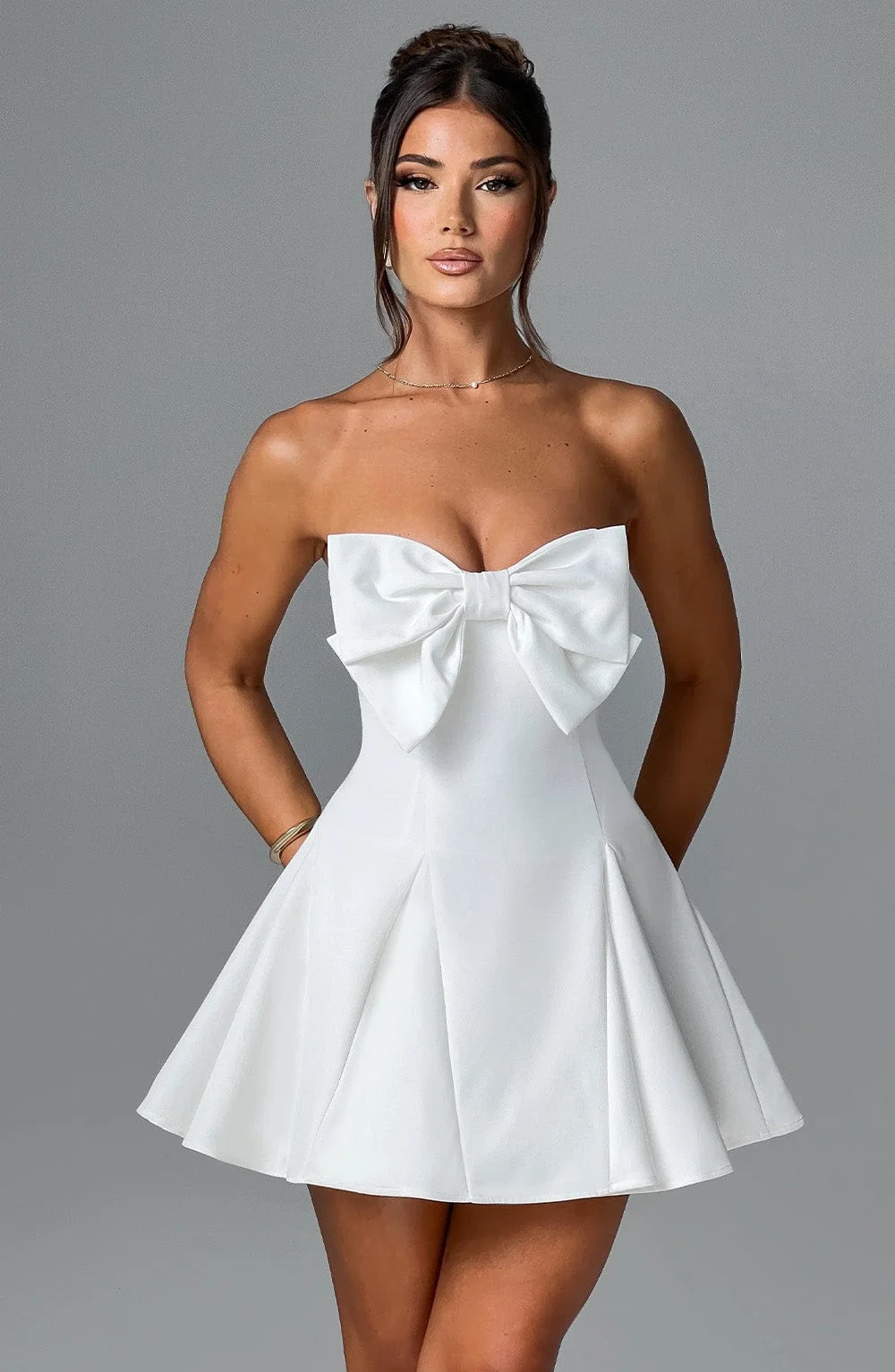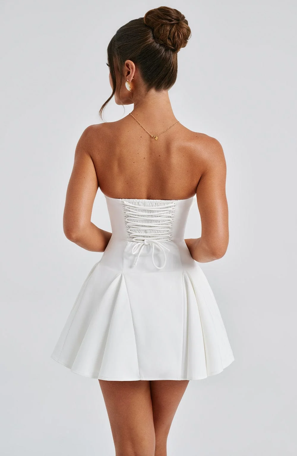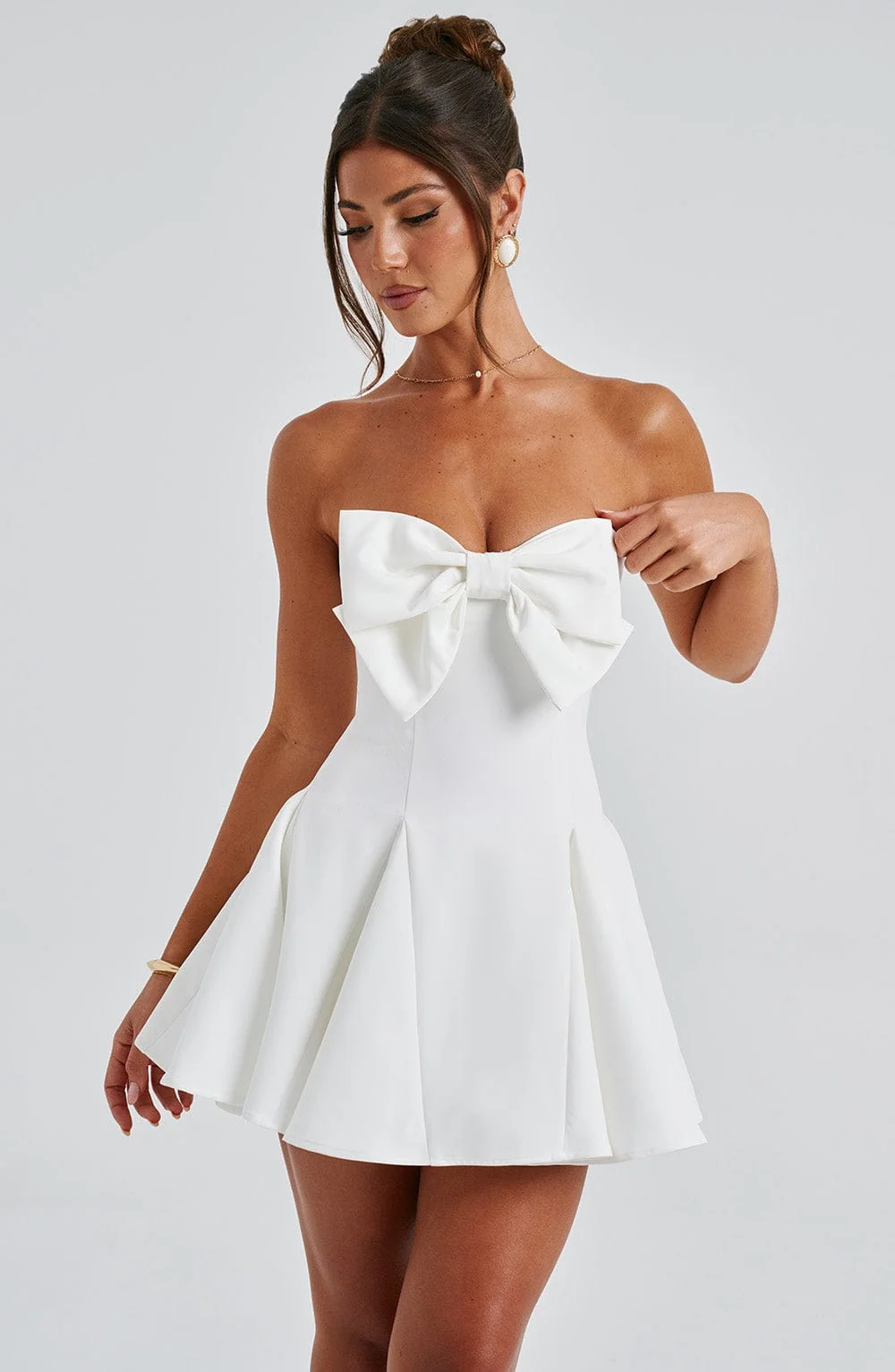 Capture attention with the Ivory Strapless Playsuit crafted from premium stretch twill fabric. This mini playsuit features a flattering strapless neckline, stylish bow detail, built-in shorts with a skirt overlay, lace-up and shirred back details, and voluminous skirt panels. Perfect for special occasions when you want to stand out in comfort and style. Pair with the Perrie bow hair clip and Eloise earrings for a complete look. Available in Ivory. Fully lined with invisible zipper closure for seamless elegance.
