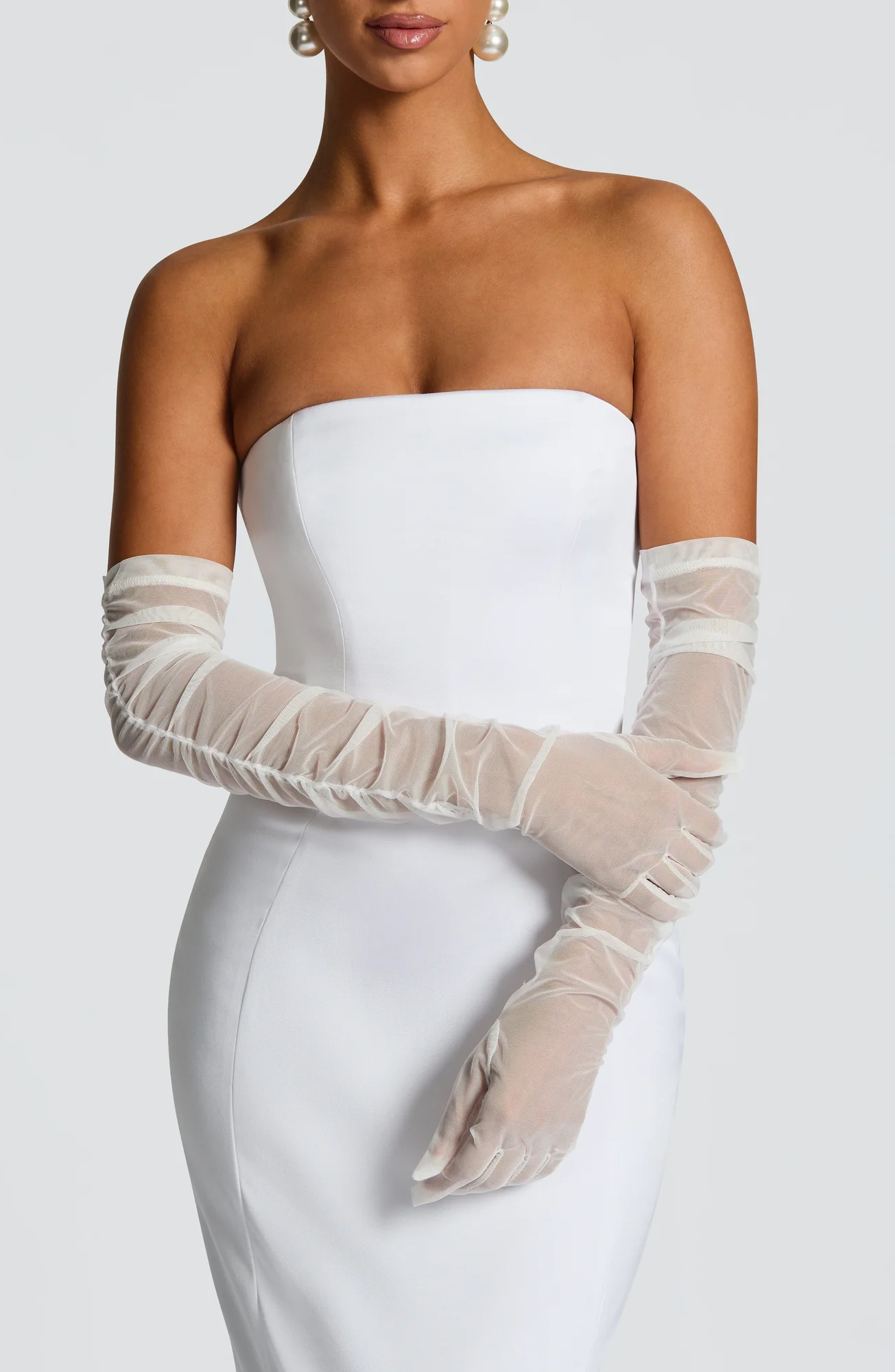 Elevate your attire with our Ivory Stretch Mesh Ada Gloves. These elegant above-elbow length gloves are crafted from luxurious soft mesh, offering a perfect fit and graceful movement for special occasions. The unlined design features ruching along seams for timeless refinement. The Ivory Ada Gloves pair perfectly with the Emryn Gown for a sophisticated look that exudes grace and style. Perfect for formal events or evening wear. This non-returnable item ensures elegance and allure.