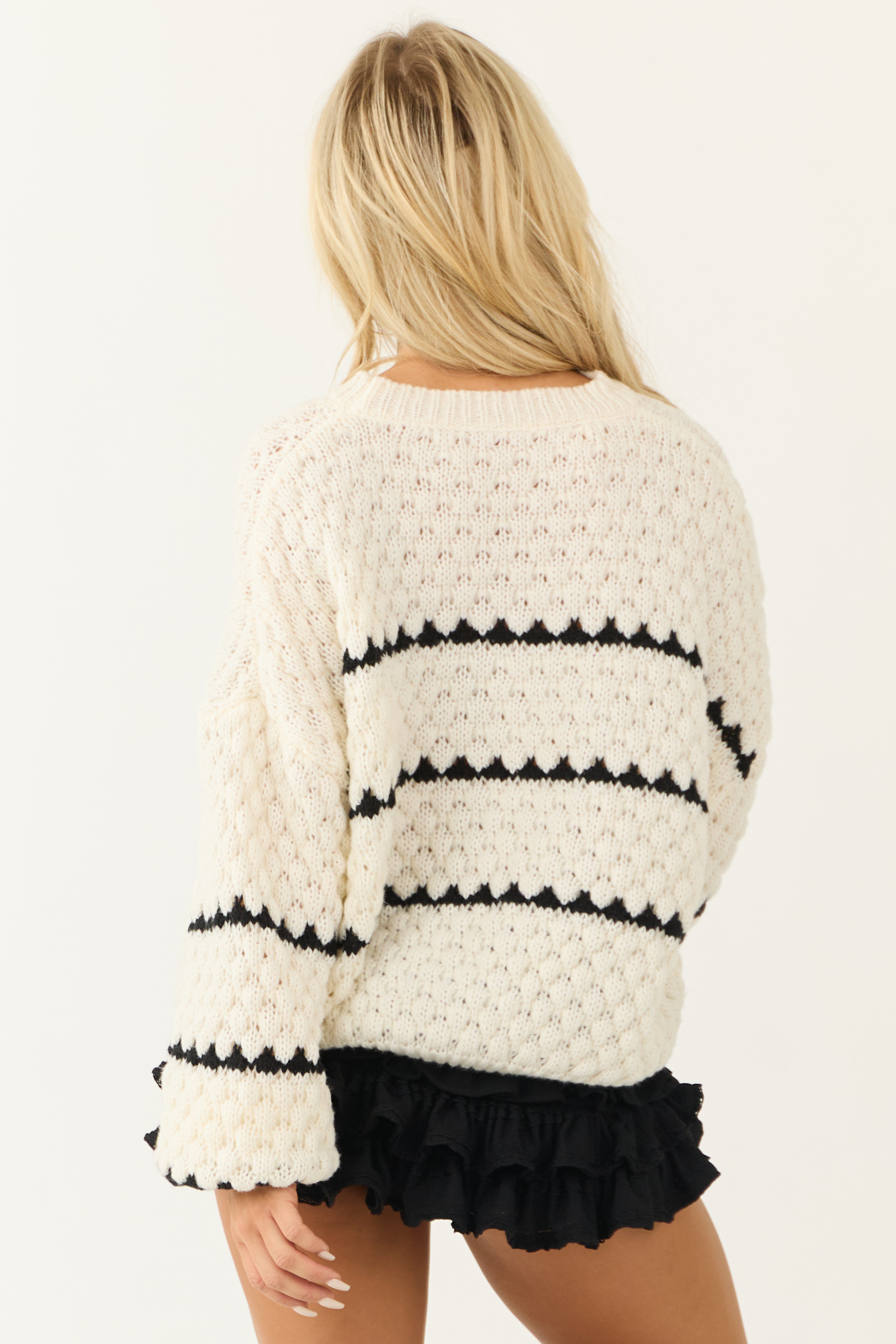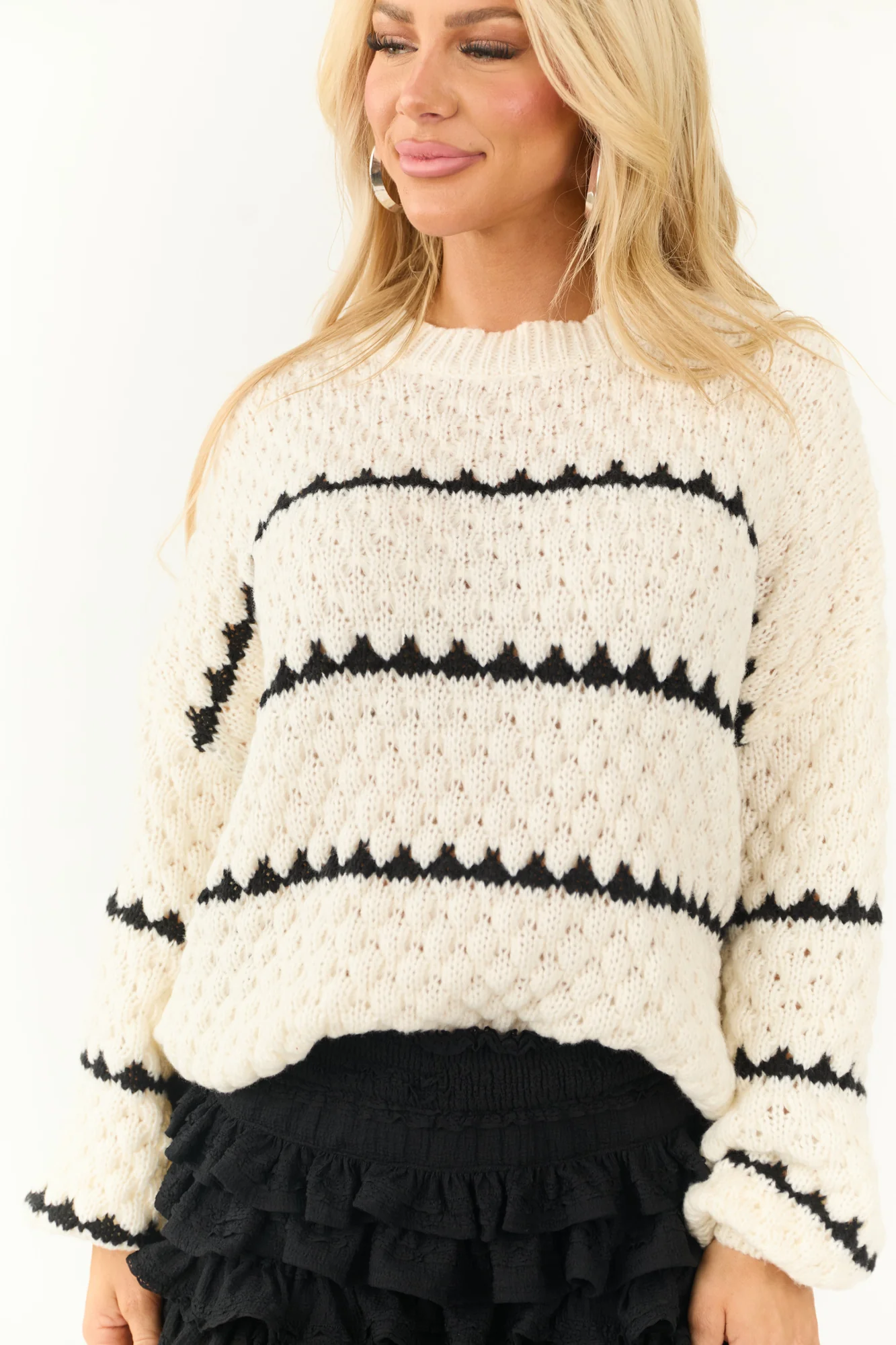 Stay cozy in style with our Ivory Striped Chunky Knit Balloon Sleeve Sweater. Crafted from stretchy diamond knit fabric, this sweater features retro black heart stripes, long sleeves, and a drop shoulder design. The ribbed banded trim adds a touch of elegance. Unlined for comfort, it is made of 100% Polyester. Care instructions: Hand wash cold, do not bleach, do not tumble dry, iron at low heat. For best results, dry clean only. Model is wearing a size Small. Model’s Profile: Size 1, Height 57″, Bust 34″, Waist 26″
