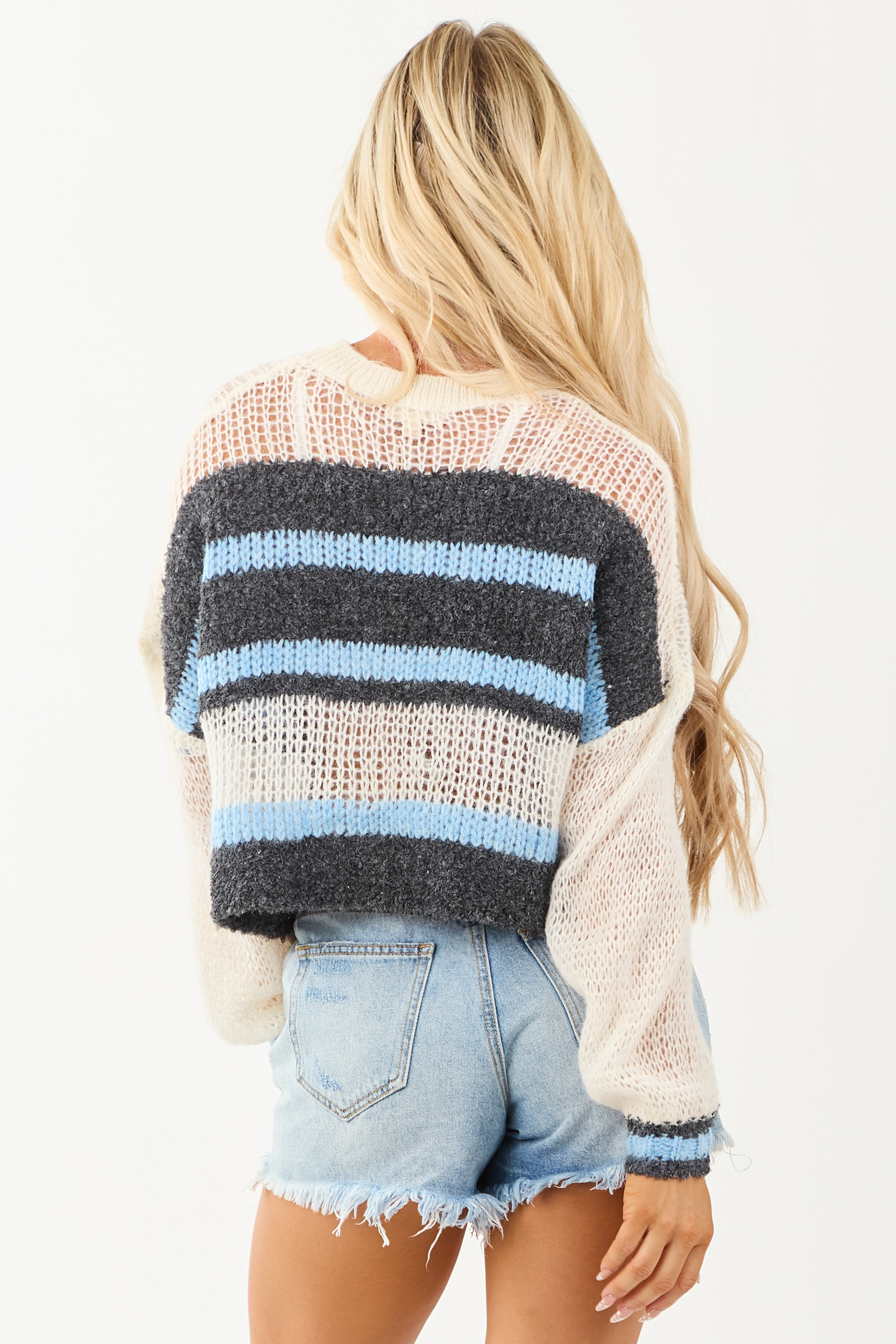 Stay cozy in style with our ivory striped cropped knit sweater. This sweater features an oversized fit, stretchy open crochet knit, and stripes in shades of Ivory, Charcoal, and Sky Blue. Made of a blend of quality materials for ultimate comfort. Perfect for brisk days and casual occasions. Imported.