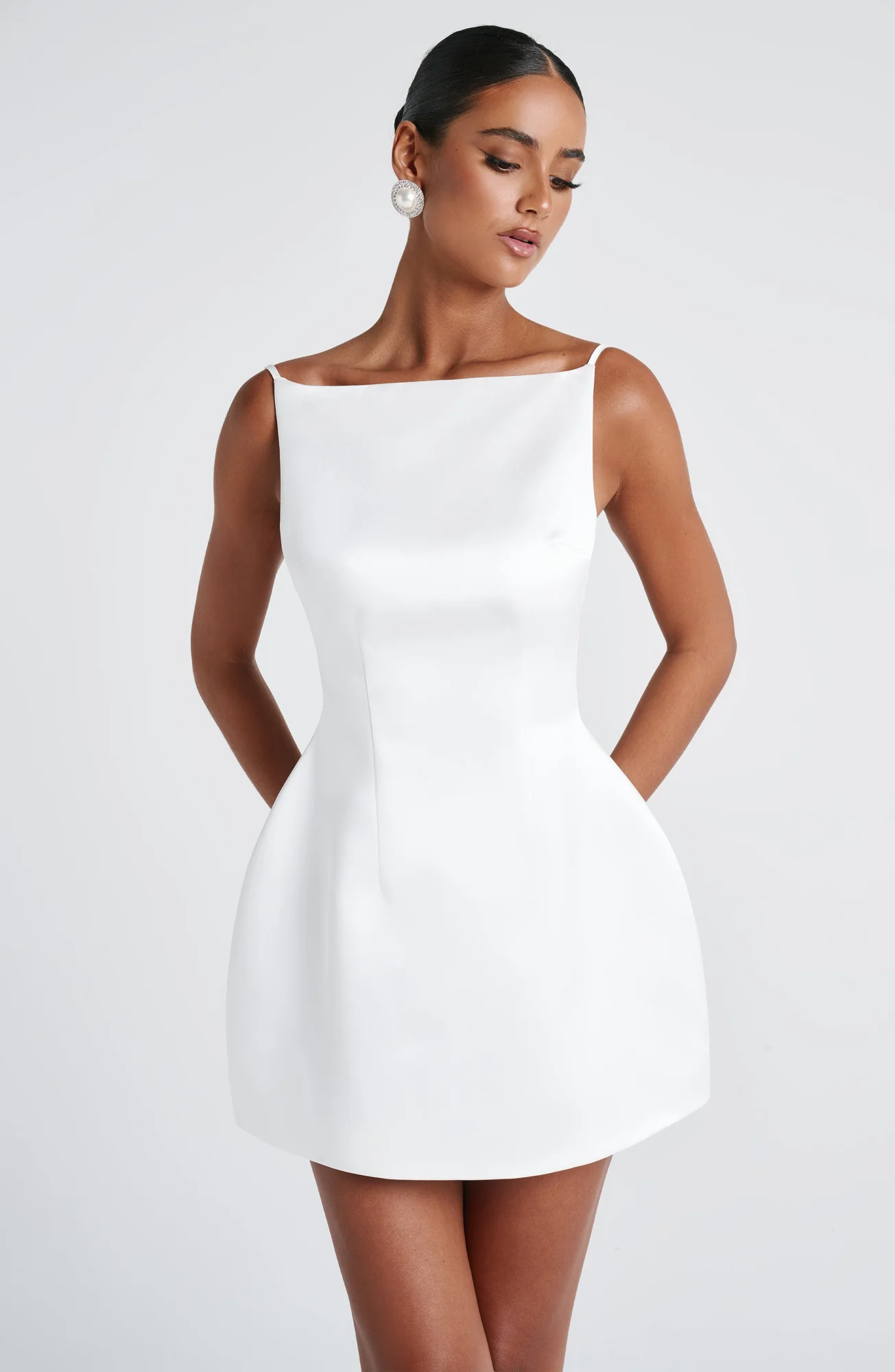 Indulge in sophistication with our Ivory Structured Satin Bubble Mini Dress. The modern design features a bold bubble-shaped skirt for playful volume, a high boat neckline for architectural elegance, and a low scoop back for a touch of allure. Crafted from luxurious structured satin, this mini dress is perfect for various occasions, from birthdays to parties. Elevate your wardrobe with this timeless piece today!
