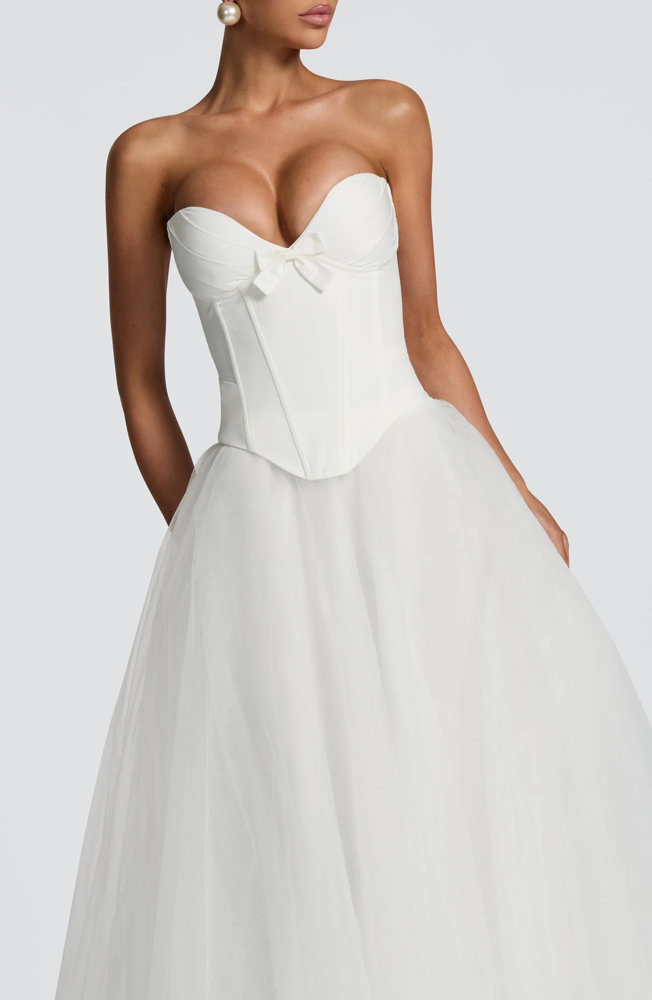 Elevate your style with the Ivory Sweetheart Corset Top featuring a strapless design, monowire cups, pleated embellishments, and a charming bow accent. Enjoy a tailored, adjustable fit with boning, lace-up back, and shirring. Crafted from a blend of cotton, nylon, and elastane poplin, this fully lined top is perfect for pairing with the Ethel Maxi Skirt. Make a fashion statement at any event with this elegant corset top in classic ivory.