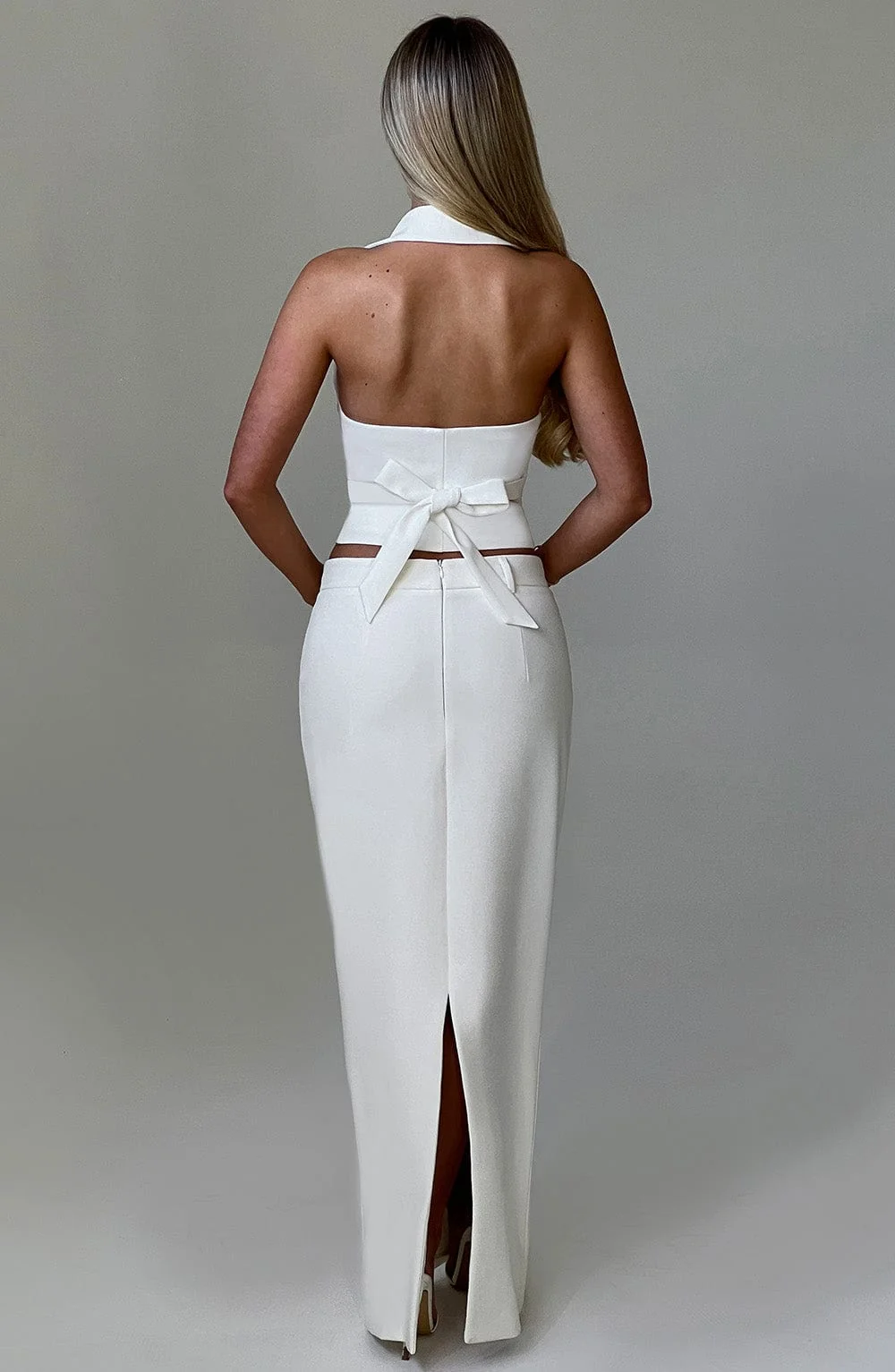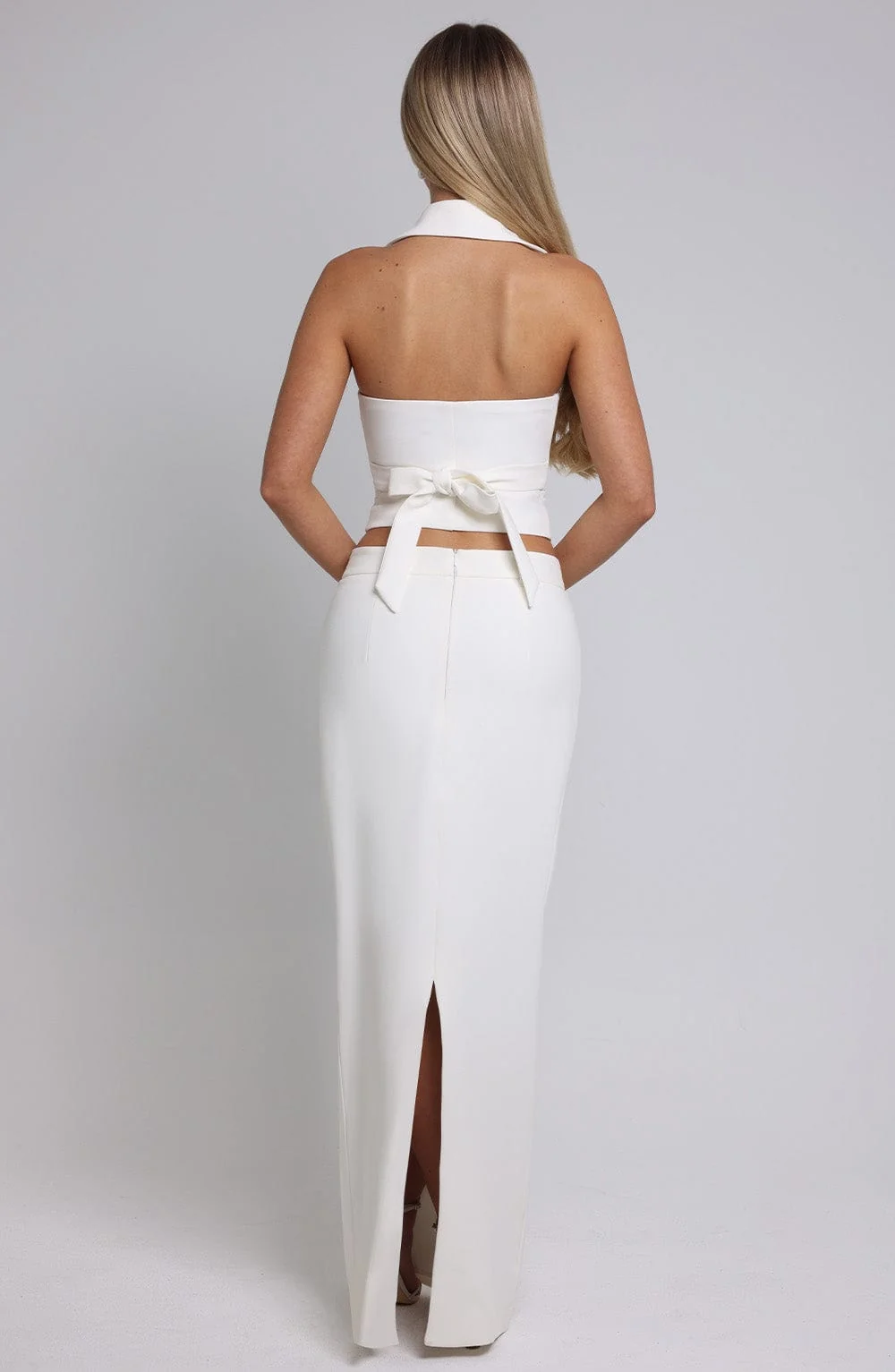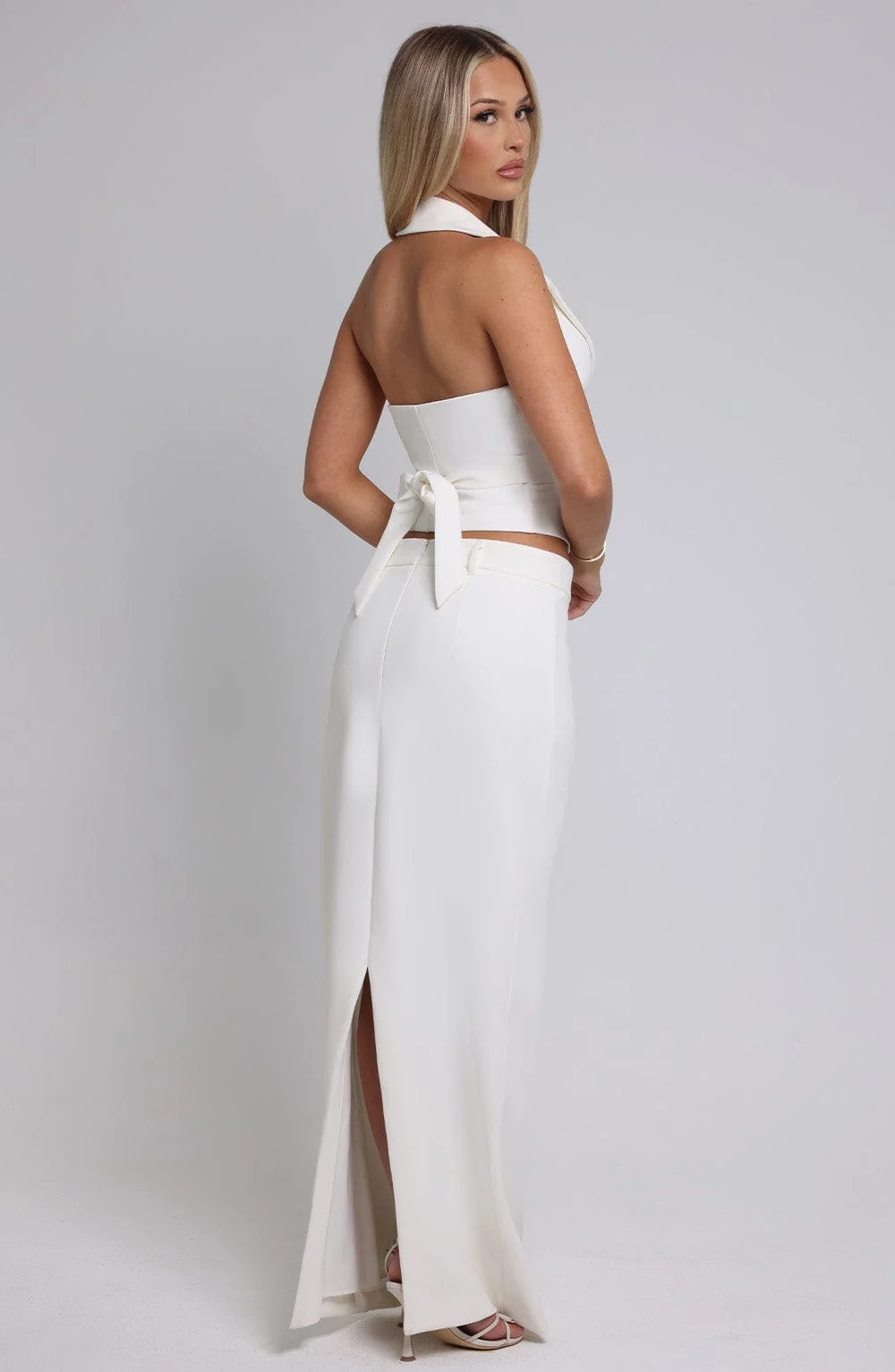 Elevate your style with our premium Ivory Tailored Maxi Skirt crafted from non-stretch crepe fabric. Featuring a mid-rise fit, waistband with belt loops, and a center back split for a sophisticated touch. Complete your look effortlessly. Ideal for various occasions like brunch, parties, or evenings out. Includes invisible zipper fastening. Available in sizes XS, S, M, L, XL, XXL. Model is wearing size XS.