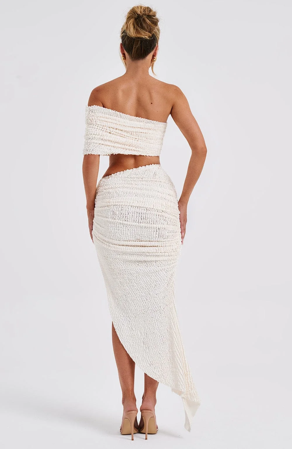 Indulge in elegance with our Ivory Textured Stretch Midi Skirt featuring a drawstring hip detail and asymmetric hem design. Crafted for style and comfort, this skirt boasts a thigh-high split and midi length perfect for any occasion. Elevate your look by pairing it with our matching Zina top. Experience the perfect blend of sophistication and versatility. Embrace timeless fashion with our Ivory Textured Stretch Midi Skirt. Buy now!