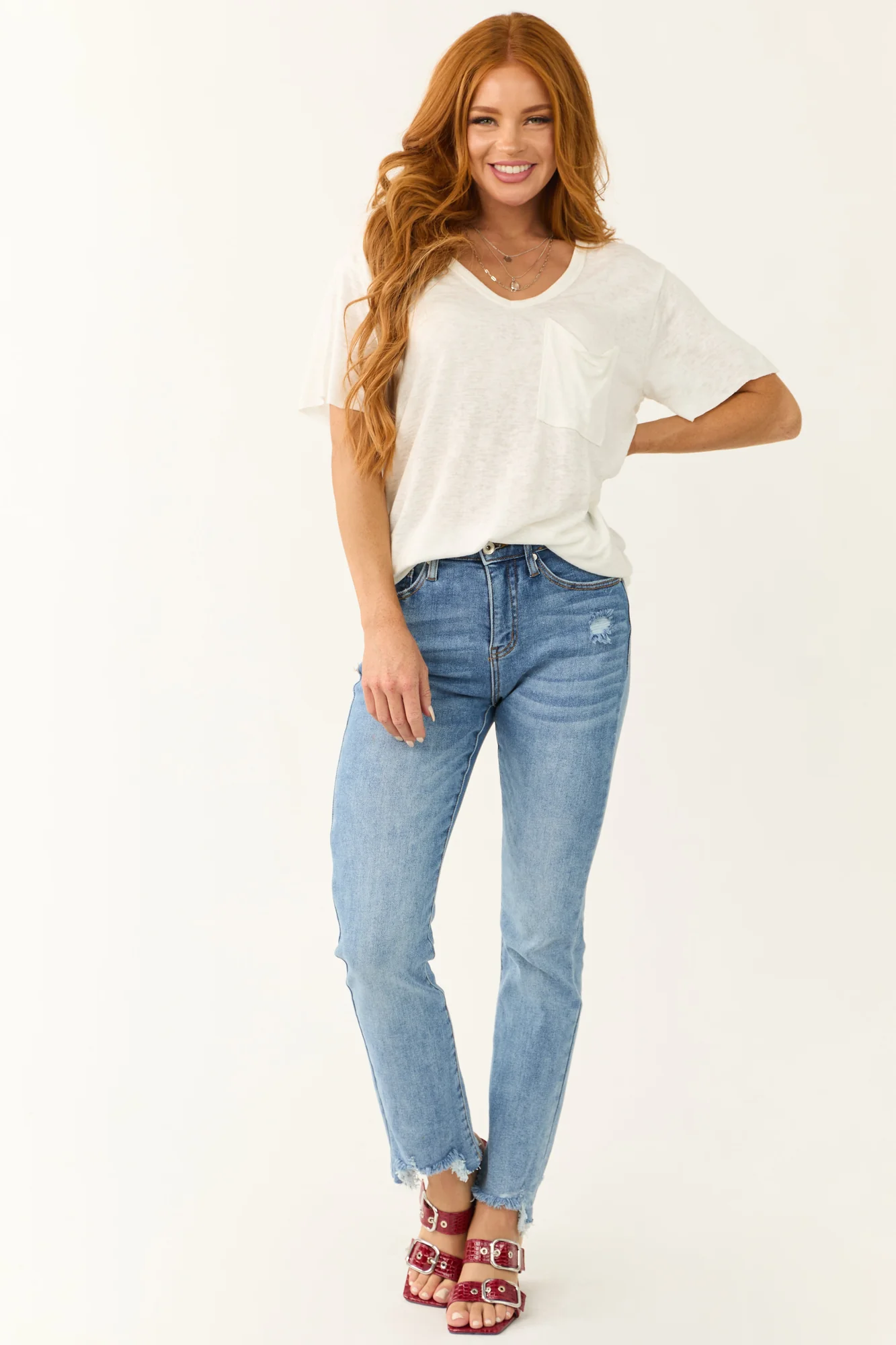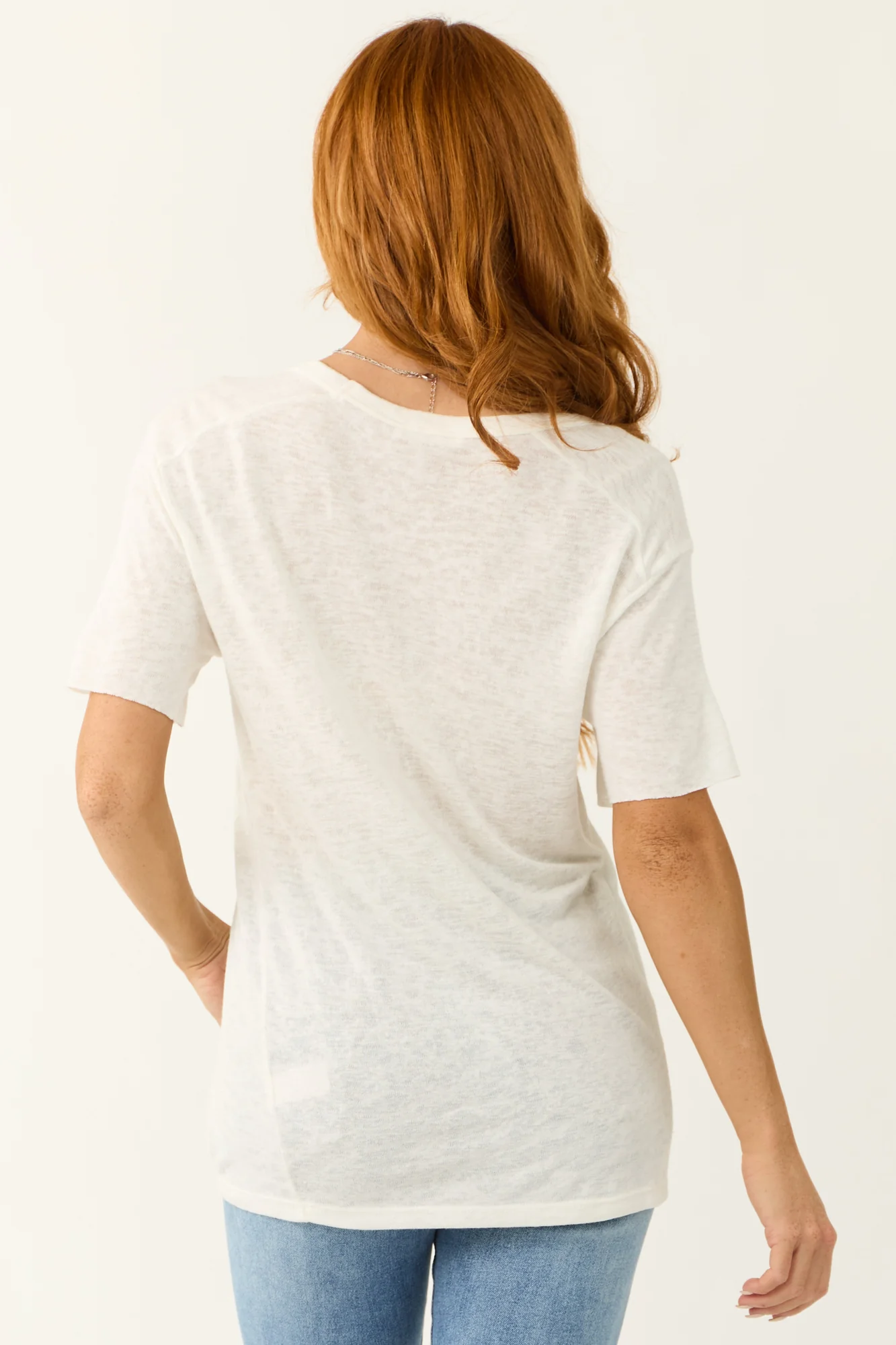 This ivory short sleeve top is a versatile piece with a loose, casual fit. Made of a stretchy knit fabric, it features a V neckline and a chest pocket. With sleeve lengths of 7 inches and a length ranging from 26 to 27 inches, this top comes in sizes Small, Medium, and Large to fit bust sizes from 42 to 46 inches. Crafted from 62% Rayon and 38% Polyester, this top is perfect for everyday wear. Note: Hand wash cold, lay flat to dry. Model in the picture is wearing a size Small and her measurements are: Size 1, Height 55″, Bust 31″, Waist 24″.