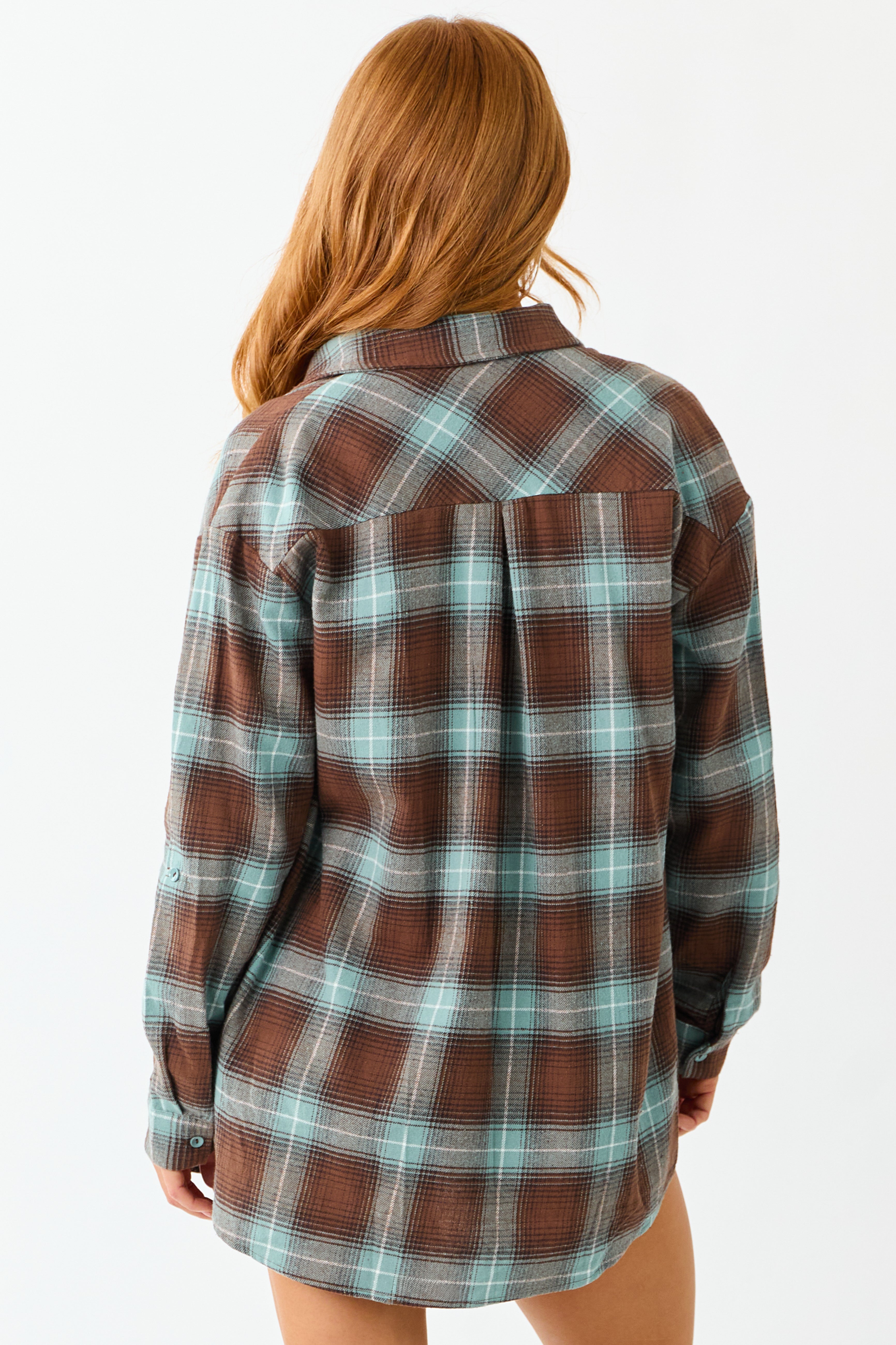 This soft cotton top in Sepia, Cocoa, and Off White plaid features a collared neckline, an oversized fit, non-stretchy lightweight fabric, and options for rolled cuffs or banded button cuffs. Perfect for layering or standalone styling during chilly days.