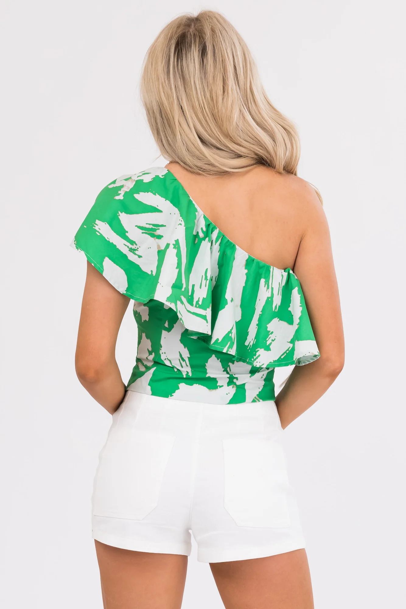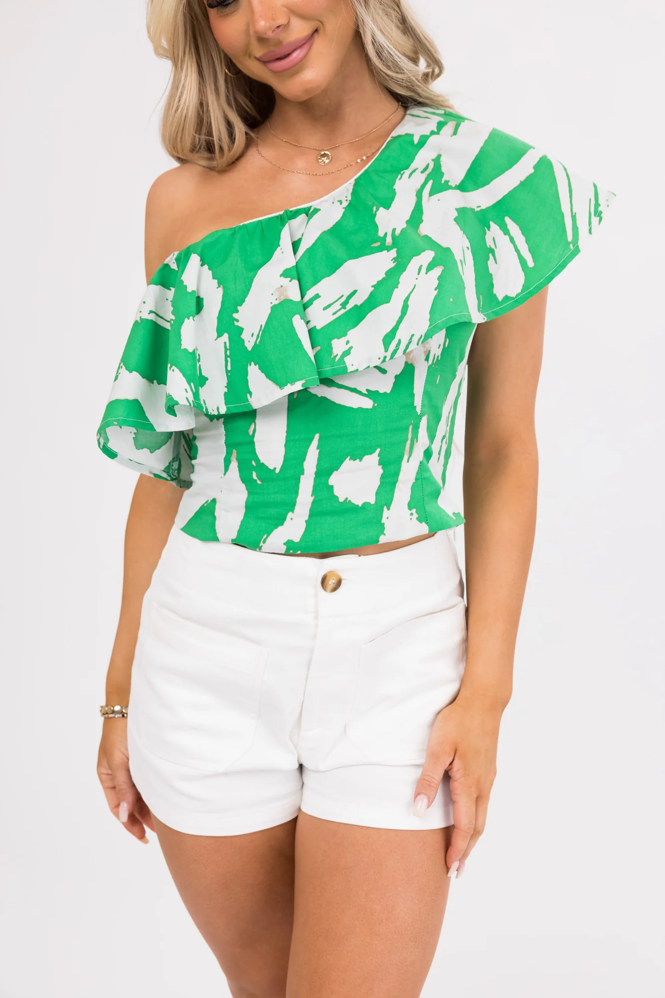 Upgrade your wardrobe with this chic Kelly Green Abstract Print Top made of 100% non-stretchy breezy cotton. Featuring a stylish one-shoulder design with a short sleeve, ruffle neckline, and side zipper closure. This semi-cropped top in shades of Kelly Green, Coconut, and Taupe is lined with 100% Polyester for a comfortable fit. Perfect for daytime or party wear, this top adds a vibrant touch to your look. Embrace uniqueness as each piece may vary slightly due to the cutting and sewing process. Model is wearing a size Small. Size guide: S (Bust: 34, Length: 19, Sleeve: 8.5) M (Bust: 35, Length: 19, Sleeve: 8.5) L (Bust: 36, Length: 19, Sleeve: 8.5)