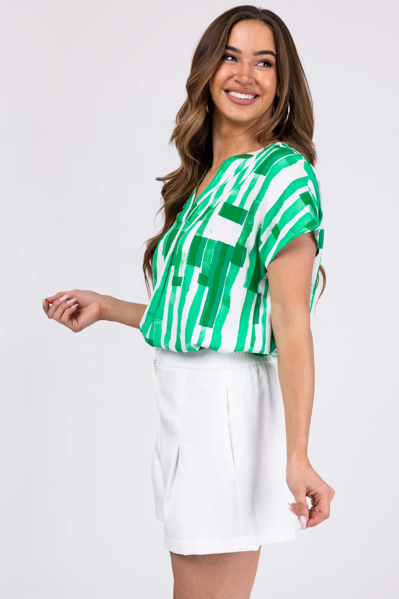 Elevate your wardrobe with this fashionable Kelly Green Abstract Print V-Neck Top . Made of non-stretchy woven fabric with a banded V-neck, this top features a unique abstract print in shades of Kelly Green, Jade, Olive, and Off White. The top comes in sizes S, M, and L with strap lengths of 5″, 5.5″, and 6″, respectively. With a length ranging from 25.5″ to 26″ and bust sizes from 42″ to 46″, this stylish top is versatile for daytime or workwear. Hand wash cold, iron on low, and line dry for best care results.