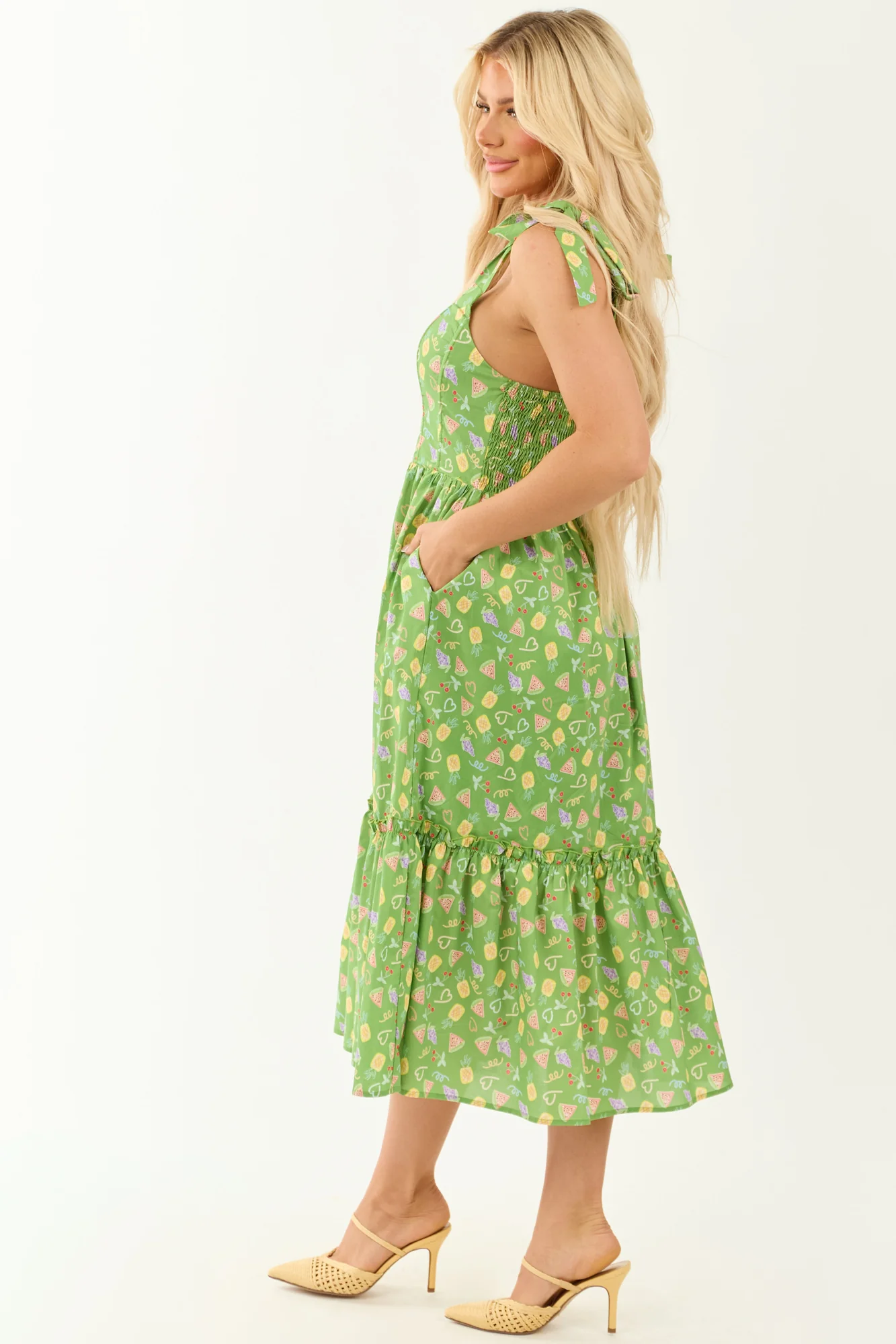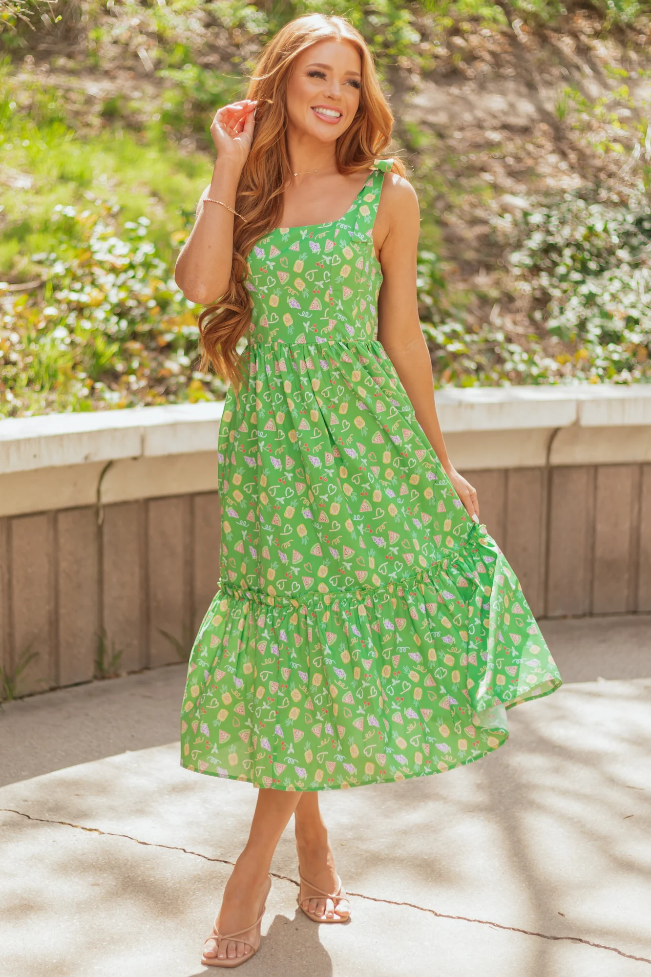 Elevate your style with this charming Kelly Green Fruit Print Square Neck Midi Dress! Embrace a fruity flair featuring Strawberry, Kiwi, Sunshine, Mustard, Dusty Blue, Dusty Blush, Grape, and Ruby prints. This dress, lined for comfort, offers a forgiving fit and trendy adjustable tie straps. Enjoy the convenience of hidden side pockets and a stretchy smocked back that accentuates your silhouette. Crafted from 100% Cotton with boning in the bodice, this dress ensures a fashionable yet comfortable experience. Hand wash and line dry for lasting quality. Available in sizes Small, Medium, and Large.