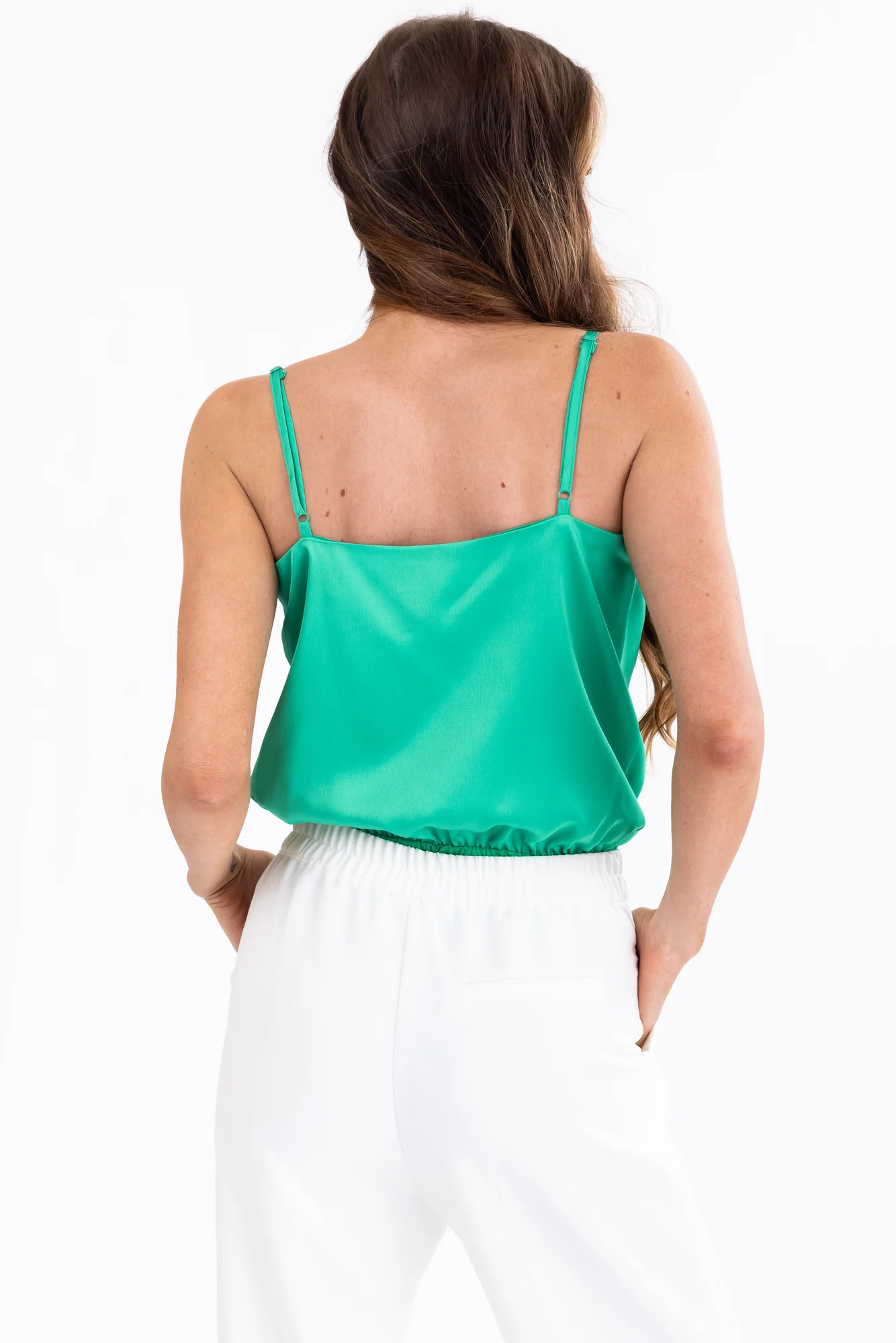 Upgrade your wardrobe with this Kelly Green Satin Draped Neck Sleeveless Bodysuit + Sky. Designed with a non-stretchy textured satin top and a stretchy knit bottom, this charming bodysuit features an adjustable cowl neckline for a chic look. The blouson style and snap button crotch closure add convenience, while the cheeky cut keeps you stylish and comfortable. Stay on-trend with this versatile piece perfect for daytime, party, or work occasions. Hand wash cold to maintain this vibrant color. Model is 58″ and wears a size Small.