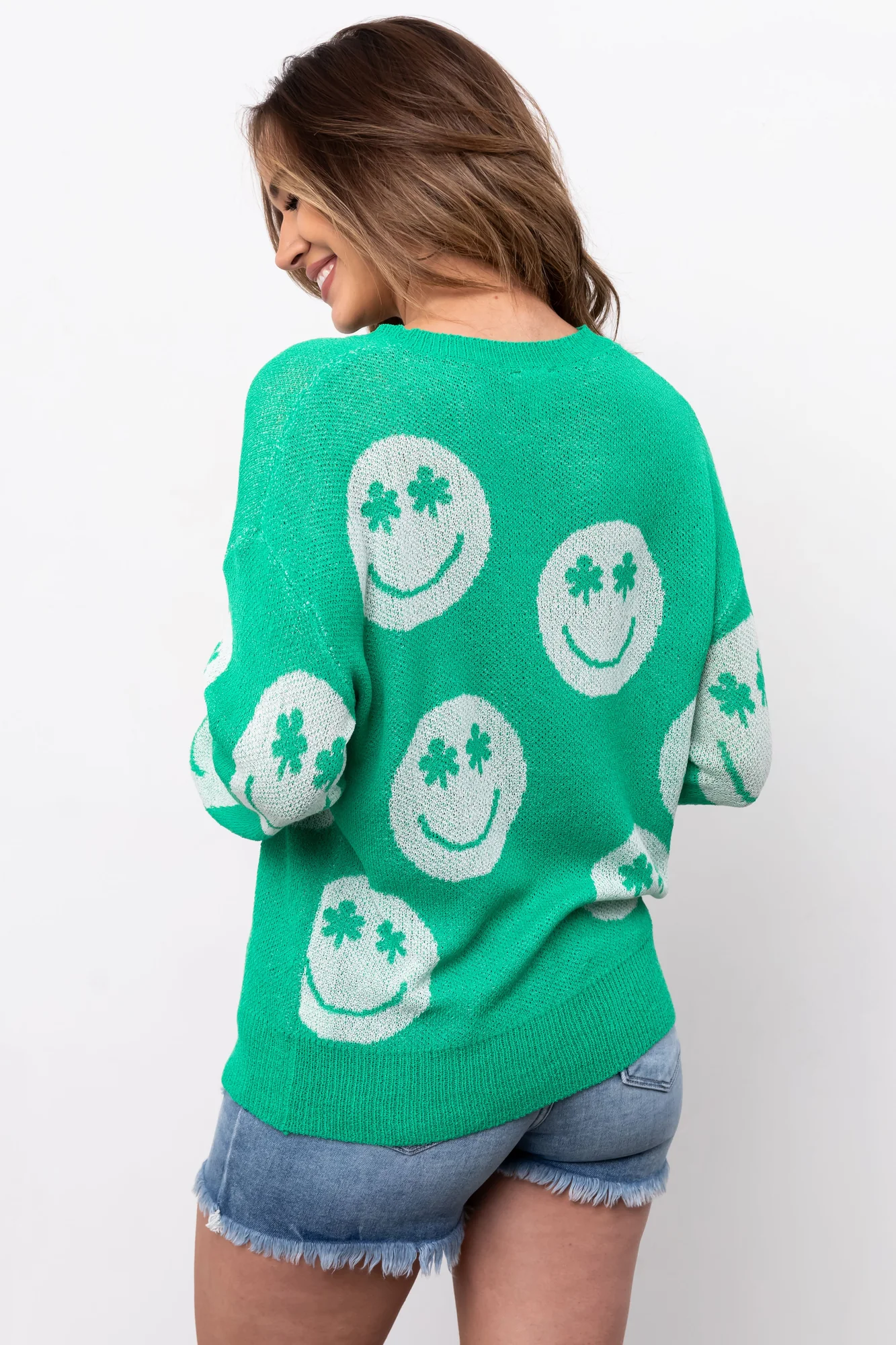 This trendy Kelly Green Smiley Face Sweater is a must-have addition to your wardrobe. Crafted from a blend of 75% Acrylic and 25% Polyamide, this sweater offers a relaxed fit with a crew neckline, long sleeves, and drop shoulder design. The lightweight knit material ensures a comfortable and stylish wear for any casual occasion. The sweater features a charming smiley face print in Kelly Green and Ivory shades, adding a touch of fun to your outfit. Available in sizes S, M, L, and XL. Care instructions: Hand wash cold water, line dry, iron low. Model is 59″ tall, wearing a size Small.
