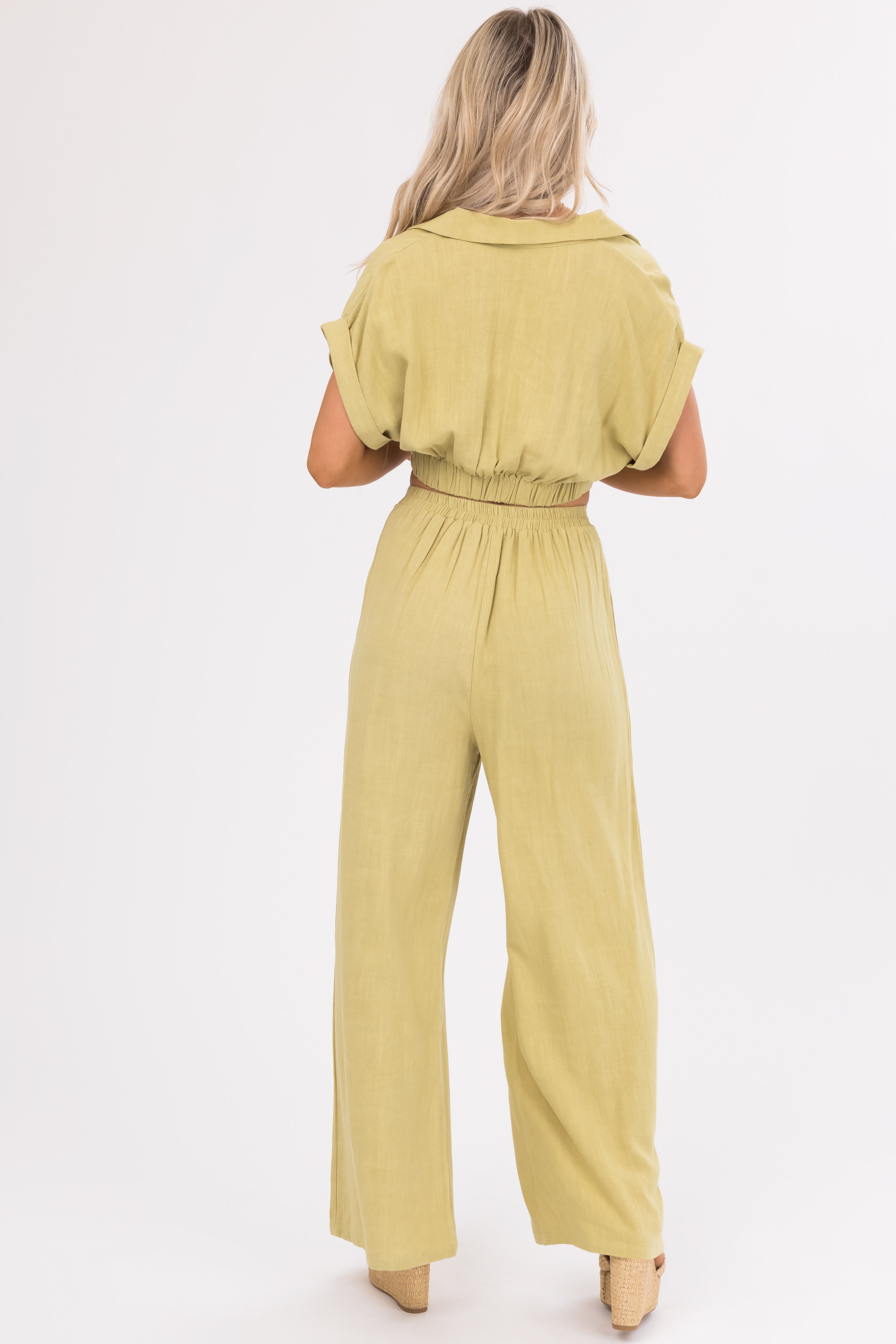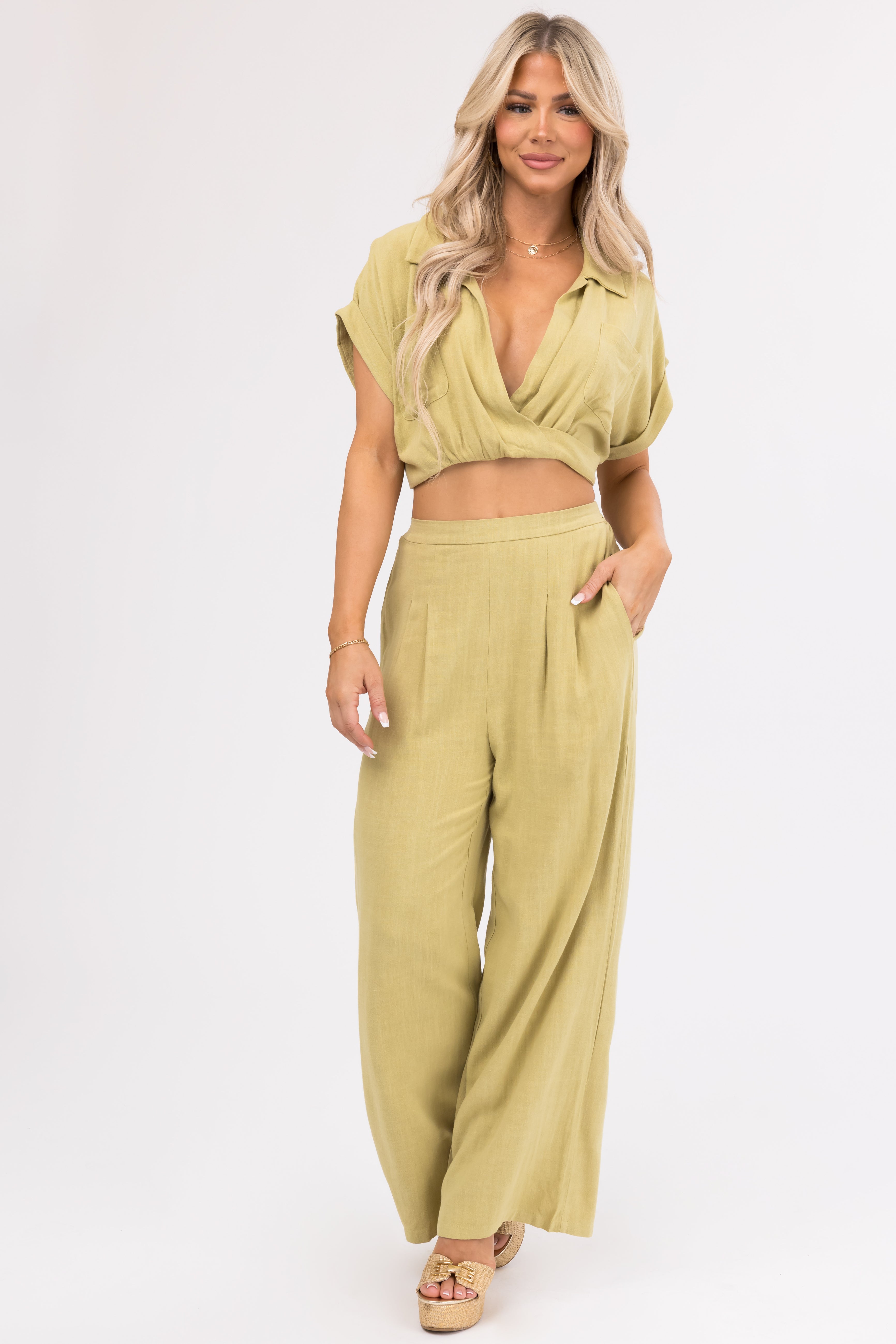 Achieve a sophisticated look with our Key Lime Linen Wide Leg Pants and Crop Top Set. With a collared deep V neck, short banded sleeves, and chic chest pockets, this set offers stylish comfort. The elastic waistband on the top and smocked waistband on the pants ensure a flattering fit. Designed with functional side pockets and made of a non-stretchy woven fabric blend of 70% Rayon and 30% Linen. This set is perfect for casual outings. Machine washable. Available in sizes S, M, and L.
