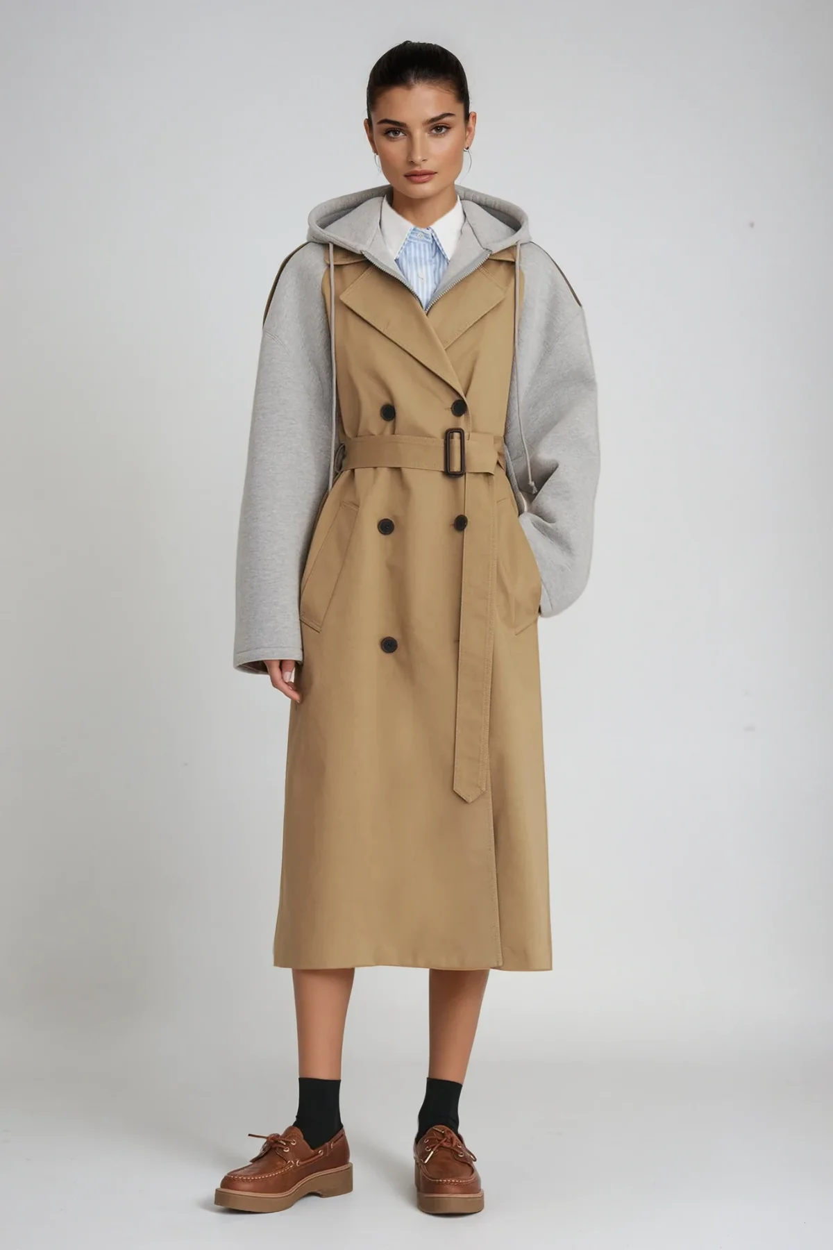 Embrace sophistication with the Khaki Deconstructed Trench Coat Jacket . This innovative outerwear piece combines traditional trench elements with a modern twist for a tailored yet relaxed fit. Crafted from premium materials, it offers durability and refined style, perfect for transitional weather. Balance timeless appeal with a contemporary edge in this versatile statement piece. Color may vary due to lighting. Machine wash gentle, no stretch. Includes 6 product images without a model.