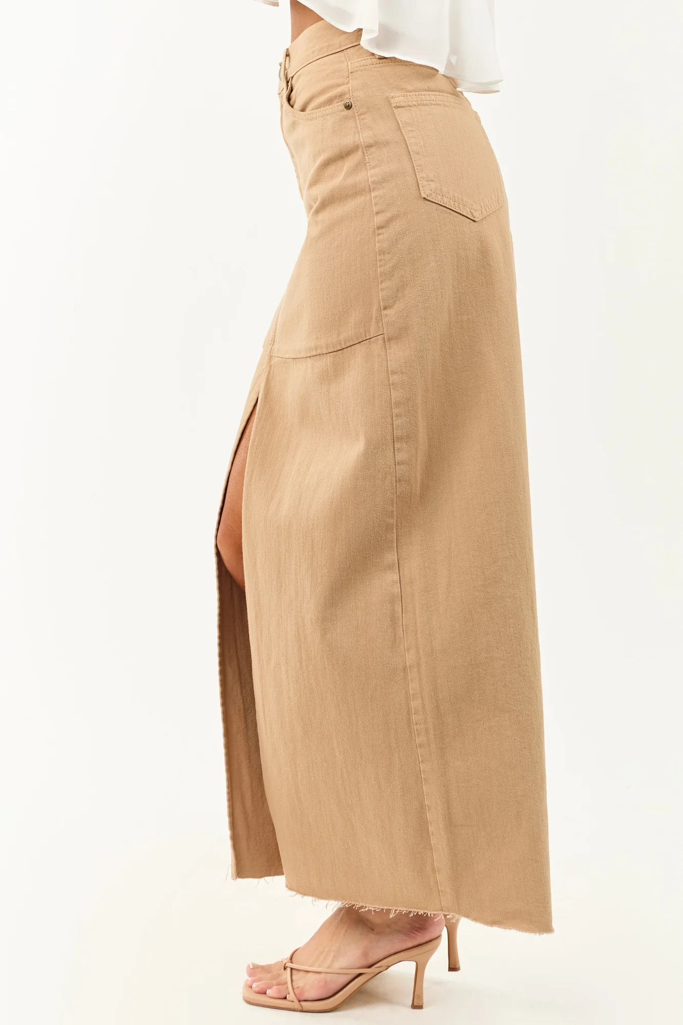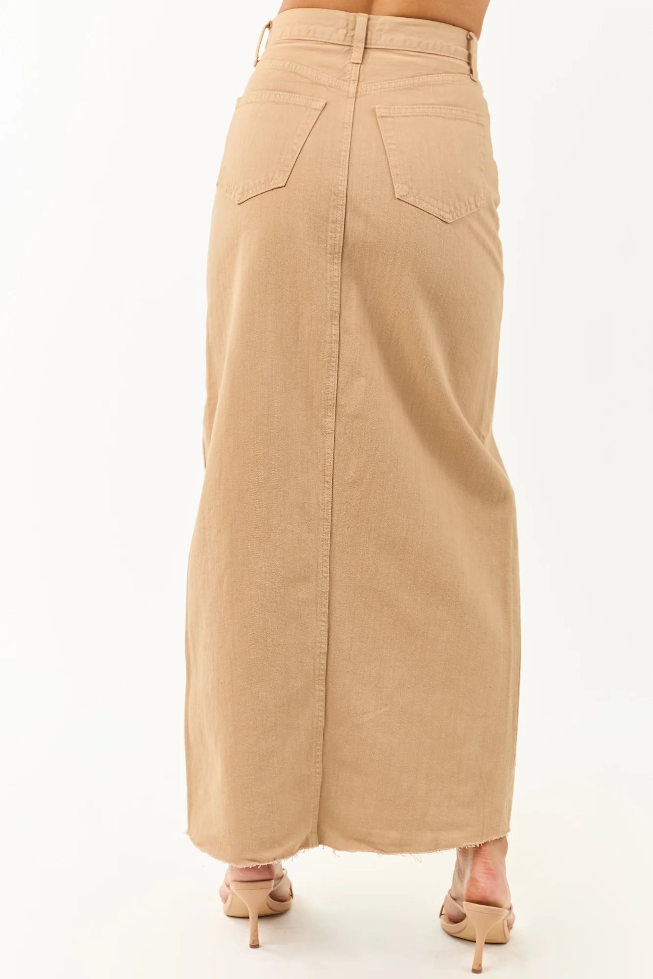 Indulge in classic style with a twist in our khaki denim maxi skirt. Crafted from non-stretchy 100% cotton denim, this skirt features a front slit for added flair and a raw hem for a trendy finish. Cut in a large fit, we recommend sizing down for the perfect look. Complete with 5 pockets, belt loops, a zipper fly, and button closure. Model is wearing size Extra Small. Waist sizes: S 28″, M 29″, L 30″. Length: 41″. Model’s Profile: Size 1, Height 59″, Bust 34″, Waist 26″.