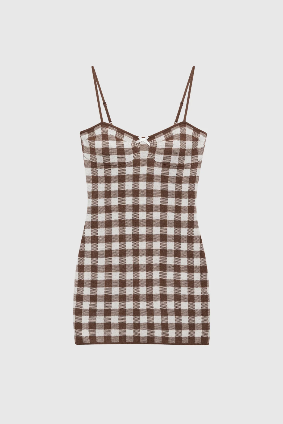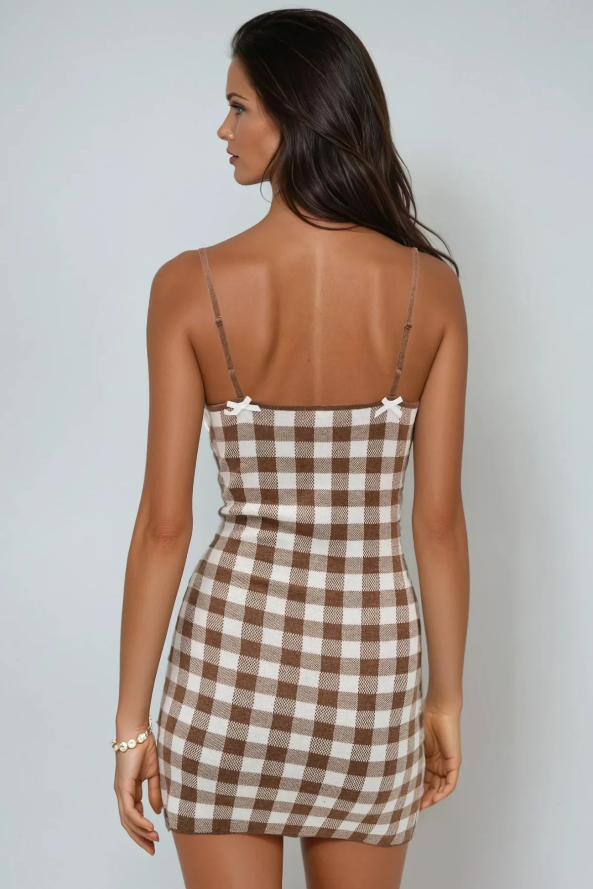 Indulge in the sophistication of the Khaki Grid Pattern Spaghetti Strap Mini Dress . Crafted for a figure-enhancing silhouette, this bodycon dress features delicate spaghetti straps for graceful shoulder contouring and a form-fitting design that highlights your curves effortlessly. Transition from day to night with ease, exuding elegance and style at every step. Expertly made from 50% Polyester and 50% Cotton with a slight stretch for comfort. Care instructions: Machine wash gently. Due to lighting variations, color may vary. Product images (model not included) closely represent the true color.
