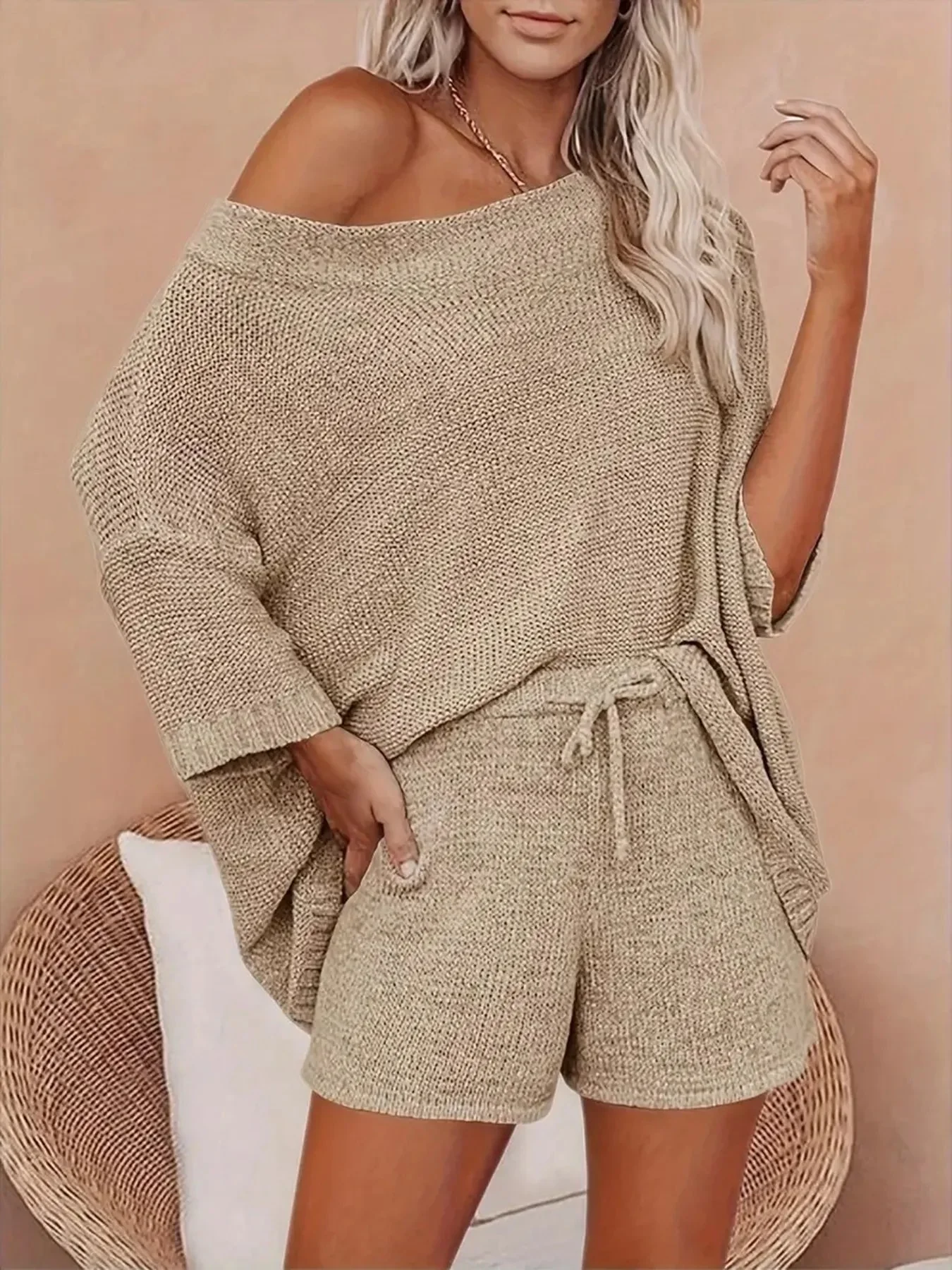 This two-piece sweater set features an oversized boat neck top in khaki color with drawstring shorts. Made of 100% polyester with a slightly stretchy feel, it offers comfort and style. Machine wash cold and tumble dry low for easy care. Imported. Size options available: S, M, L, XL. Measurements: Top Length, Hip, Bust, Sleeve Length, Waist, Bottom Length. Stay trendy and cozy with this stylish set!
