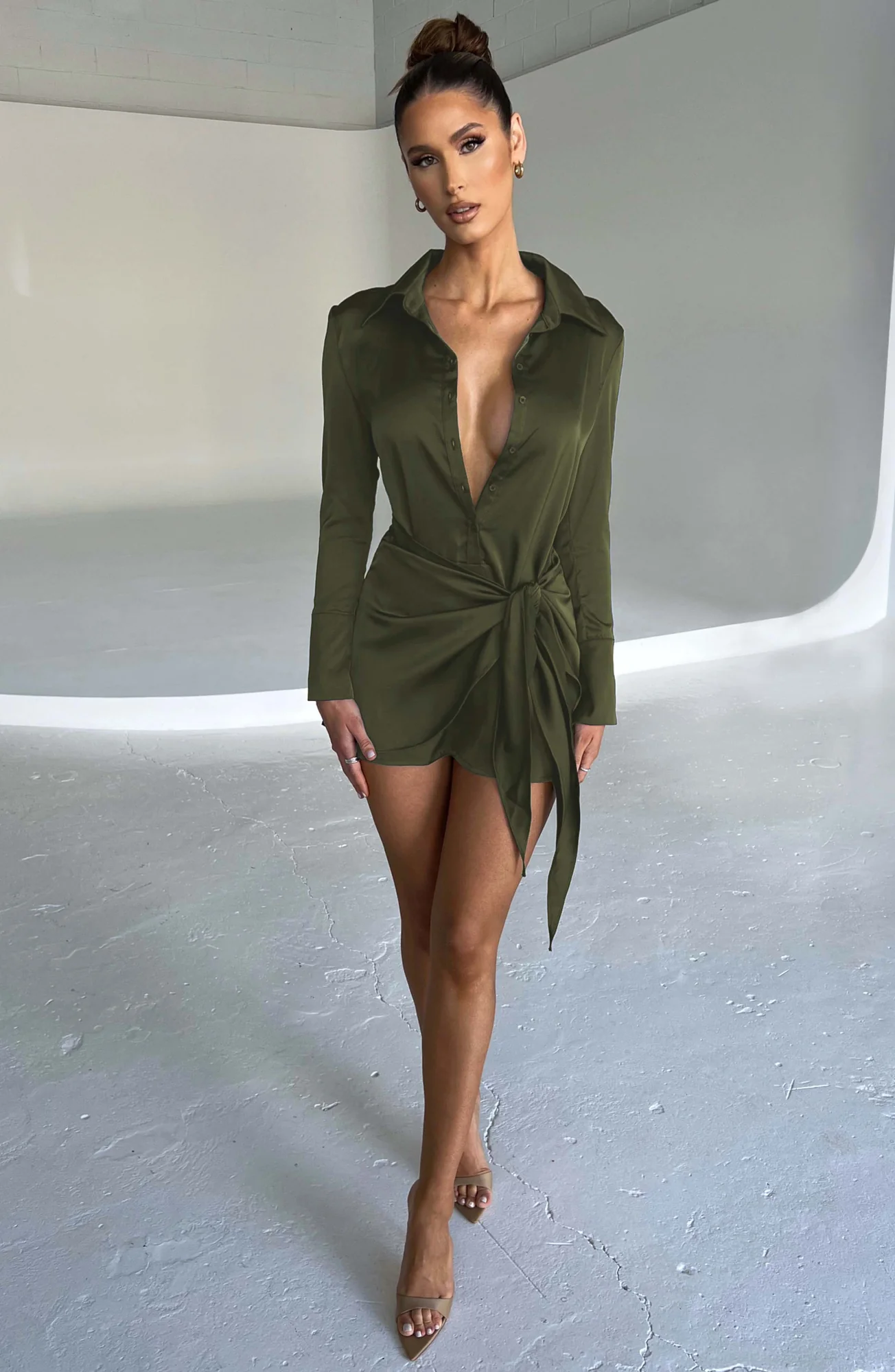 Elevate your party outfit with our Khaki Satin Mini Dress. Crafted from luxurious non-stretch satin, this shirt-style dress drapes elegantly over your body. The front buttons and tie detail add a touch of sophistication. Perfect for daytime events or holidays. Available in sizes M, XL, XS, S, XXL, and L.