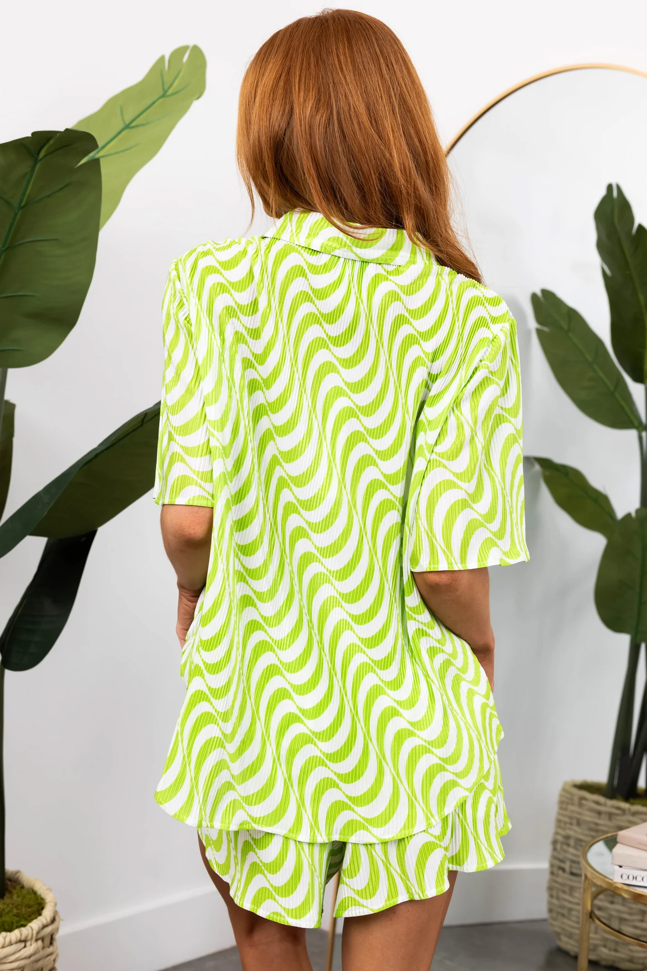 Express yourself with this stunning Kiwi and Ivory Wavy Plisse Top + Sky. Made from semi-stretchy satin plisse, this collared shirt features half sleeves with lettuce trim, a longline design, and a round hemline. Pair it with matching shorts for a coordinated look. Stay comfortable and chic all day long in this unlined, imported top crafted from 100% Polyester. Care instructions: Hand wash cold, colors may bleed, do not bleach, hang to dry. Model is wearing a size Small. For a fashionable outfit that fits true to size and adds a touch of sophistication to your wardrobe, choose this trendy top.