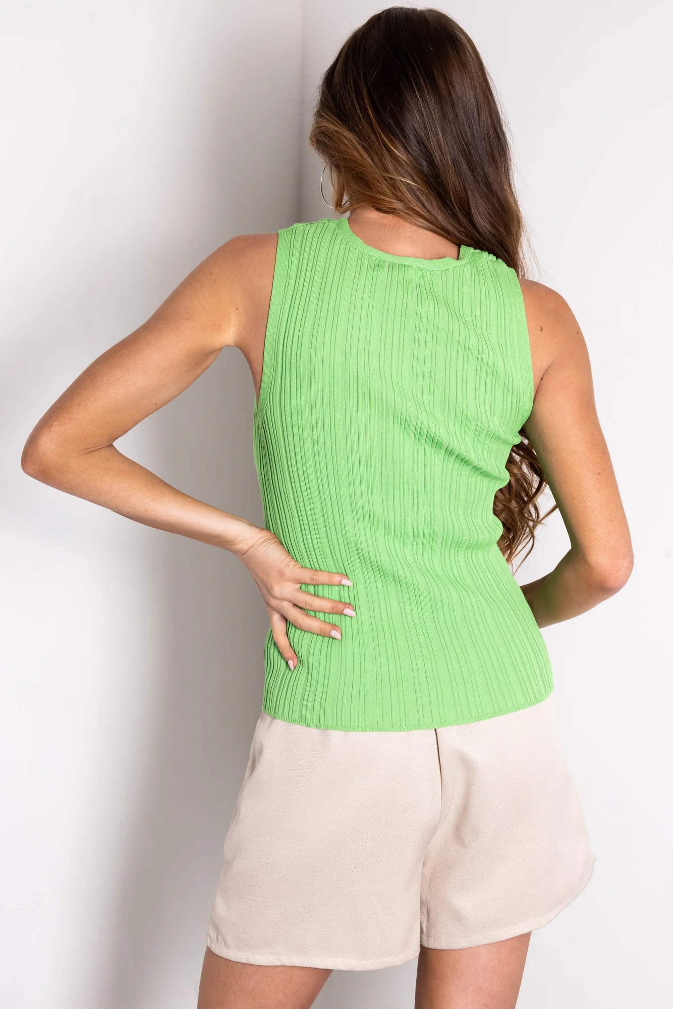 Stay stylish and comfortable with our Kiwi Ribbed Knit Fitted Tank Top in sizes S, M, and L. Crafted from 89% Viscose and 11% Nylon, this sleeveless top features a V-neck design, super stretchy thick ribbed knit, and a length of 23-23.5 inches. Perfect for casual occasions in spring and summer. Hand wash cold and lay flat to dry for best care.