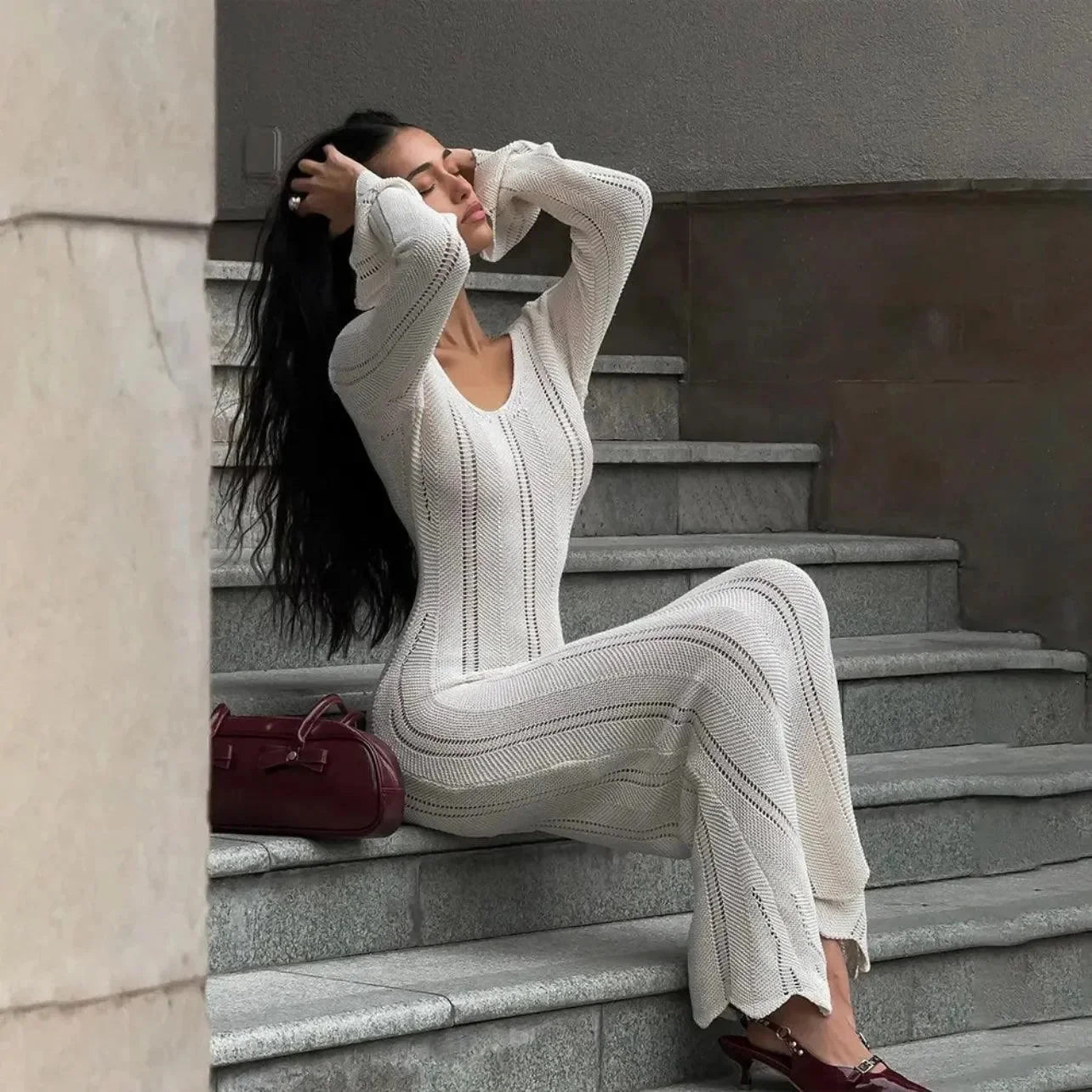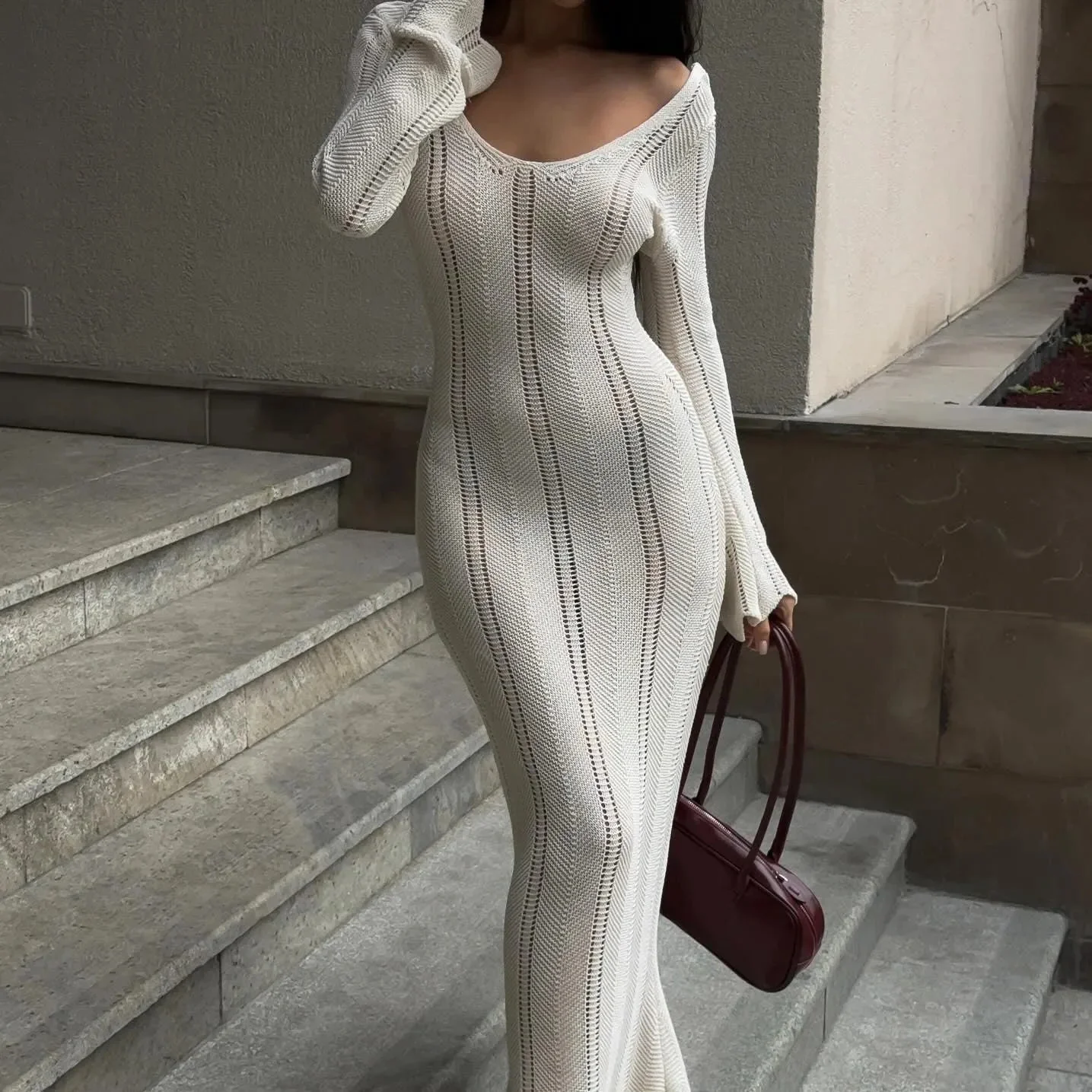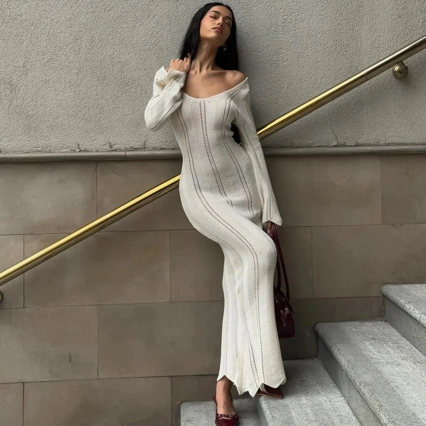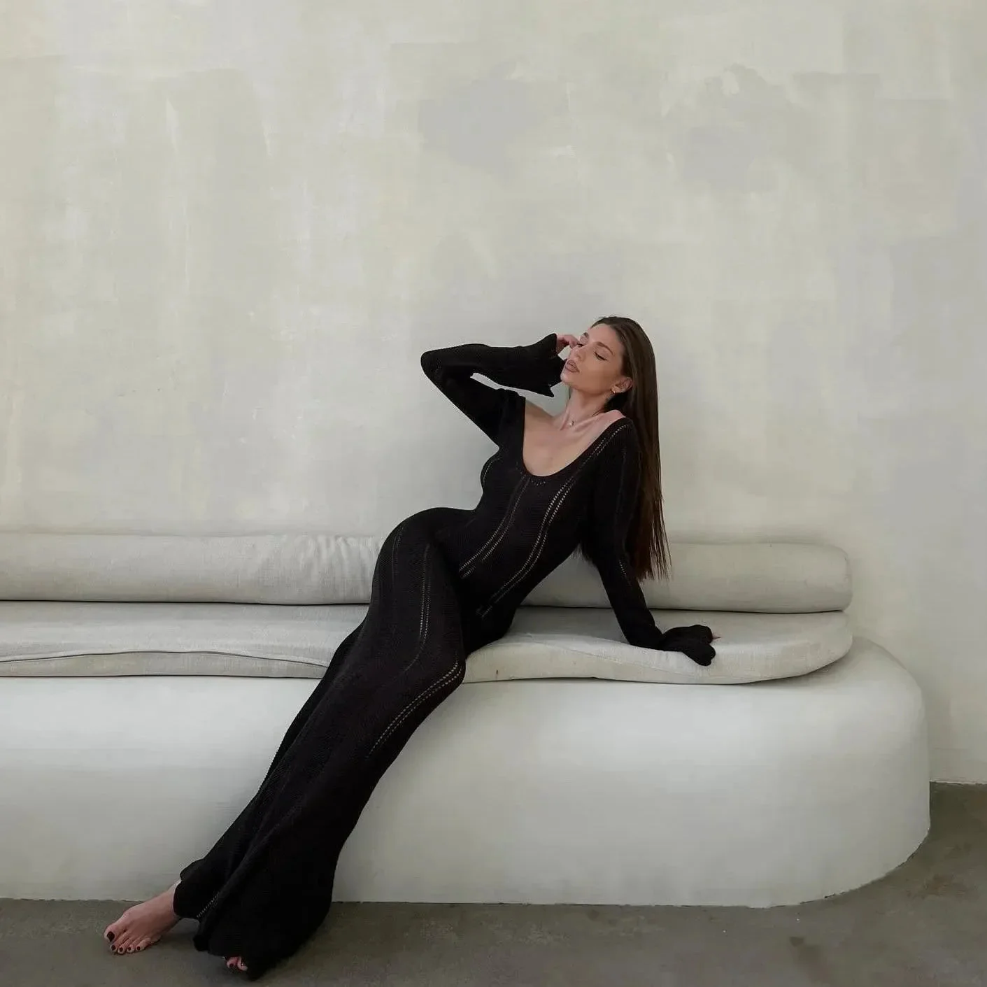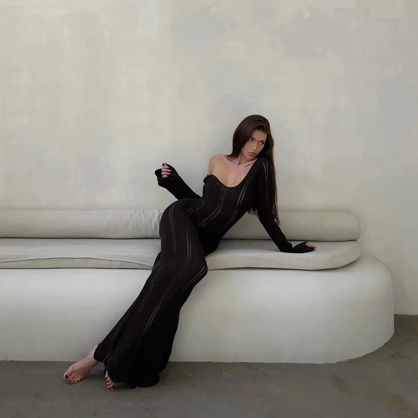 Elevate your style with our Long Sleeved Maxi Dress. This knitted dress offers a blend of style and comfort, featuring an elegant design, flattering fit, and soft, high-quality fabric. Perfect for any occasion, the dress can be dressed up or down effortlessly. Its sophisticated long sleeves and floor-length skirt exude elegance and versatility. Embrace unmatched comfort and style. Shop the Long Sleeved Maxi Dress today and make a statement at every event! Discover more outfit inspirations on Instagram @mermaid_way. FEATURES: knitted construction, open knit, semi-sheer design, raw-cut edges and hems, unlined. MATERIAL: 64% cotton, 36% Nylon. Enjoy complimentary exchanges for size mismatches.