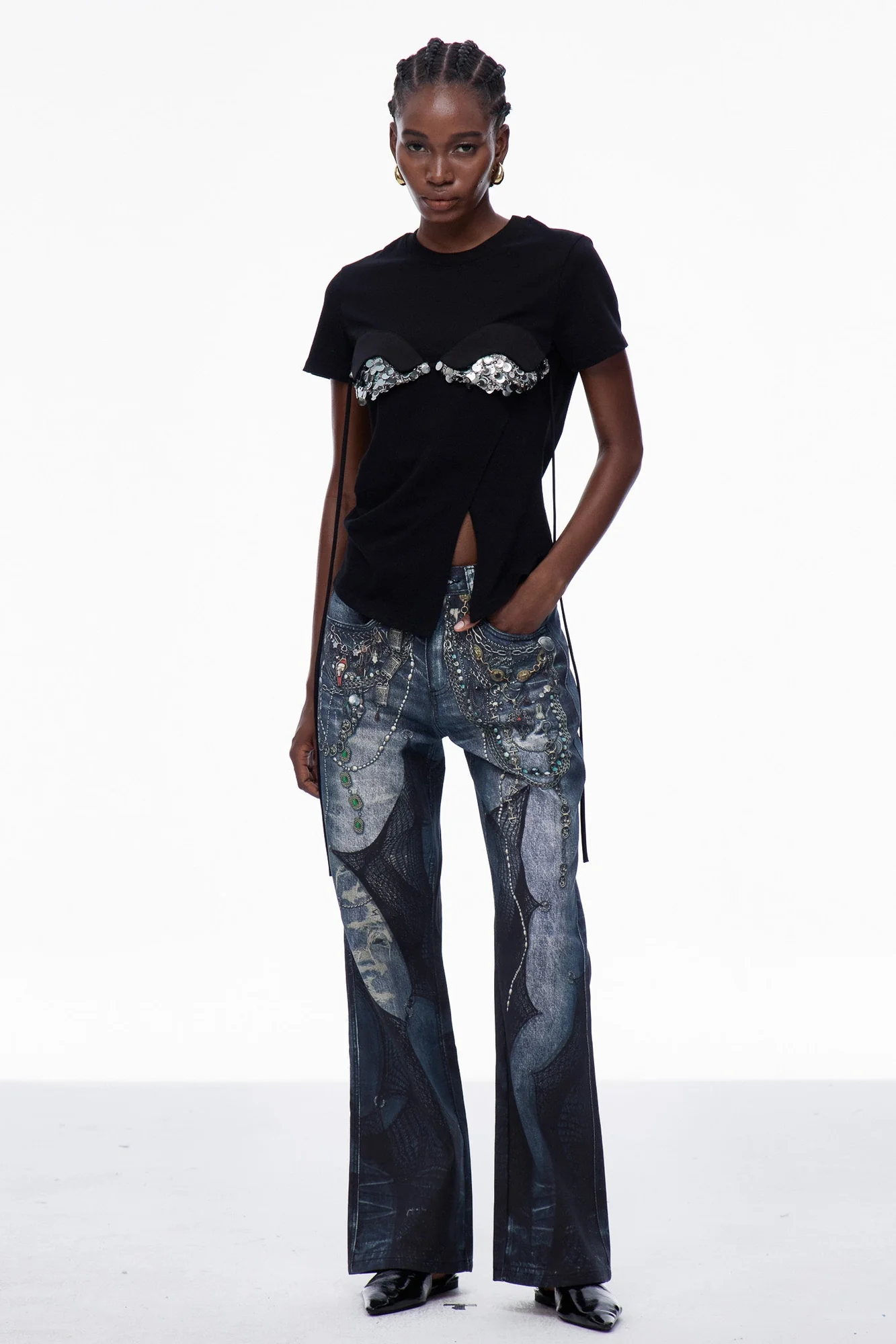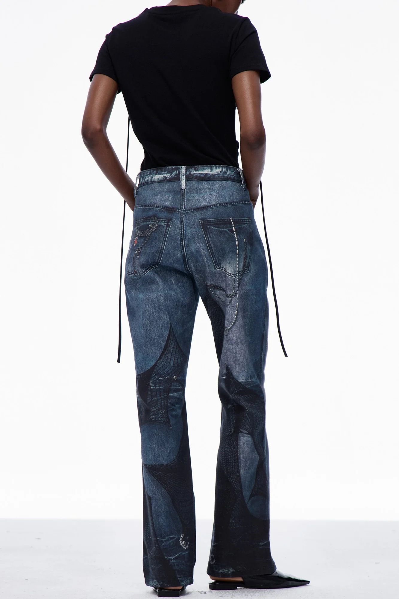 Elevate your wardrobe with the Lace Chain Print Denim Jeans, expertly crafted to combine classic denim durability with a distinctive lace and chain motif. These jeans offer a unique blend of edgy style and refined detail, perfect for those seeking a statement piece without compromising on comfort. Designed for versatility, they pair effortlessly with both casual and dressier looks, making them a sophisticated addition to any fashion-forward collection. The non-stretch fabric ensures a reliable fit. These jeans are best cared for with a gentle machine wash. Please note that color may vary due to lighting effects on images, enhancing their individual appeal and uniqueness.