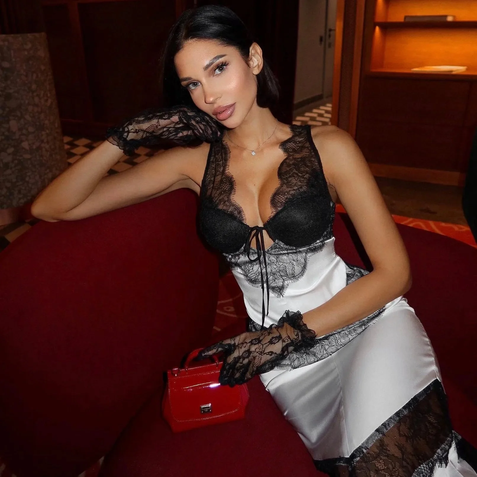 Embrace romance and allure with the Lace Cutout Satin Maxi Dress in Black & White. This timeless piece features a lustrous satin finish complemented by delicate lace trims, blending vintage elegance with modern charm. Enjoy gentle support from unpadded underwire cups and a flirty front tie closure. The hidden back zipper ensures a seamless fit, while the fully lined design offers comfort and sophistication. Perfect for candlelit evenings and special occasions, this maxi dress will make every moment unforgettable. Made of 98% polyester and 2% elastane. Don’t miss out on style inspiration – follow us on Instagram @mermaid_way. Size exchange available if needed.