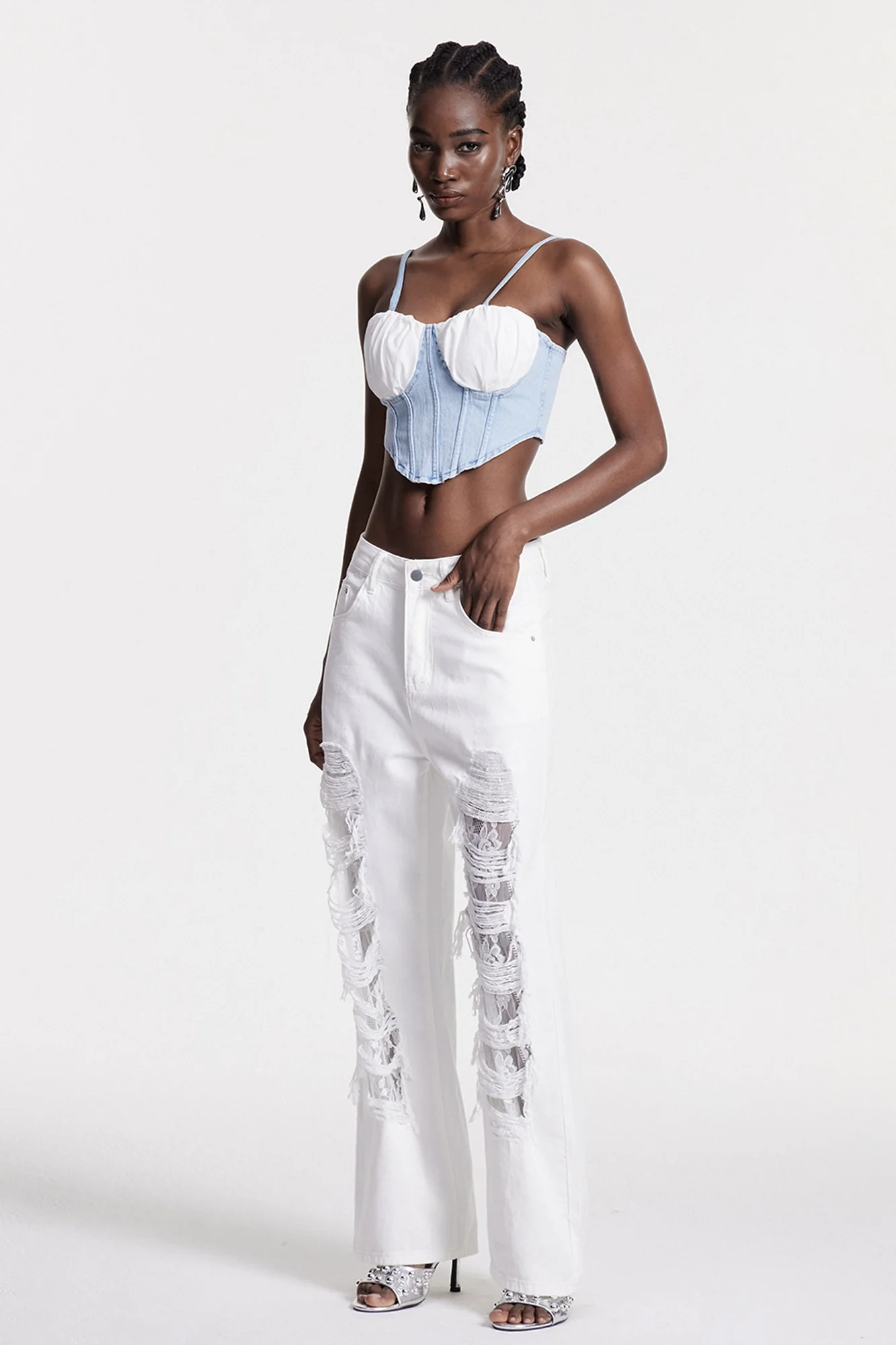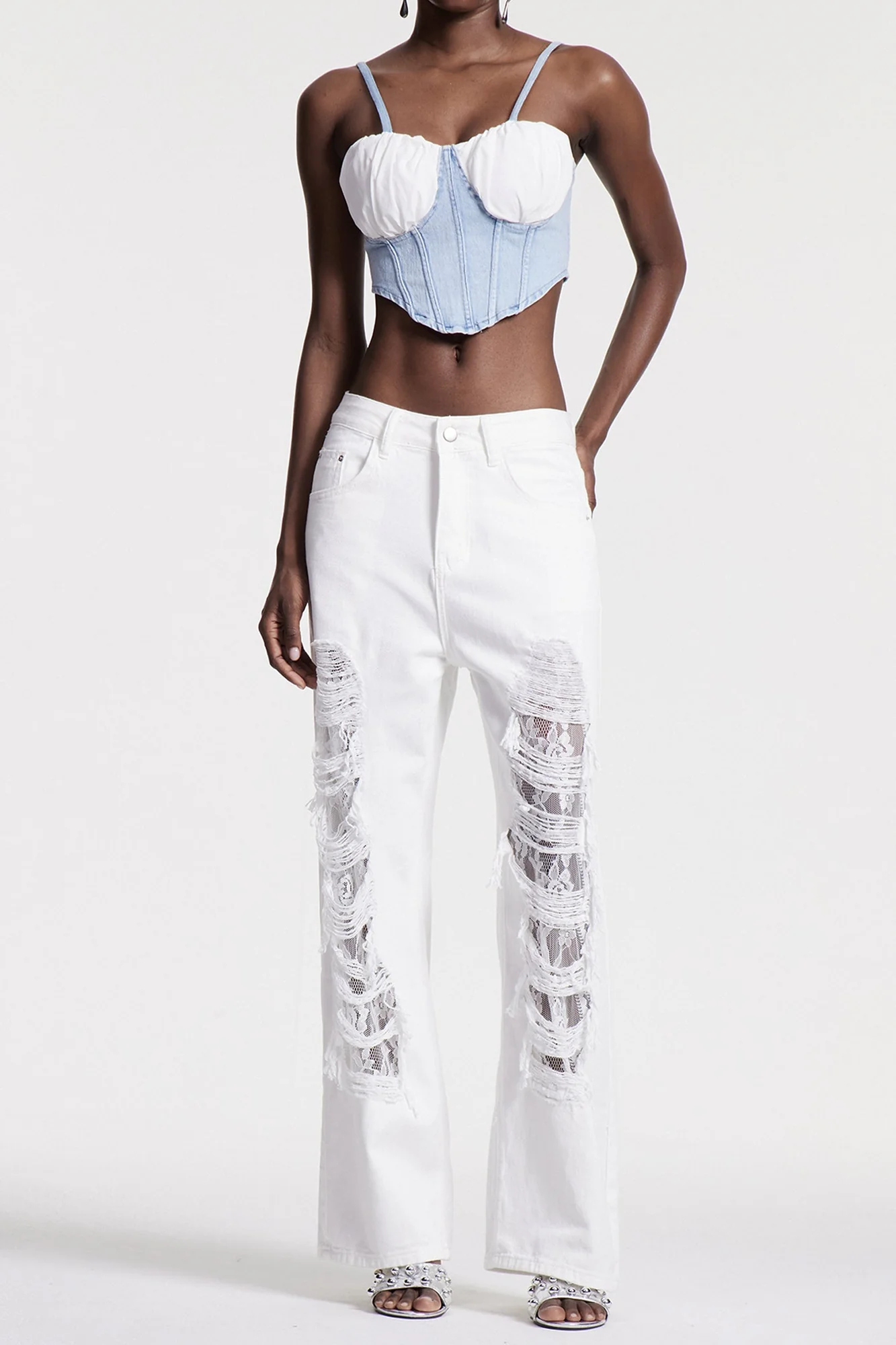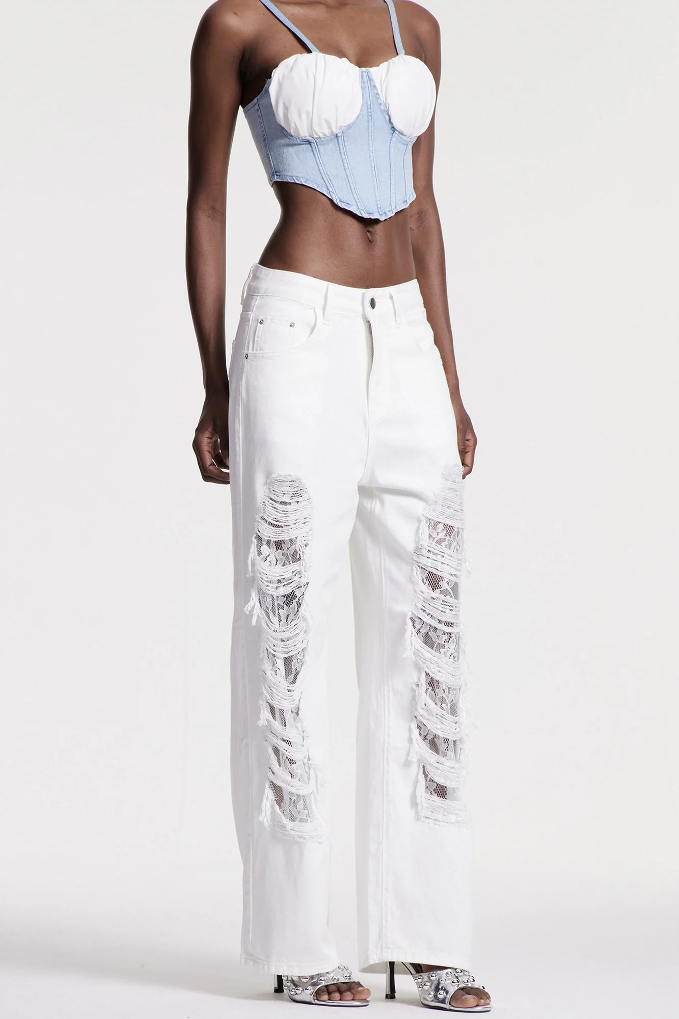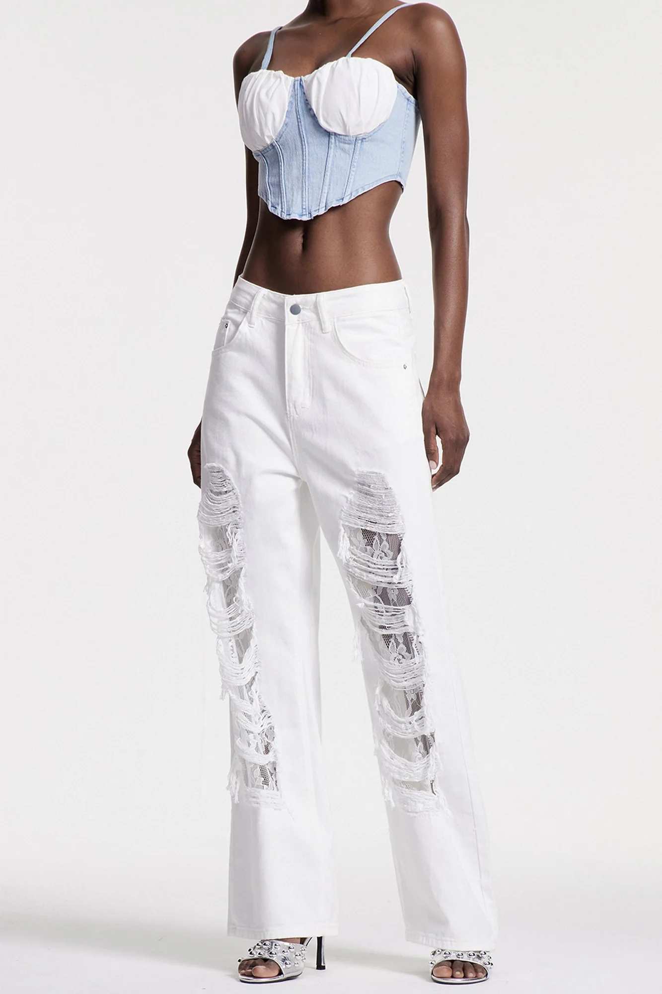 Explore the perfect blend of edgy distressing and delicate lace embellishments with our Lace Detail Distressed Jeans. Crafted from high-quality denim for durability and comfort, these jeans feature strategic rips for a stylish worn-in appearance. The intricate lace inserts elevate your ensemble, making them suitable for various occasions from casual to formal. Ideal for those who seek distinctive style and expertly designed apparel. Embrace a unique fashion statement today! Color variations may occur due to image lighting. Machine wash gentle cycle for easy care and maintenance.