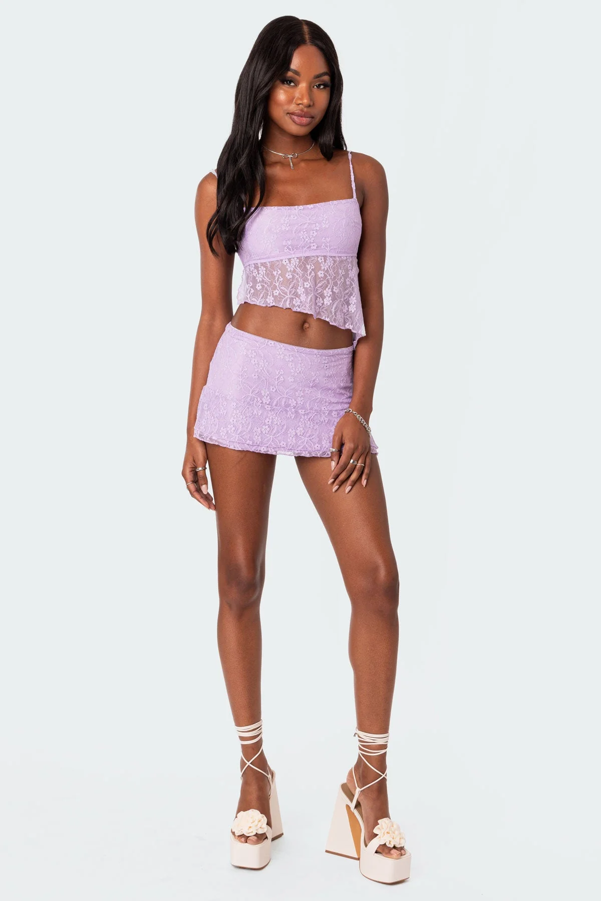 Indulge in elegance with our Lilac Lace Open Back Tank Top – the epitome of style, softness, and sophistication. Featuring a charming open back design, adjustable straps, an alluring underlined bust, and a flattering asymmetric hem, this tank top is crafted from sheer lace fabric for an enchanting allure. Look stunning effortlessly in this versatile piece that pairs perfectly with a matching set. Care for this blend of polyester and cotton by machine washing at a gentle 30ºC, avoiding bleaching and tumble drying, while ironing at a maximum of 110ºC. Elevate your wardrobe and exude confidence with our exquisite tank top!